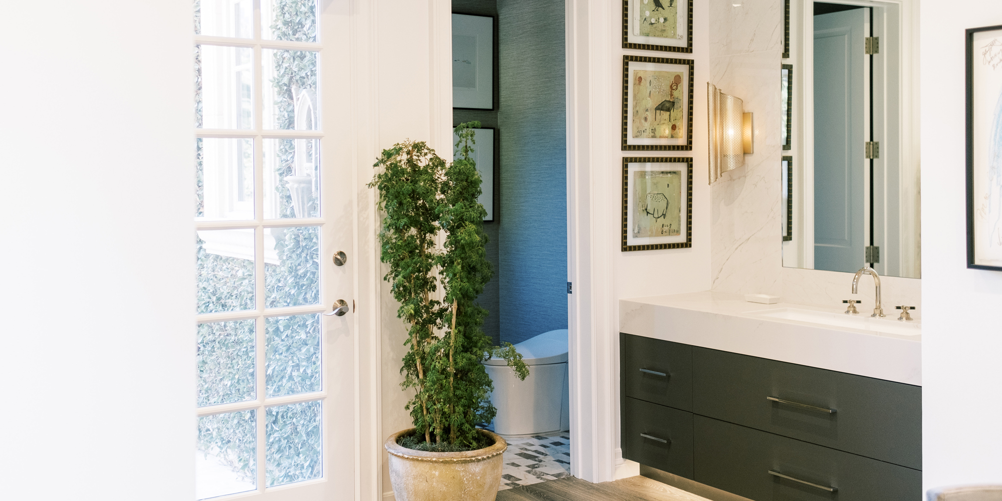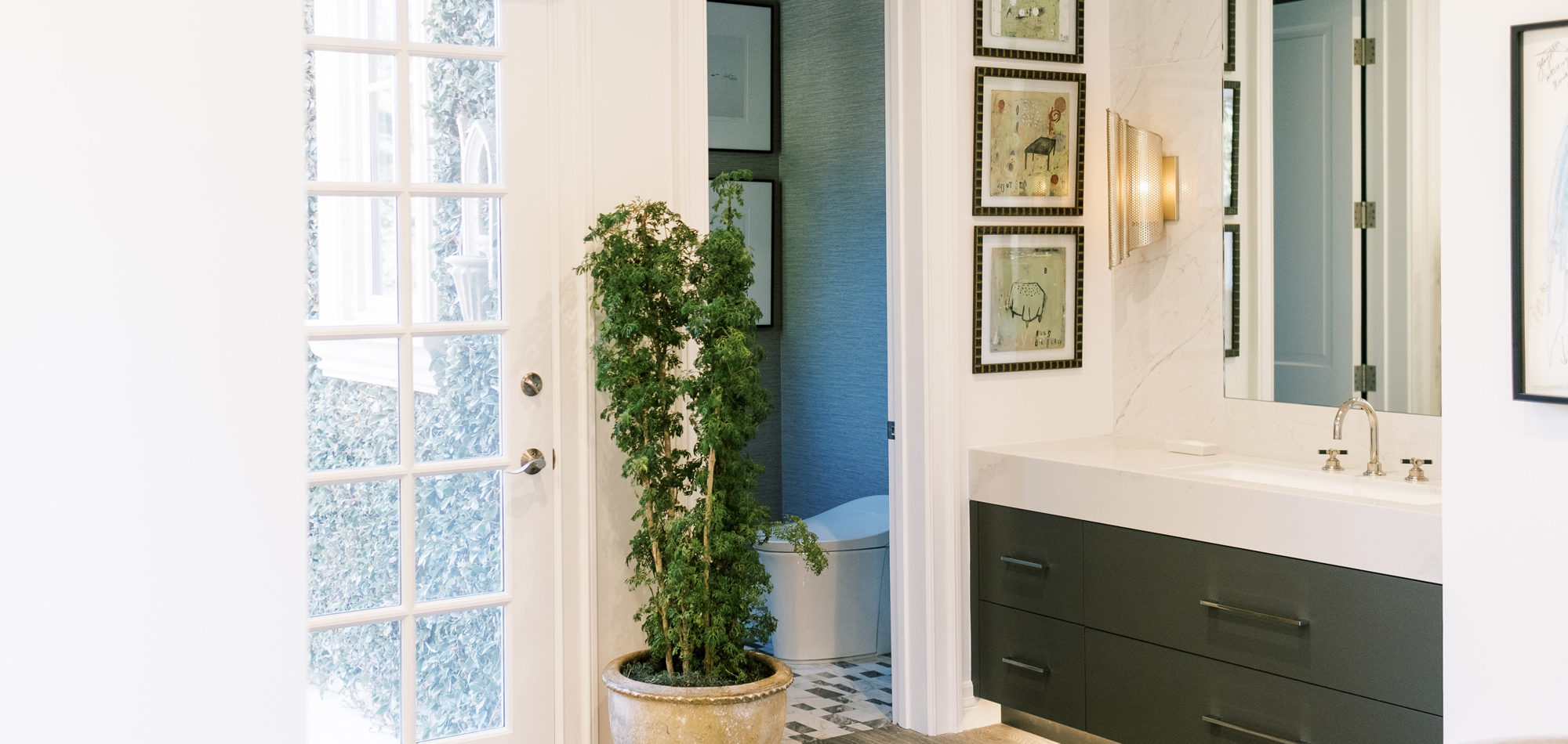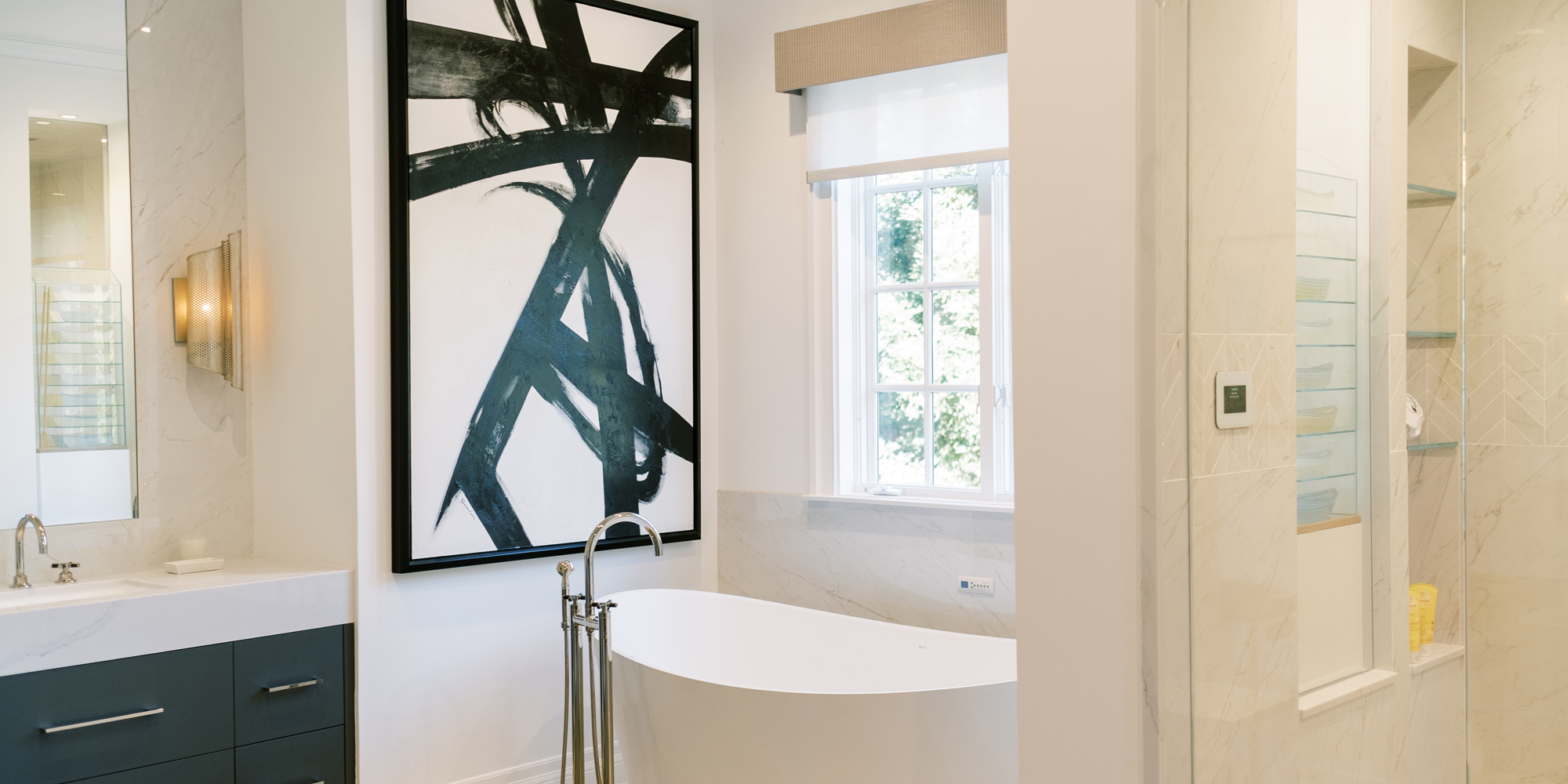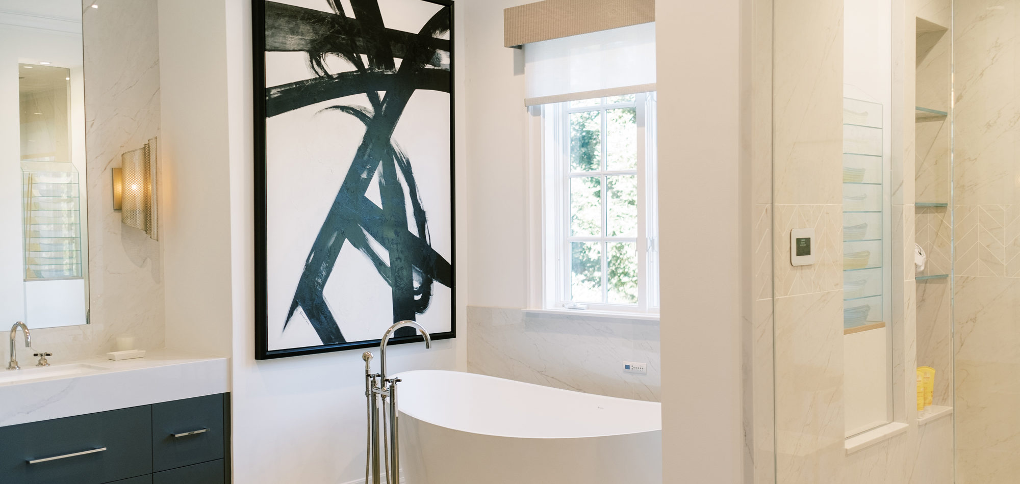 A stunning Bain Ultra tub set the stage for this personalized bathroom. The client’s fabulous art and sculpture added individuality to the room. Luxury finishes were chosen from the Pirch Showroom, stunning lighting choices from Currey and Company.