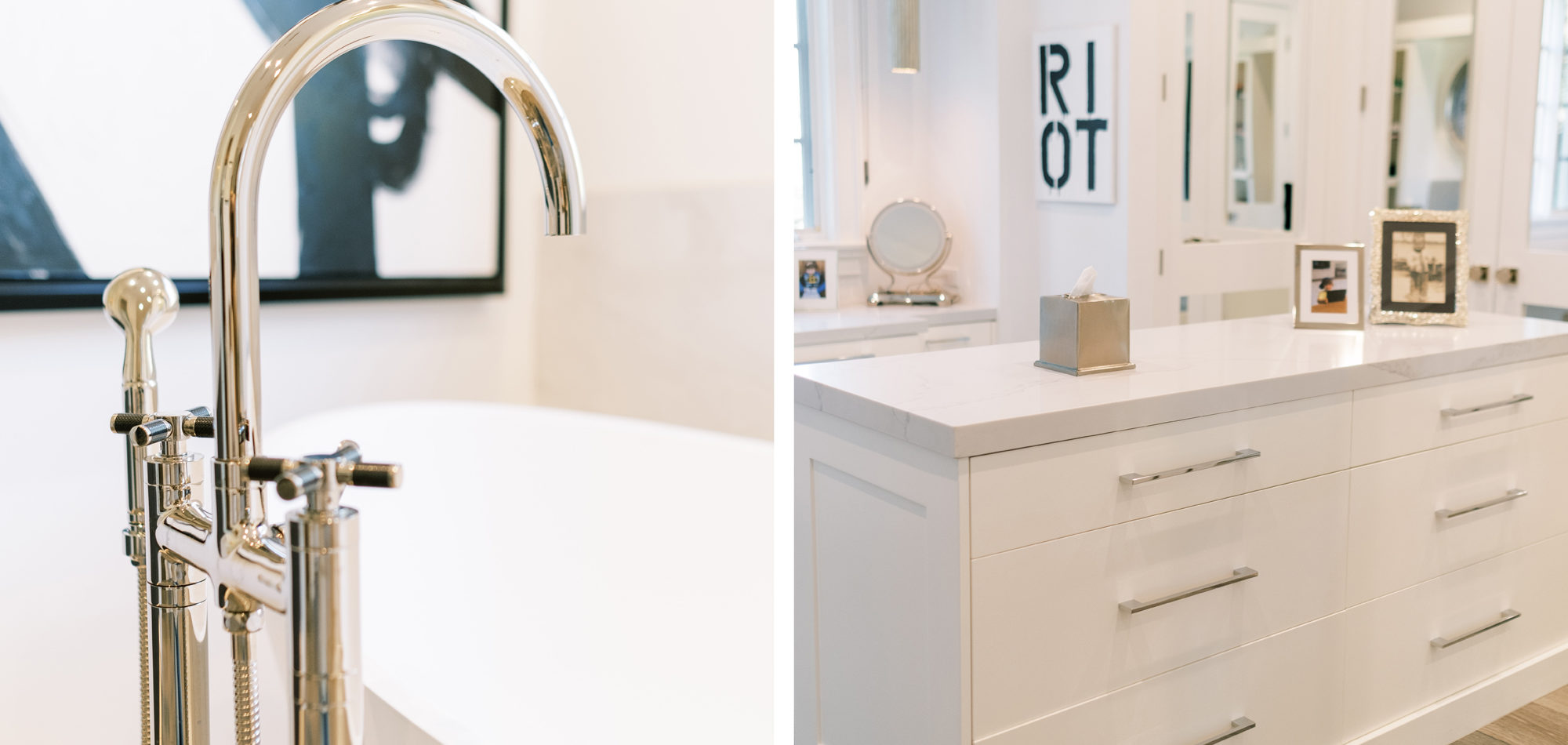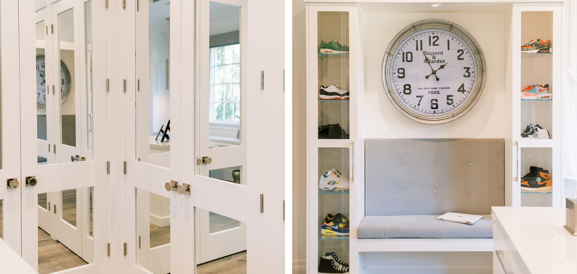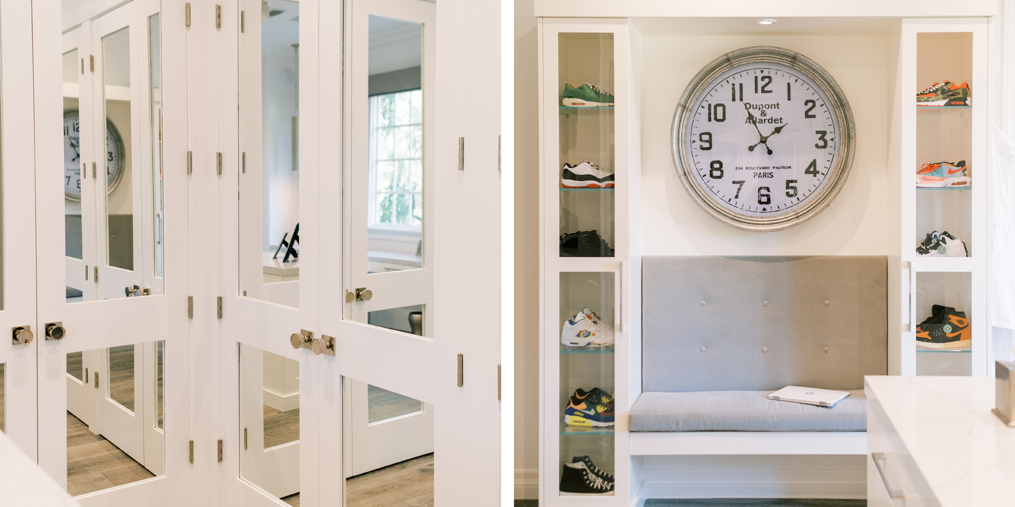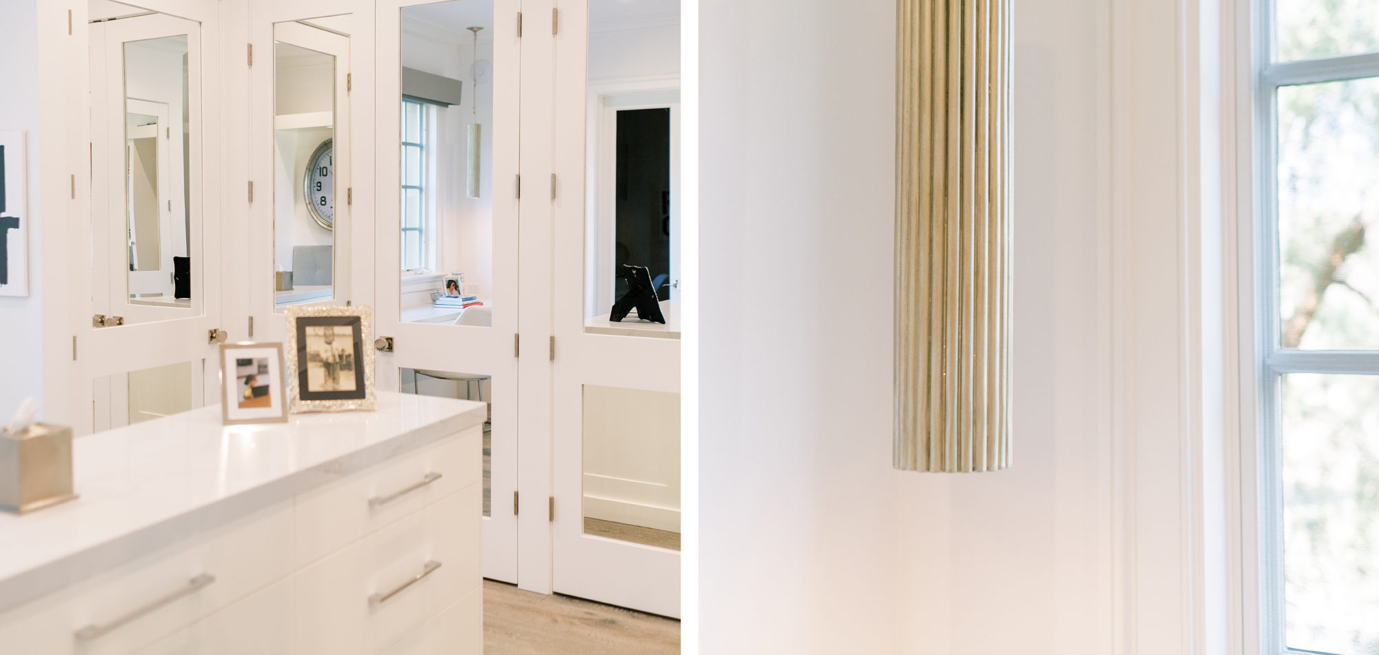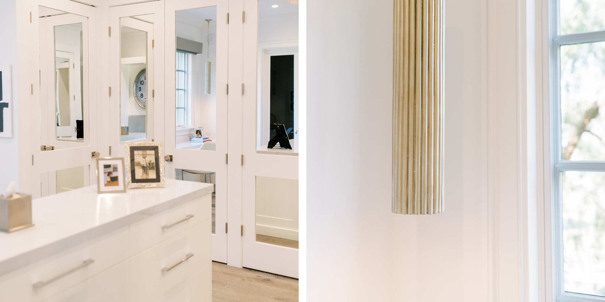 Some of the key features to our client, who cares a lot about functionality, were two separate vanities, all white with dramatic accents, an area for make-up, and a shoe cabinet. He is an avid art collector so arranging his existing art and items in the space was important to him.