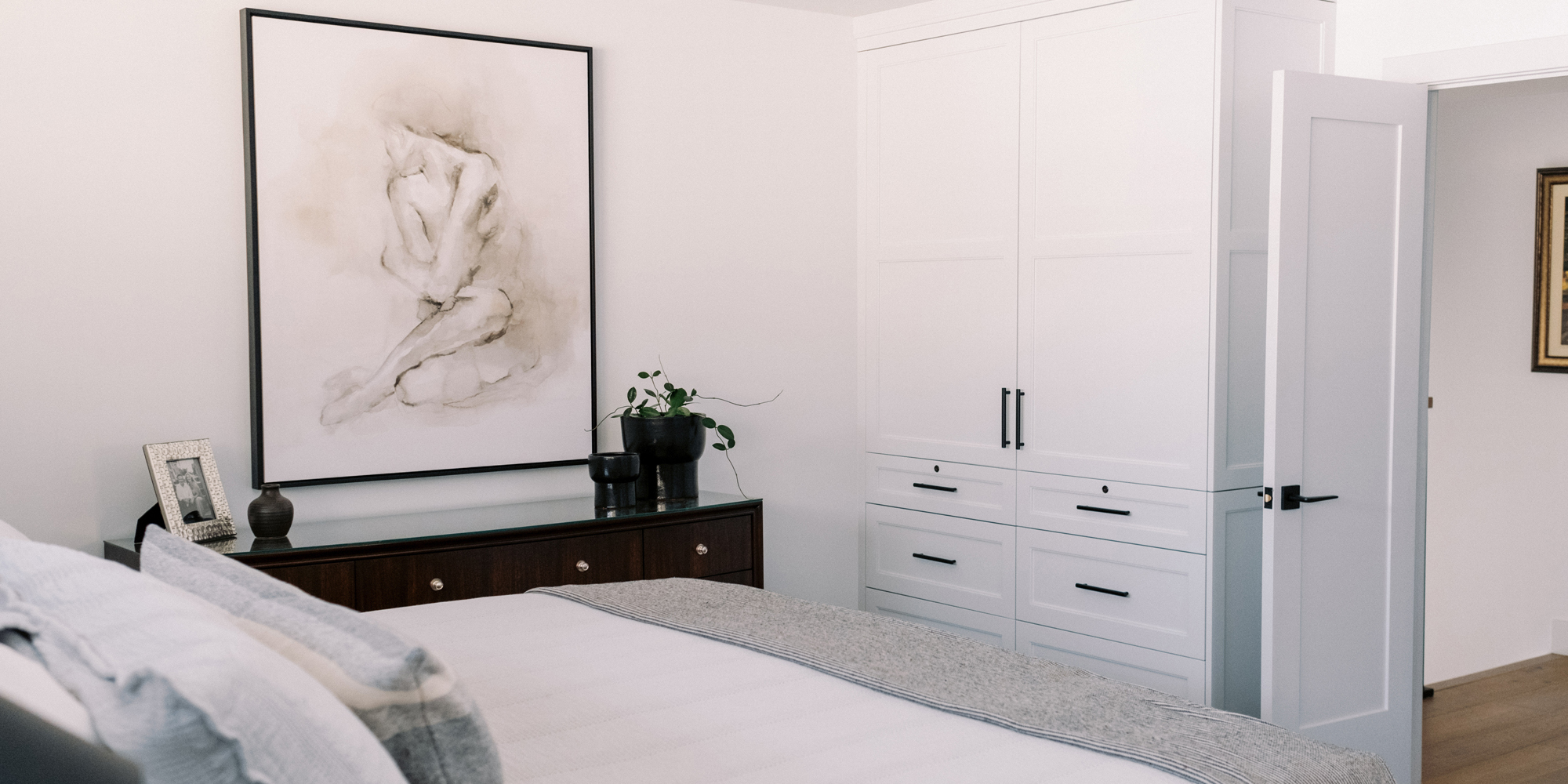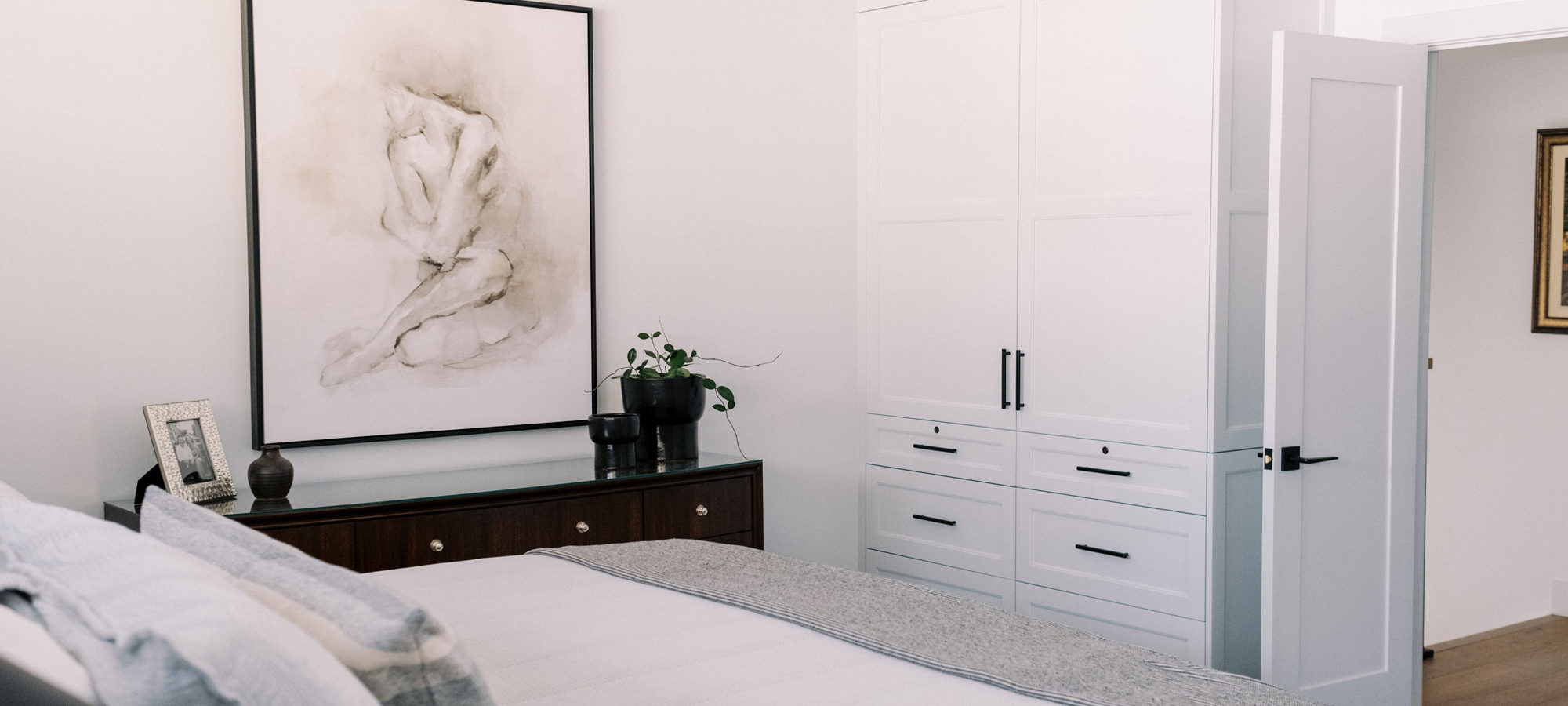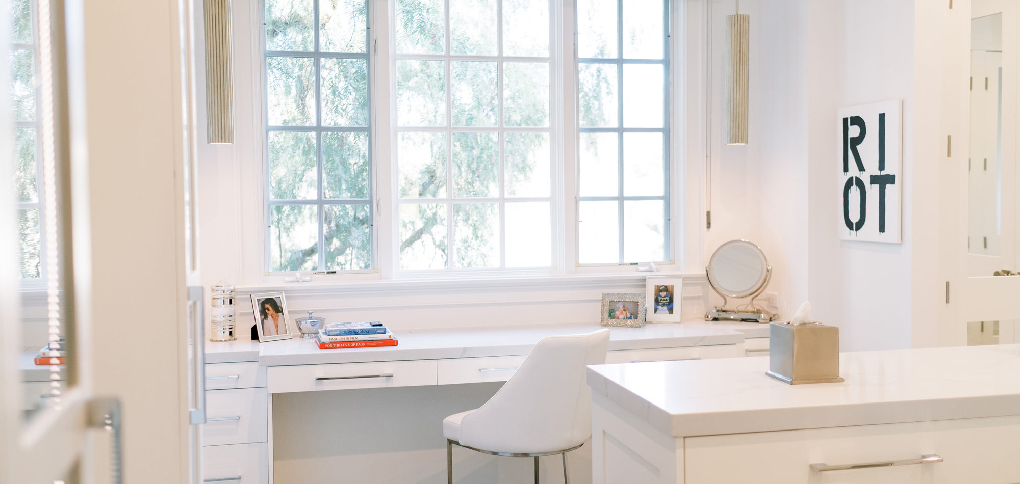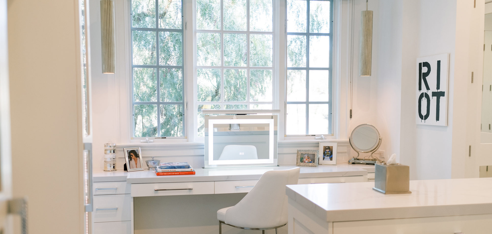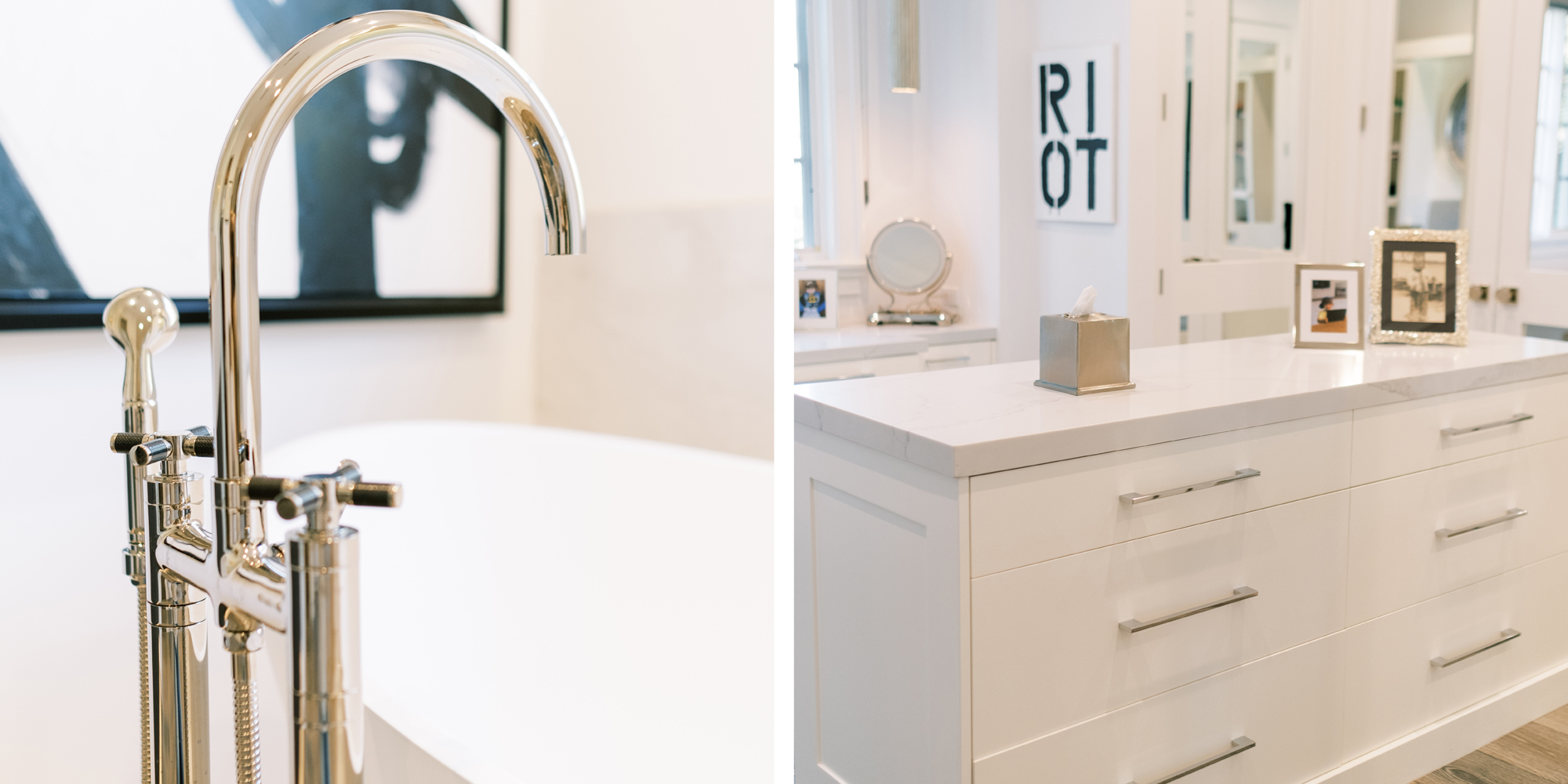 Some of the key features to our client, who cares a lot about functionality, were two separate vanities, all white with dramatic accents, an area for make-up, and a shoe cabinet. He is an avid art collector so arranging his existing art and items in the space was important to him.