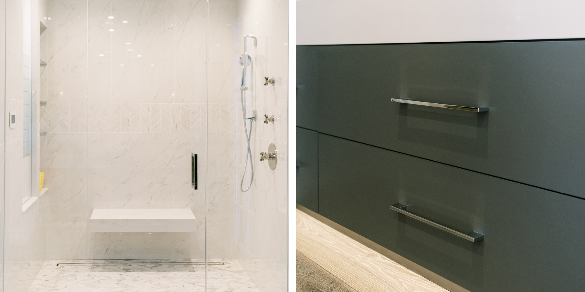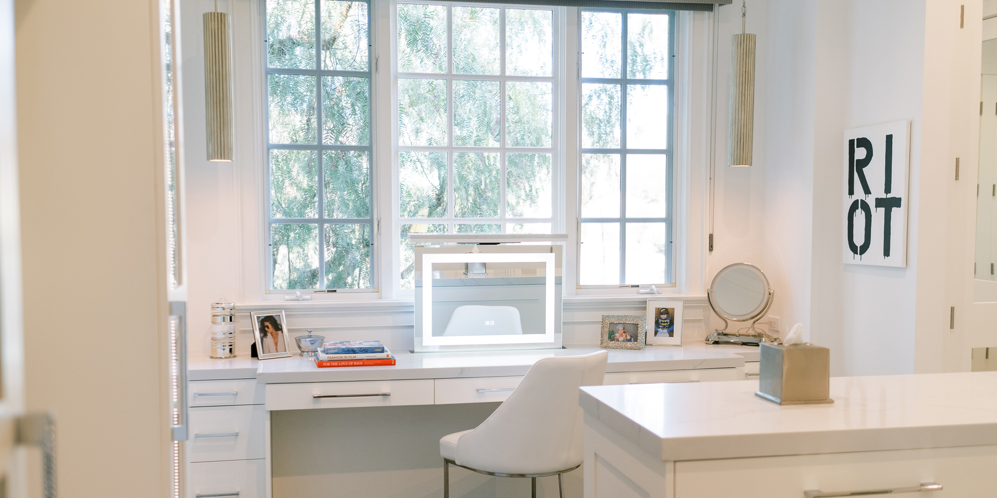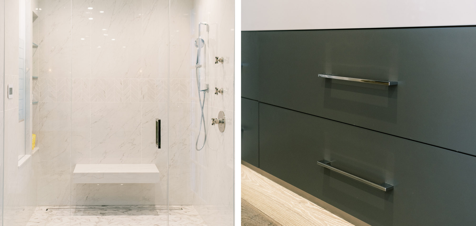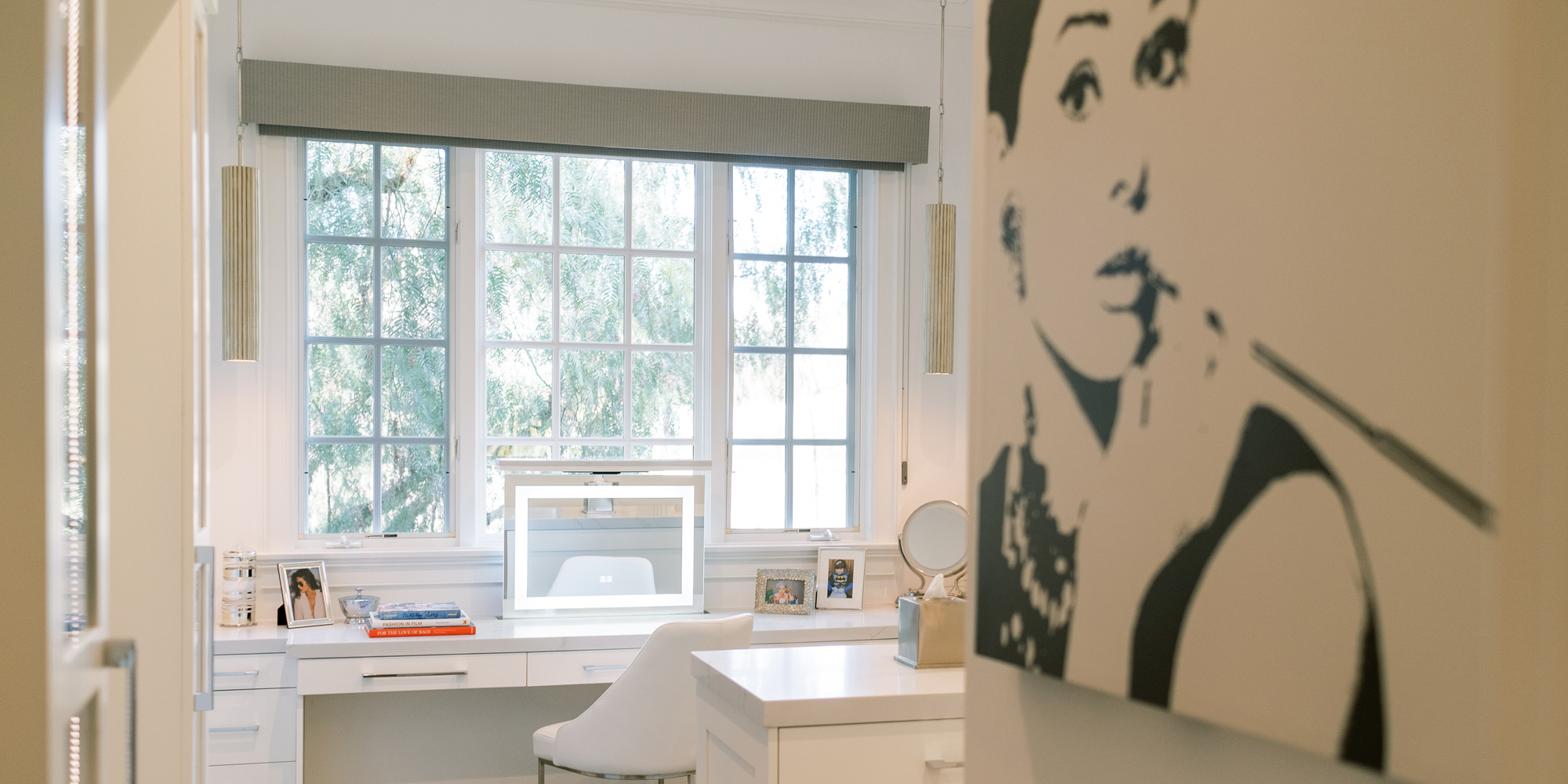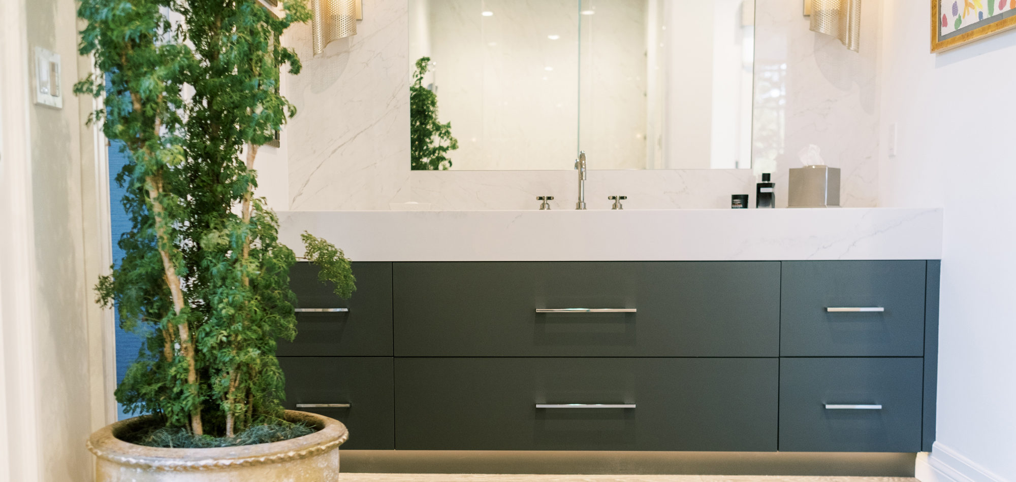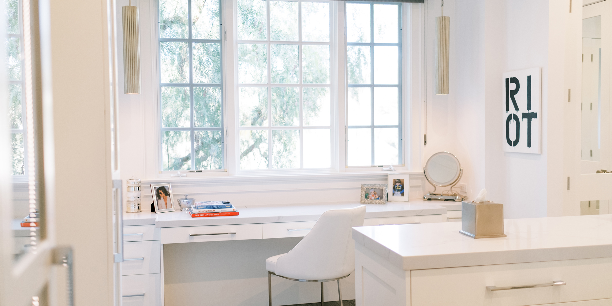 Some of the key features to our client, who cares a lot about functionality, were two separate vanities, all white with dramatic accents, an area for make-up, and a shoe cabinet. He is an avid art collector so arranging his existing art and items in the space was important to him.