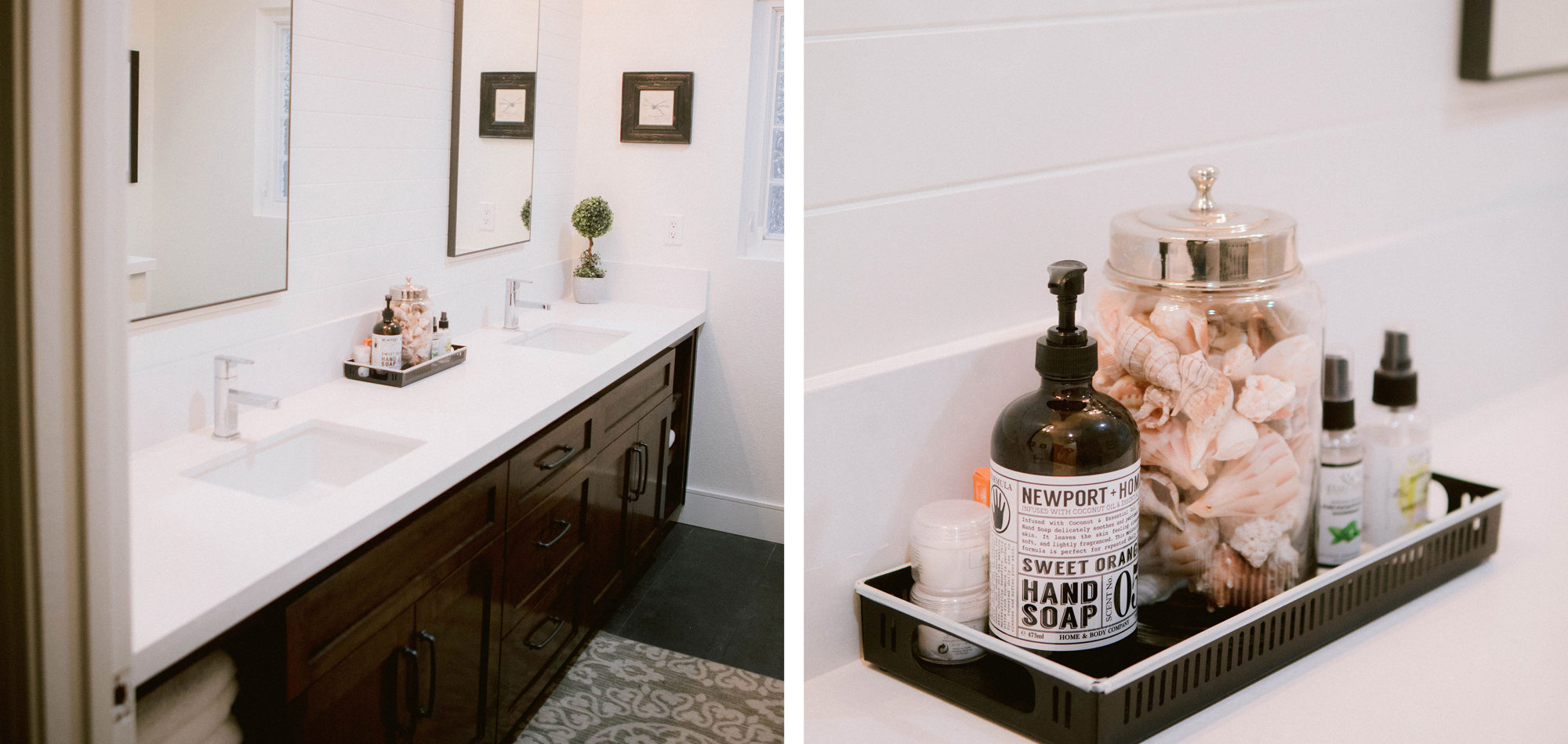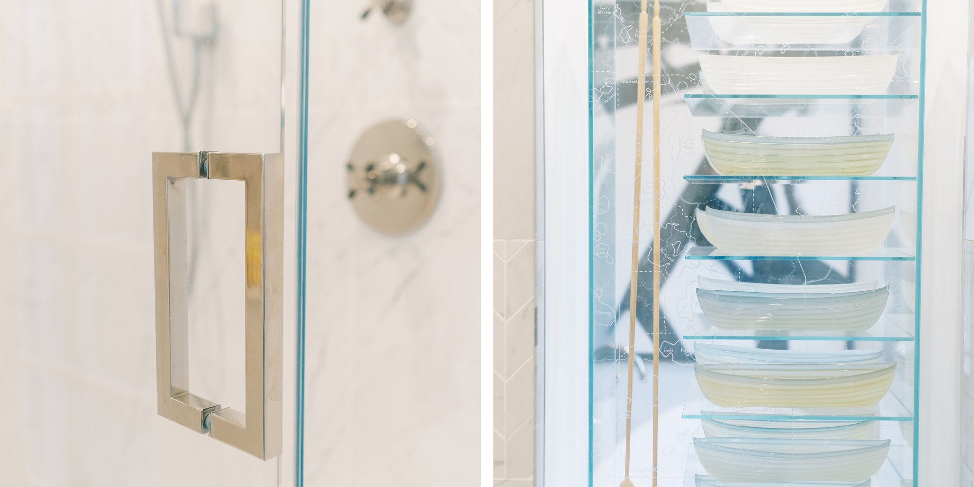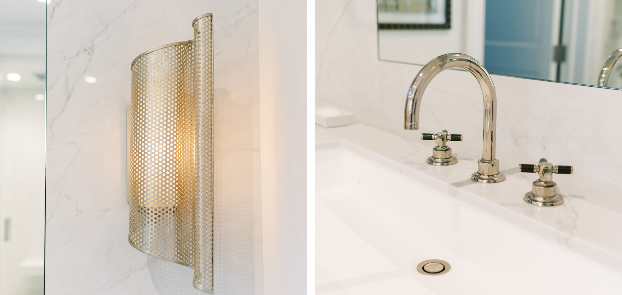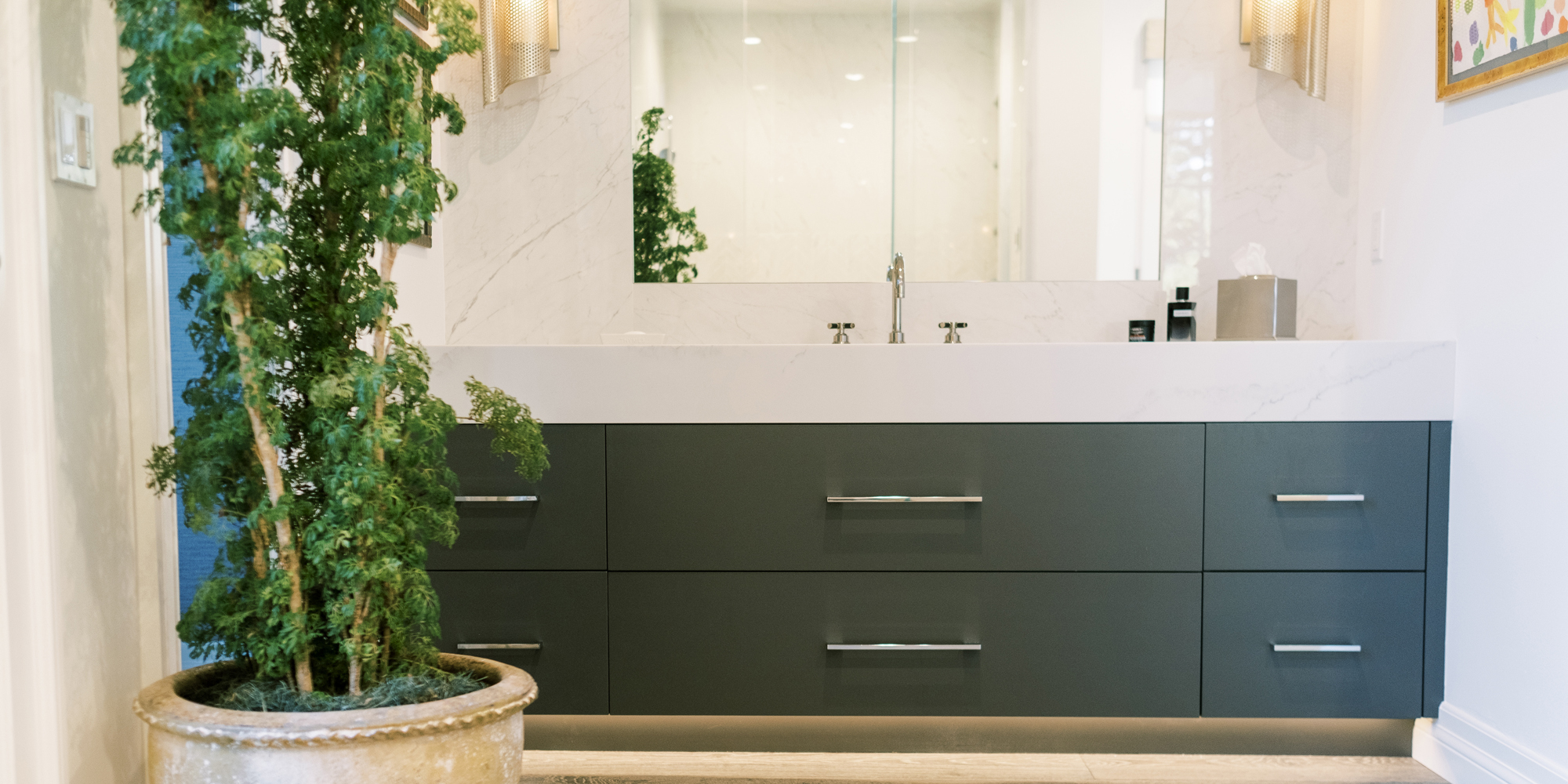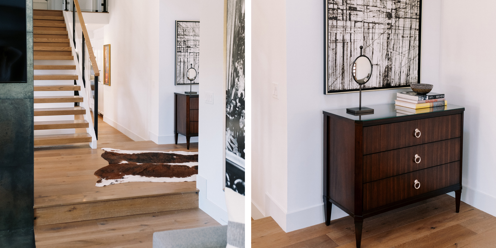 Some of the key features to our client, who cares a lot about functionality, were two separate vanities, all white with dramatic accents, an area for make-up, and a shoe cabinet. He is an avid art collector so arranging his existing art and items in the space was important to him.