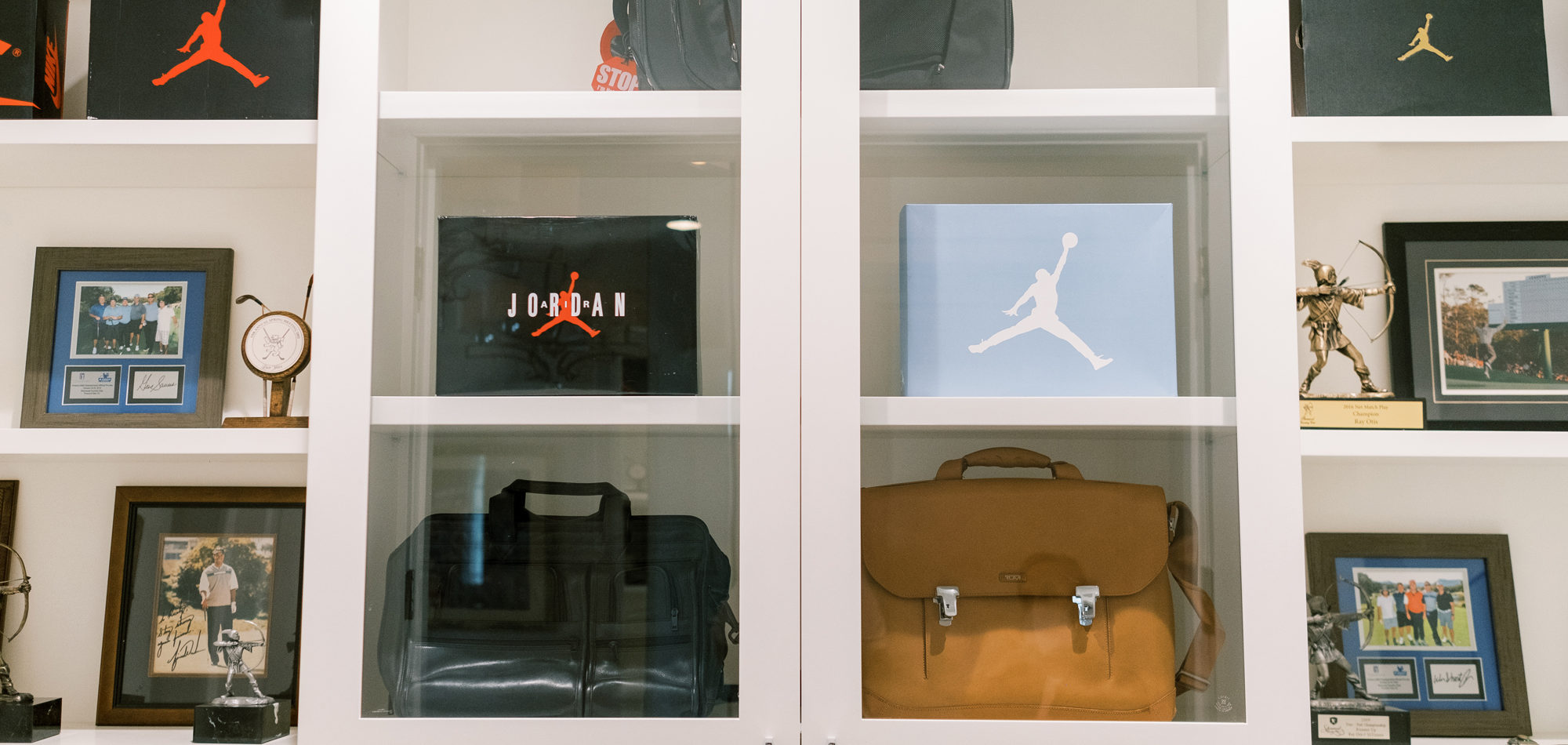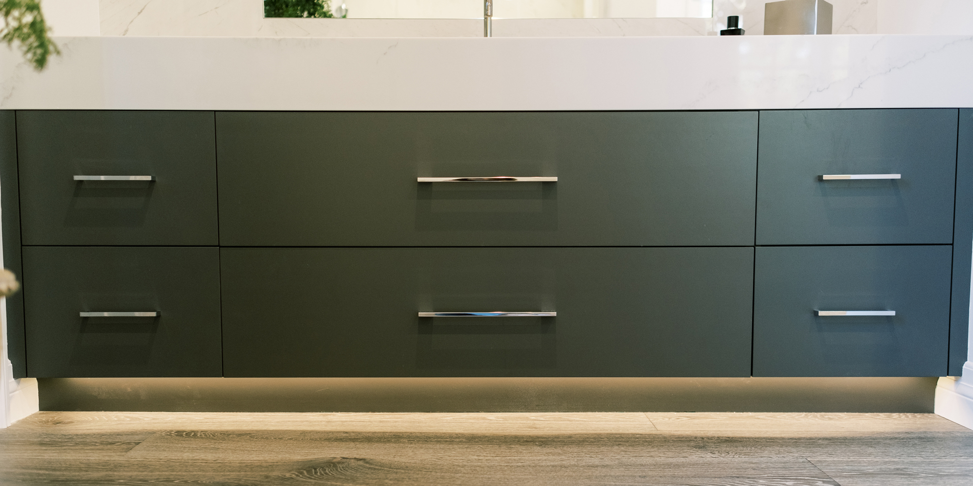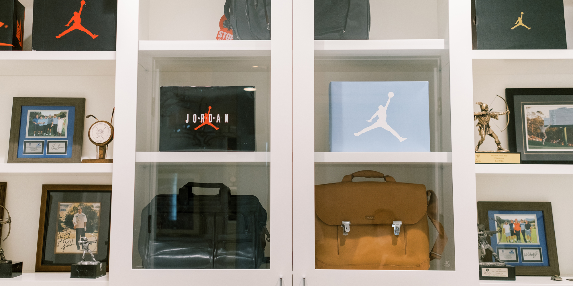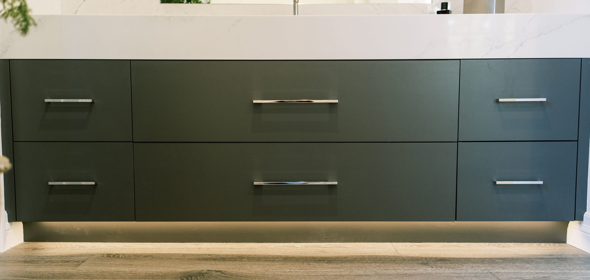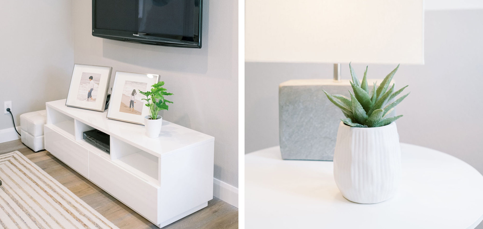 Some of the key features to our client, who cares a lot about functionality, were two separate vanities, all white with dramatic accents, an area for make-up, and a shoe cabinet. He is an avid art collector so arranging his existing art and items in the space was important to him.