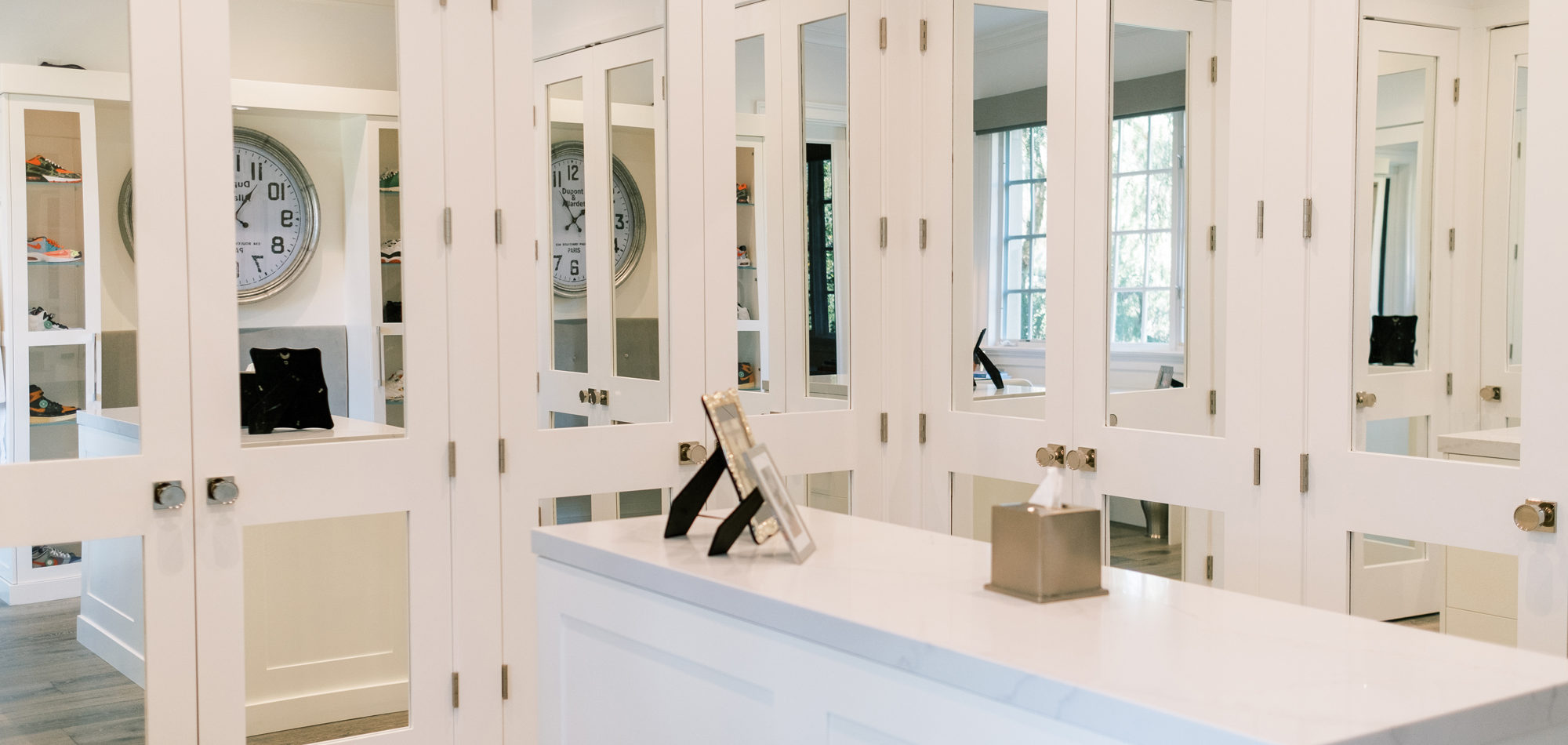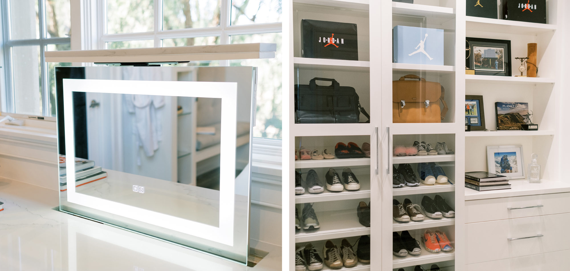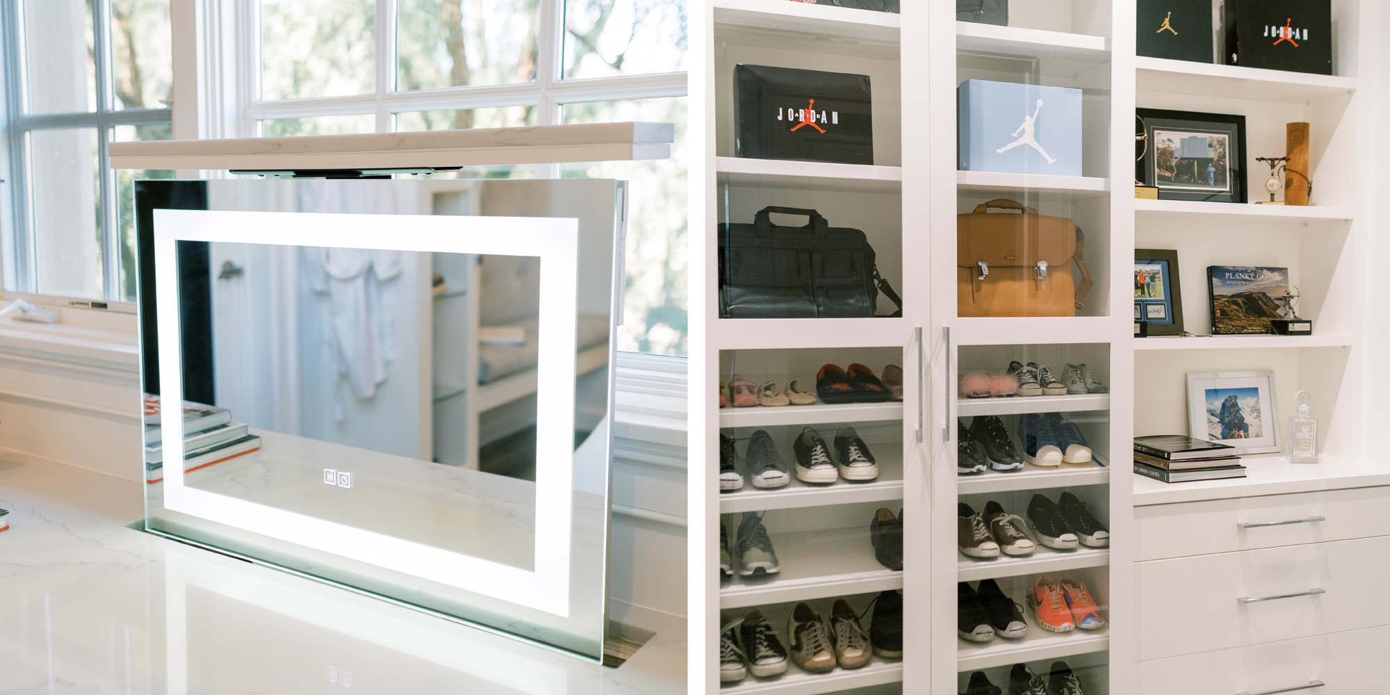 The first task was reworking an existing secondary bathroom to replace with a dressing/closet area. It was important to our client to have the vanity in front of the window. Additional accent lighting was achieved by flanking pendant lights. Necessity is the mother of invention, so we designed a pop-up lighted mirror to be used when needed and to hide under the cabinetry when not in use. Mirrored closet doors opened the space and allowed for light to bounce off the surfaces. A mirrored shoe cabinet was lit inside and has glass doors to showcase the client’s collection.