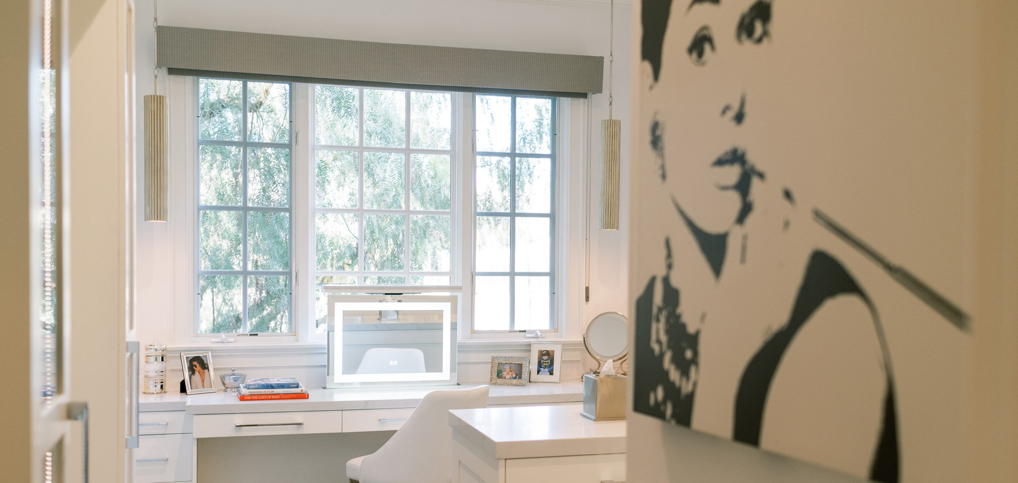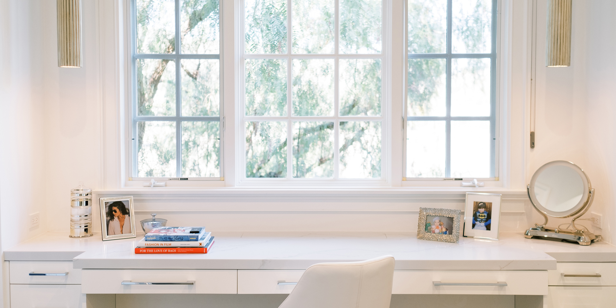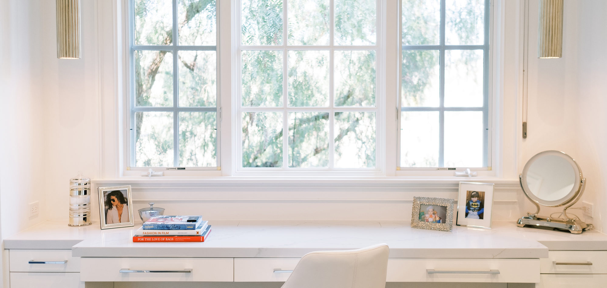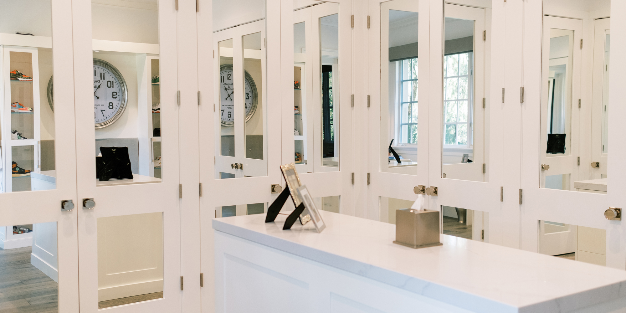 The first task was reworking an existing secondary bathroom to replace with a dressing/closet area. It was important to our client to have the vanity in front of the window. Additional accent lighting was achieved by flanking pendant lights. Necessity is the mother of invention, so we designed a pop-up lighted mirror to be used when needed and to hide under the cabinetry when not in use. Mirrored closet doors opened the space and allowed for light to bounce off the surfaces. A mirrored shoe cabinet was lit inside and has glass doors to showcase the client’s collection.
