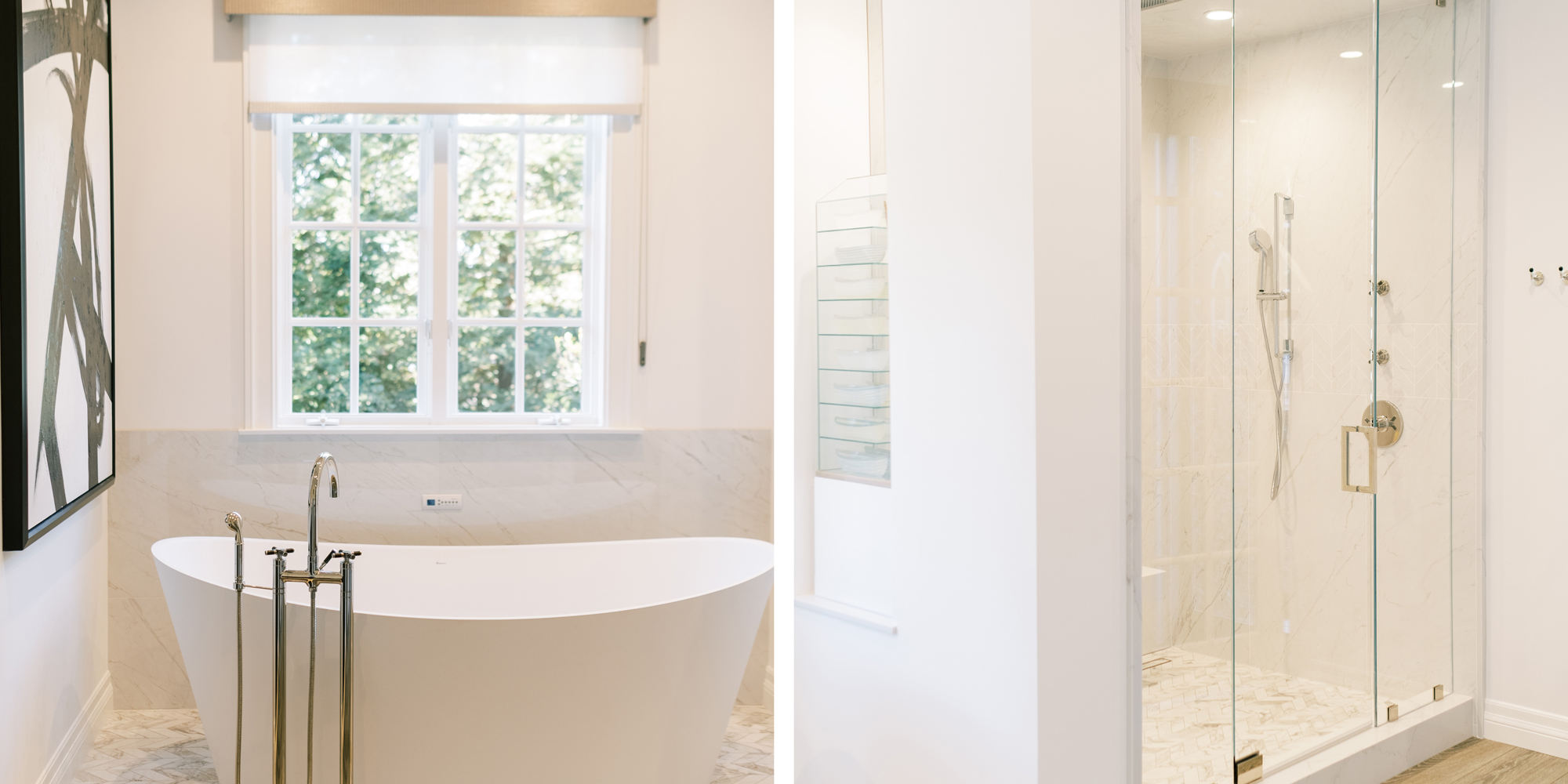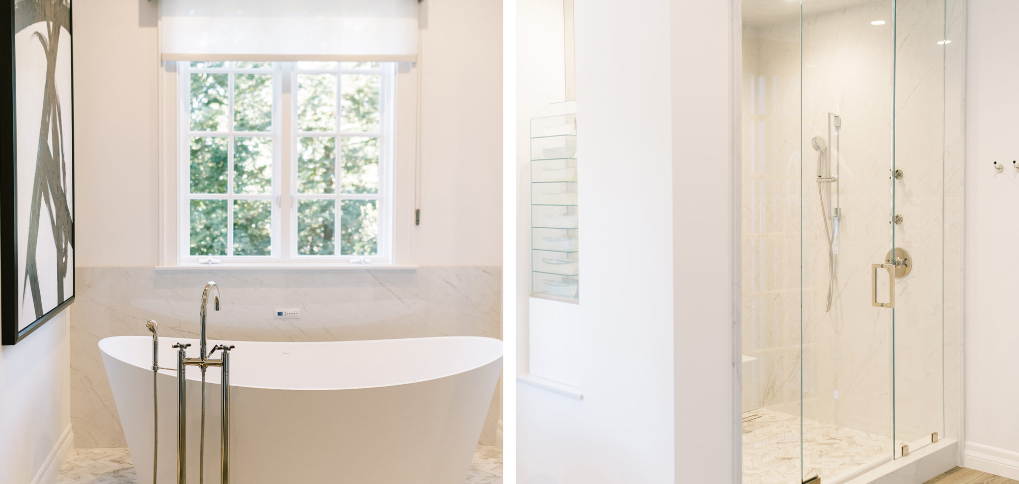 Hardwood flooring and neutral finishes carry you through the now open concept lower level. We removed walls in the kitchen and borrowed space from a hallway. Appliances were camouflaged behind cabinet panels for a seamless look. An oversized island provided functional options for our clients’ varied needs. The island, which was designed to be the hub of the kitchen/family room, is painted in Benjamin Moore’s Racoon Fur, and accented with a two-toned waterfall Caesarstone countertop. A sunny built-in bench and two bistro type tables suits the varying needs of our clients to have a quick bite, work in a sunny nook on a laptop or have a drink and appetizer with family or friends. The original floor-to-ceiling brick fireplace was replaced with a glazed porcelain that has a metallic type of sheen. Some of the client’s existing furniture and artwork was curated with new options to fashion a comfortably and pleasing aesthetic. In the primary retreat we reworked the floor plan to incorporate a walk-in closet, separate custom storage cabinets and spa-like bath area.