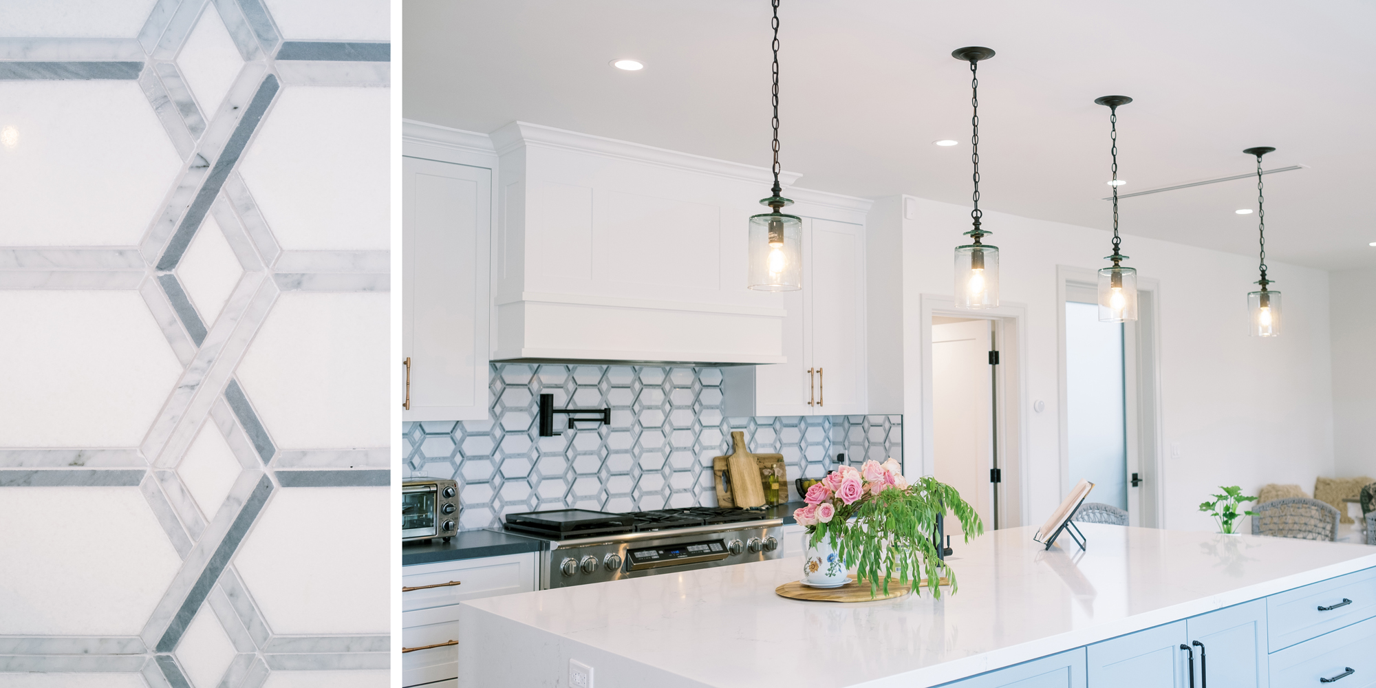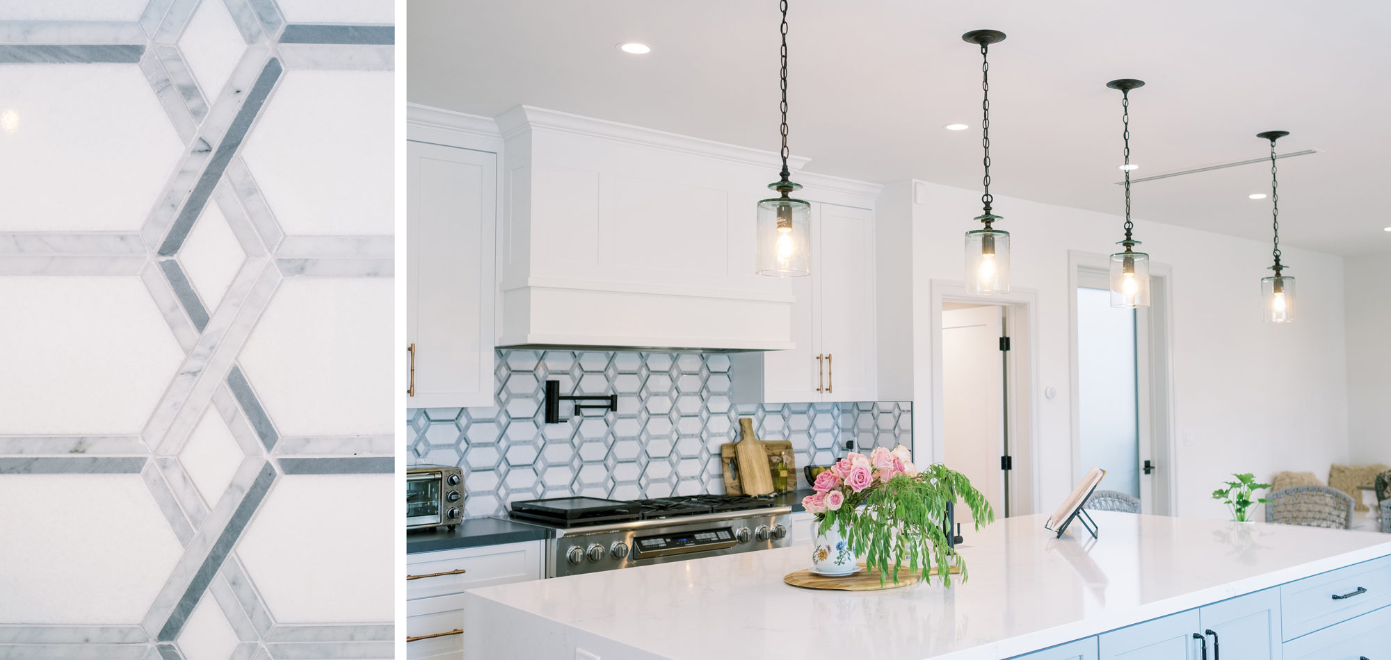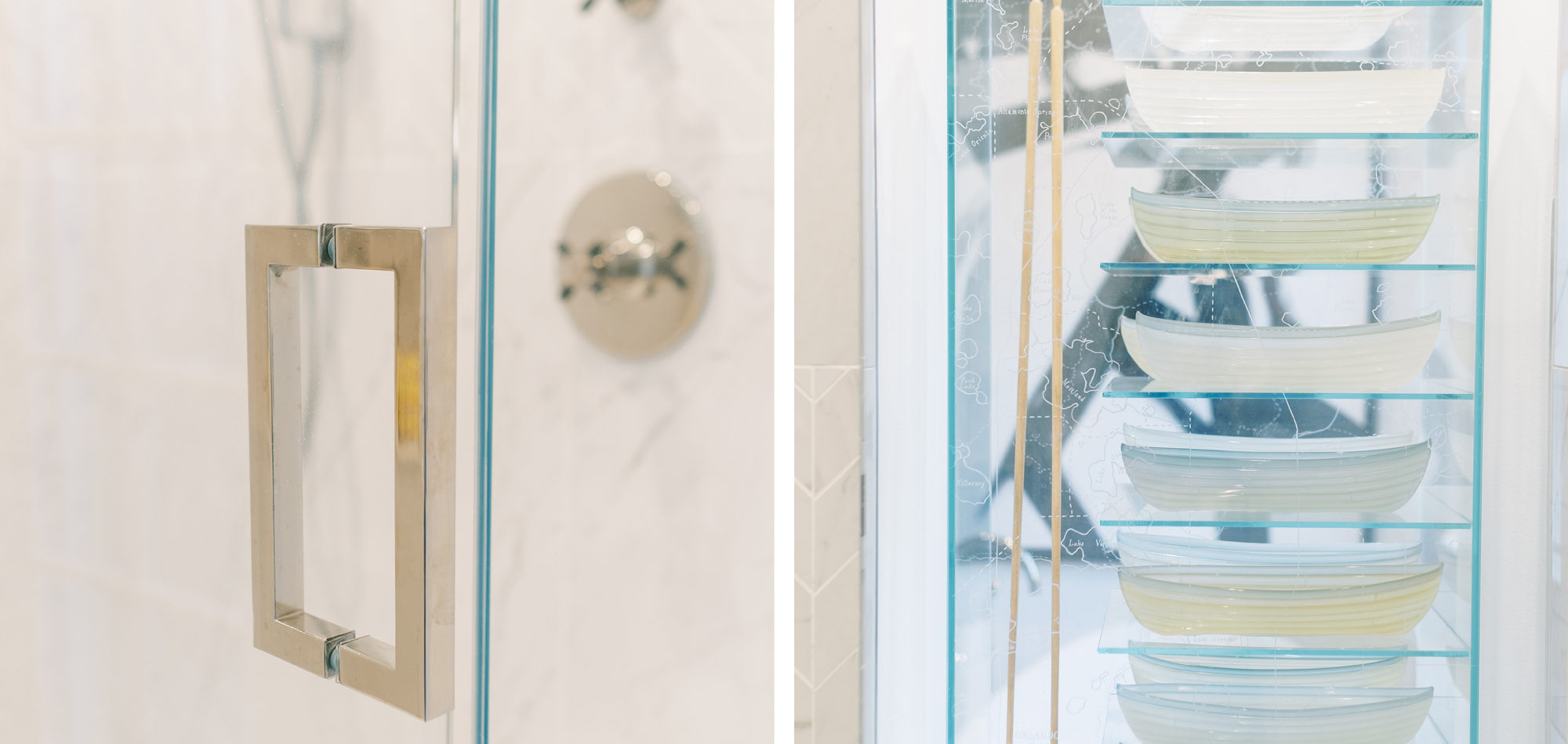 Painted cabinets in Benjamin Moore’s White Wisp and Solitude set the stage for this stunning kitchen. The cabinets were topped off with quartz countertops to emulate stone and a stunning backsplash to tie it all together. We wanted the look of stone without the maintenance. As with all kitchens, lighting the space was an important consideration. Recessed lighting was combined with an LED strip under cabinet lighting. Then a combination of pendants was used over the island and dining table. The island had multiple heights and functions. The lower portion doubled as the baking station and a secondary eating area. The walk-in pantry, every cook’s dream, was attractive and organized enough to leave the door open to view. A stunning kitchen that can be enjoyed for its function, is easy to maintain, and had a calm feeling.