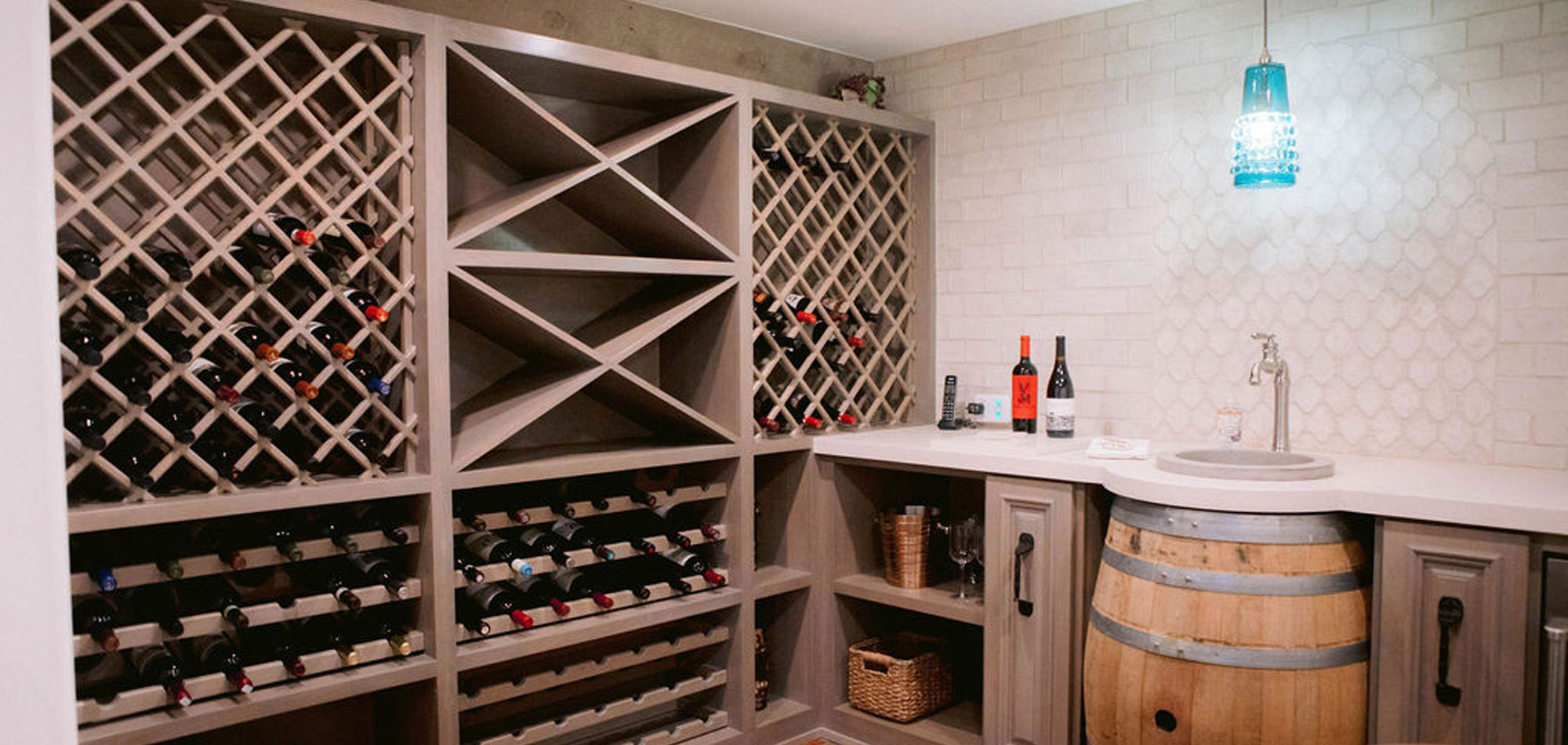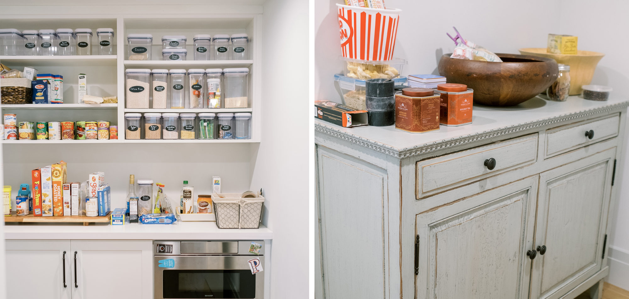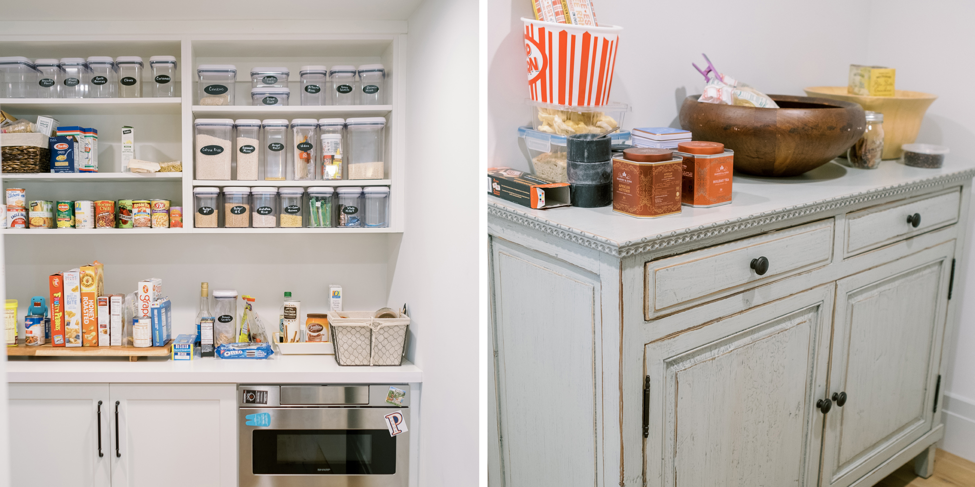 Painted cabinets in Benjamin Moore’s White Wisp and Solitude set the stage for this stunning kitchen. The cabinets were topped off with quartz countertops to emulate stone and a stunning backsplash to tie it all together. We wanted the look of stone without the maintenance. As with all kitchens, lighting the space was an important consideration. Recessed lighting was combined with an LED strip under cabinet lighting. Then a combination of pendants was used over the island and dining table. The island had multiple heights and functions. The lower portion doubled as the baking station and a secondary eating area. The walk-in pantry, every cook’s dream, was attractive and organized enough to leave the door open to view. A stunning kitchen that can be enjoyed for its function, is easy to maintain, and had a calm feeling.