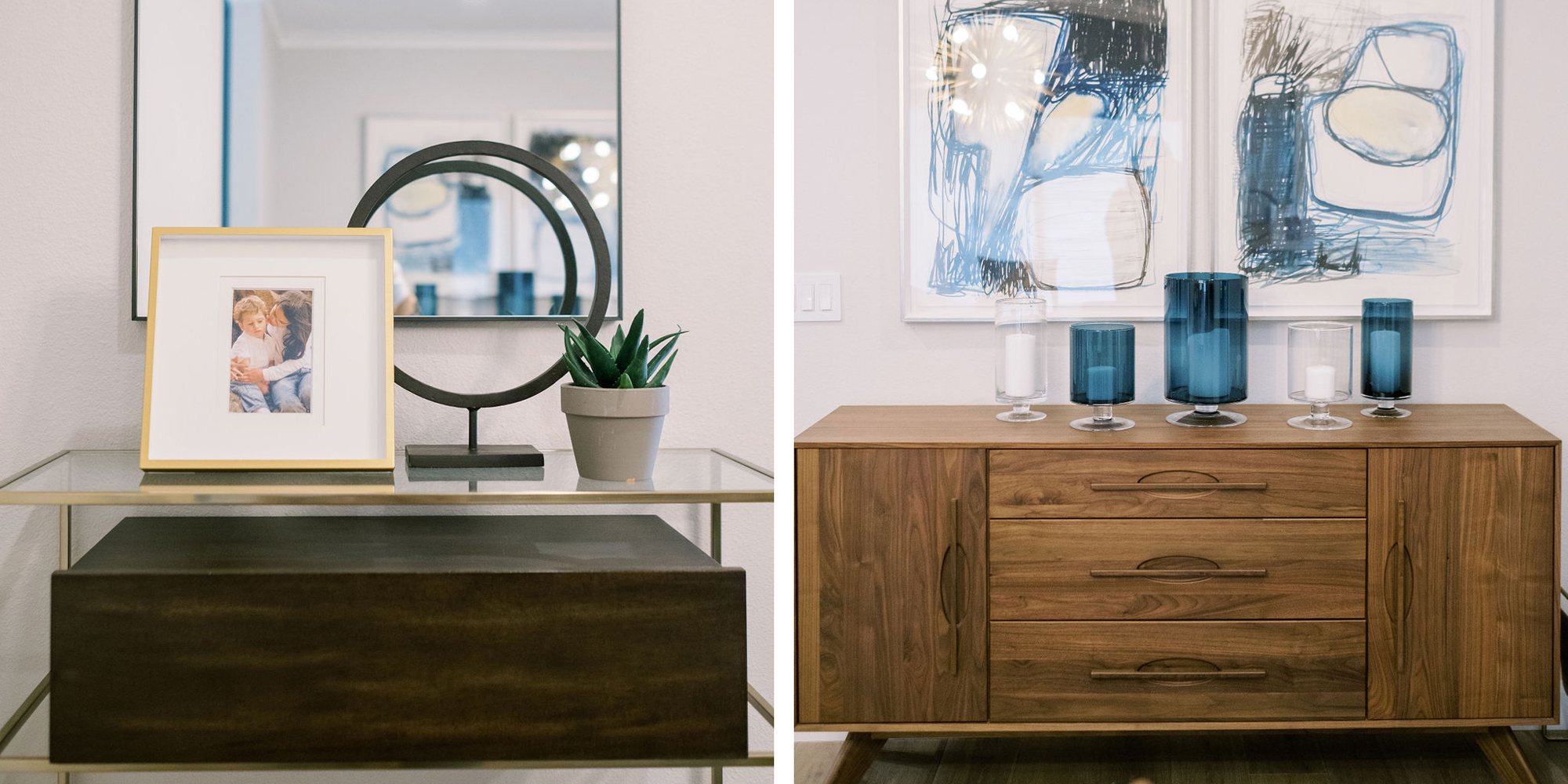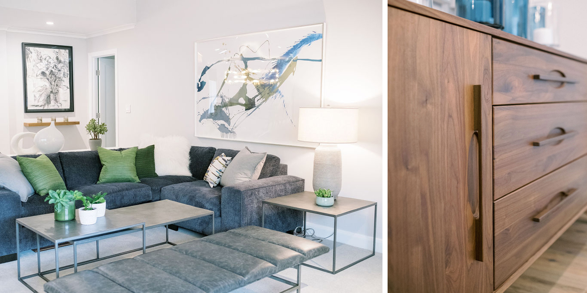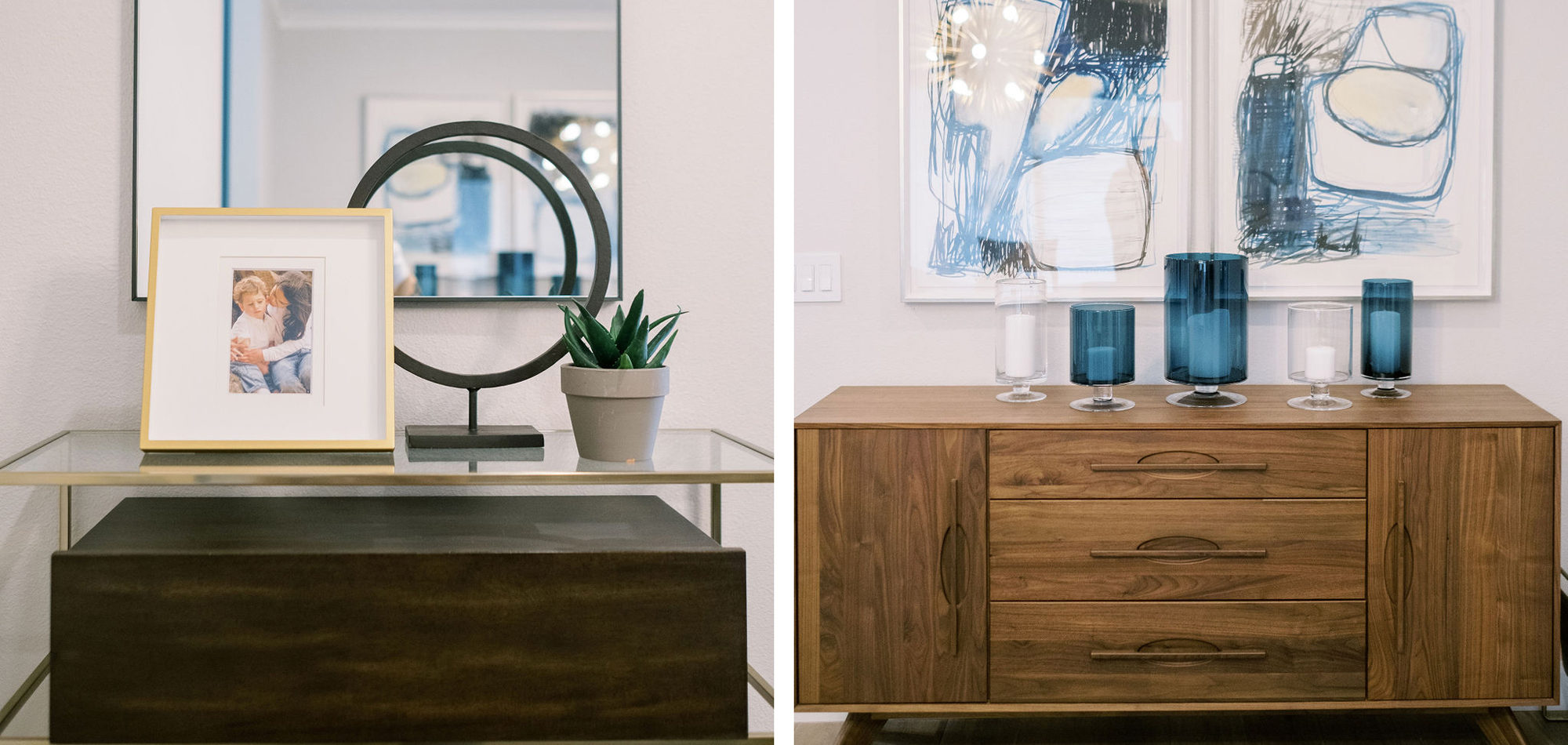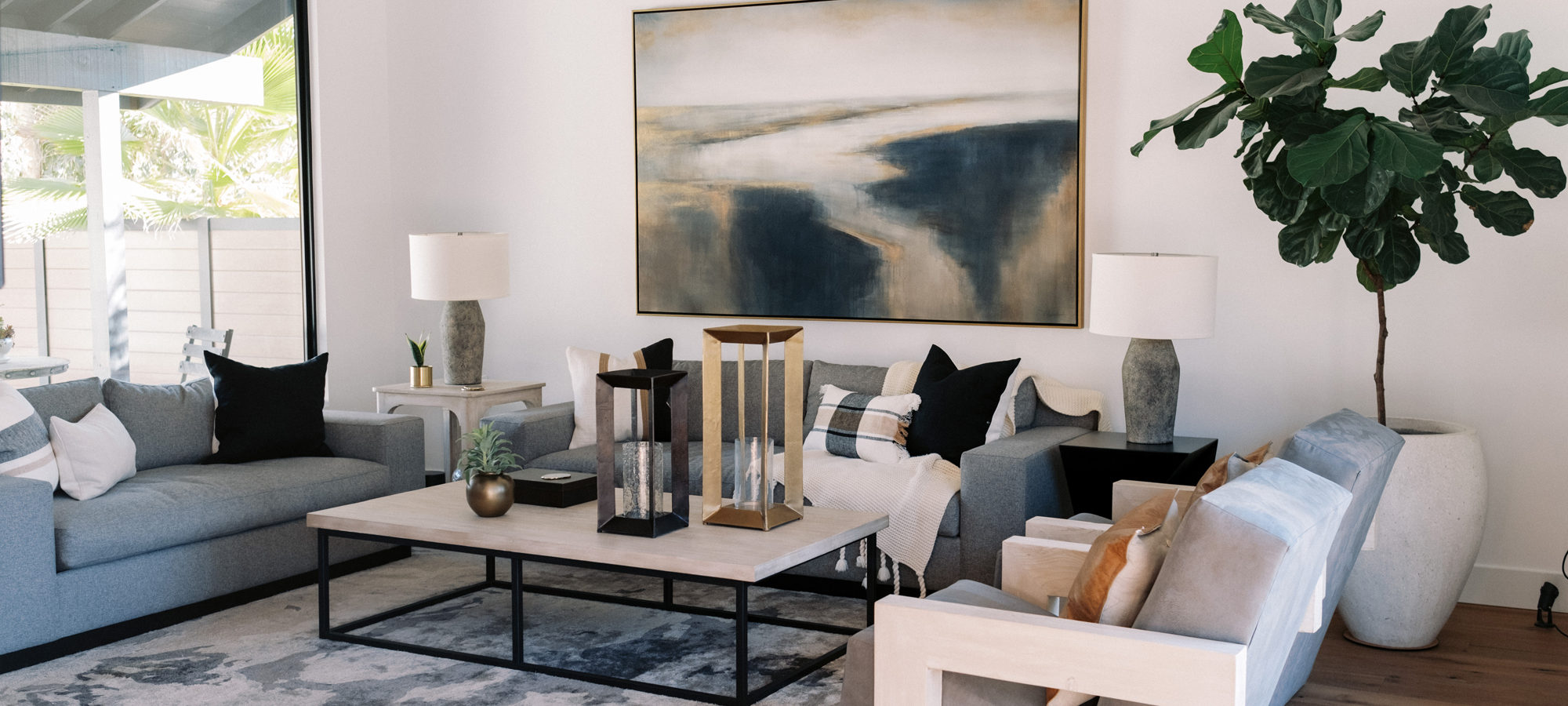 We are proud of this renovation that brought tailored style to this once outdated home. The curated furniture, art, and lighting create a truly unique and exciting interior.