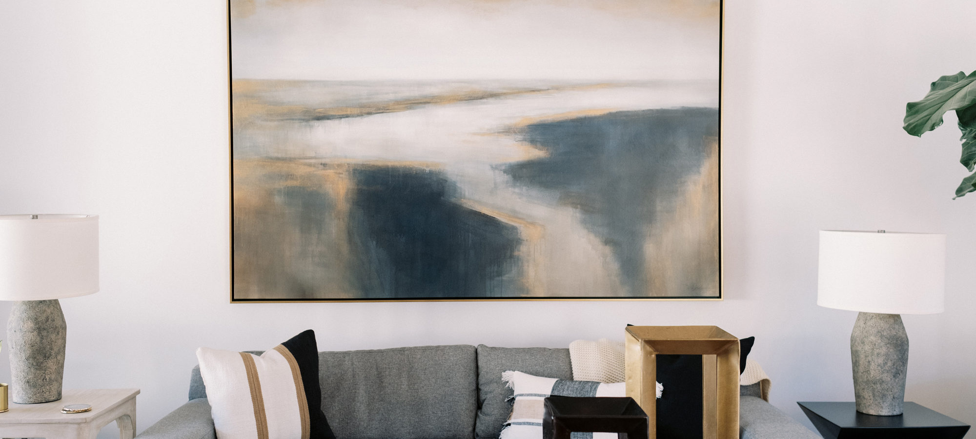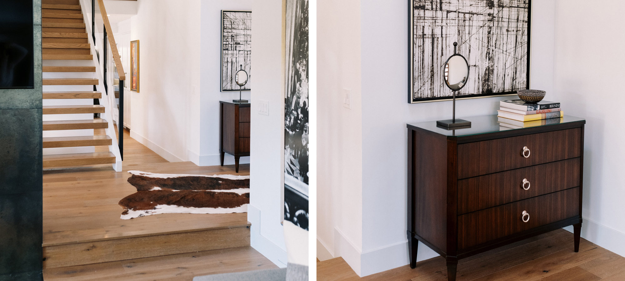 We worked with several of the client’s fabulous furniture and art pieces which we were able to integrate into the design beautifully. And of course, there were some amazing new furniture pieces added. Lighting in the living room and hallway was also important. Note the interesting large-scale lighting that showcases art in the setting. A wow was created by adding a gold-tinted backsplash for the bar area looking dramatic with the dark cabinets.