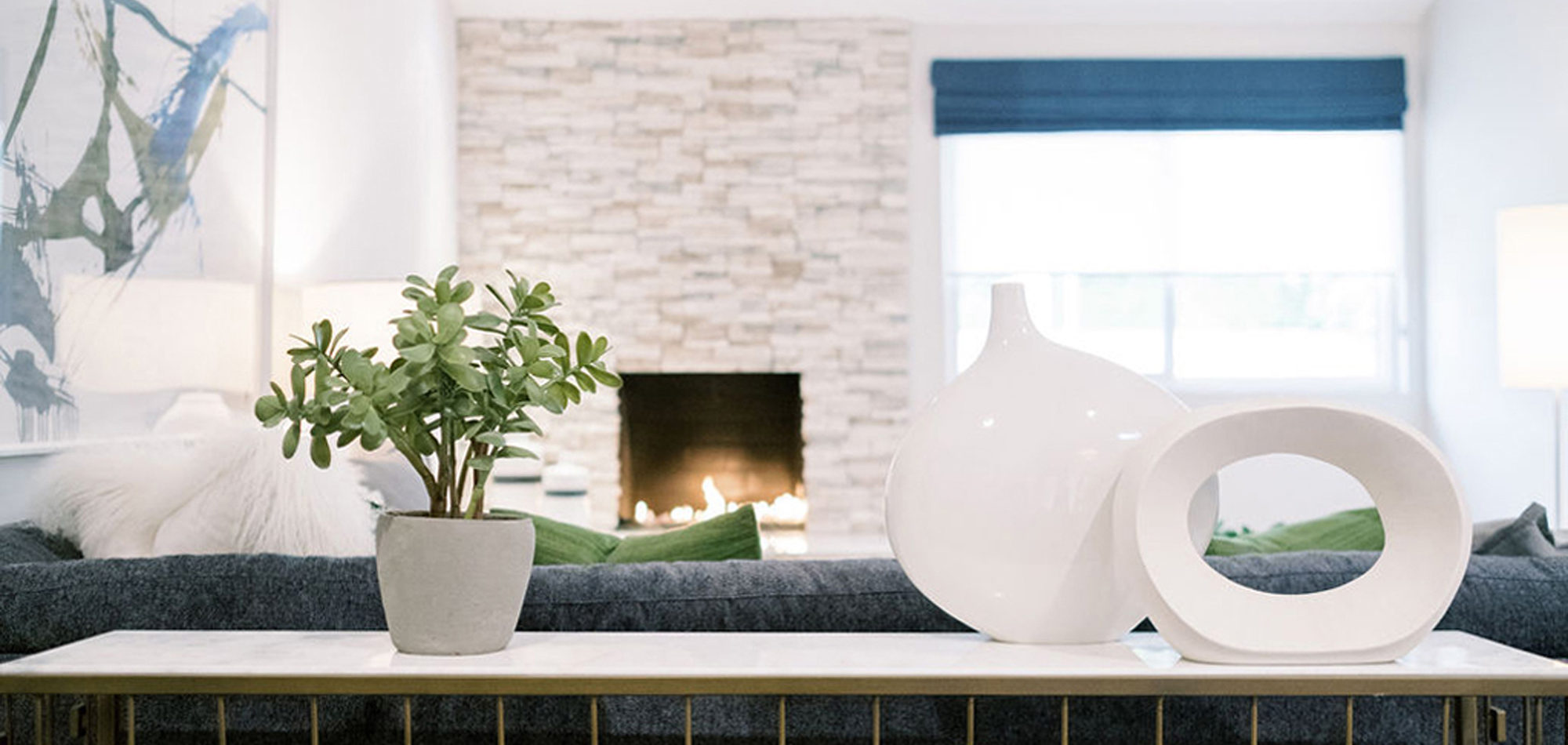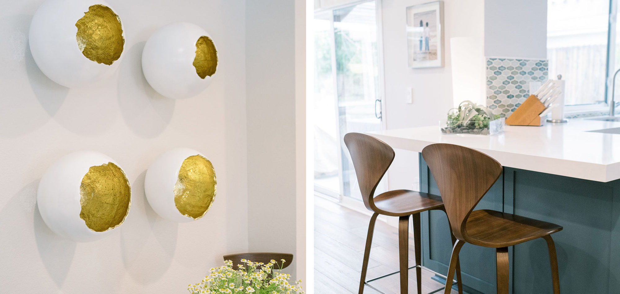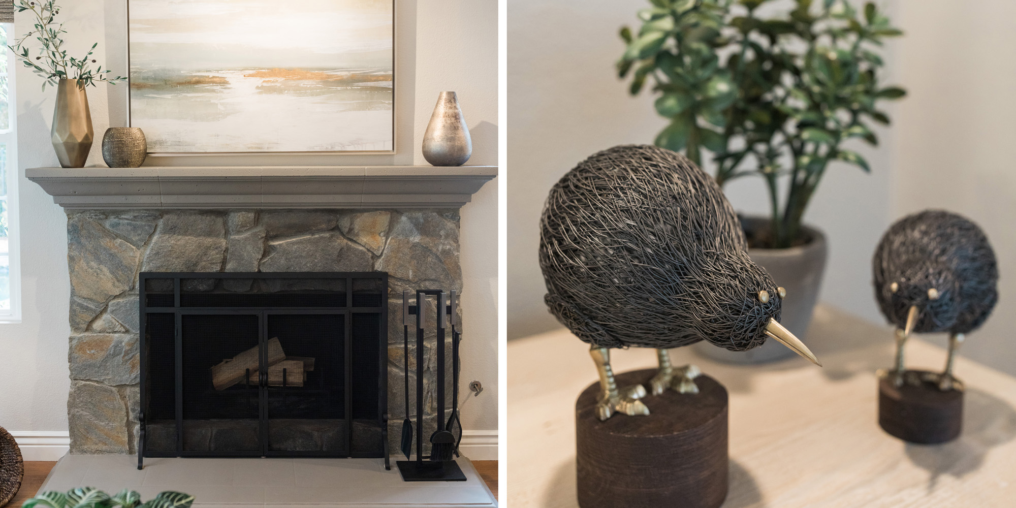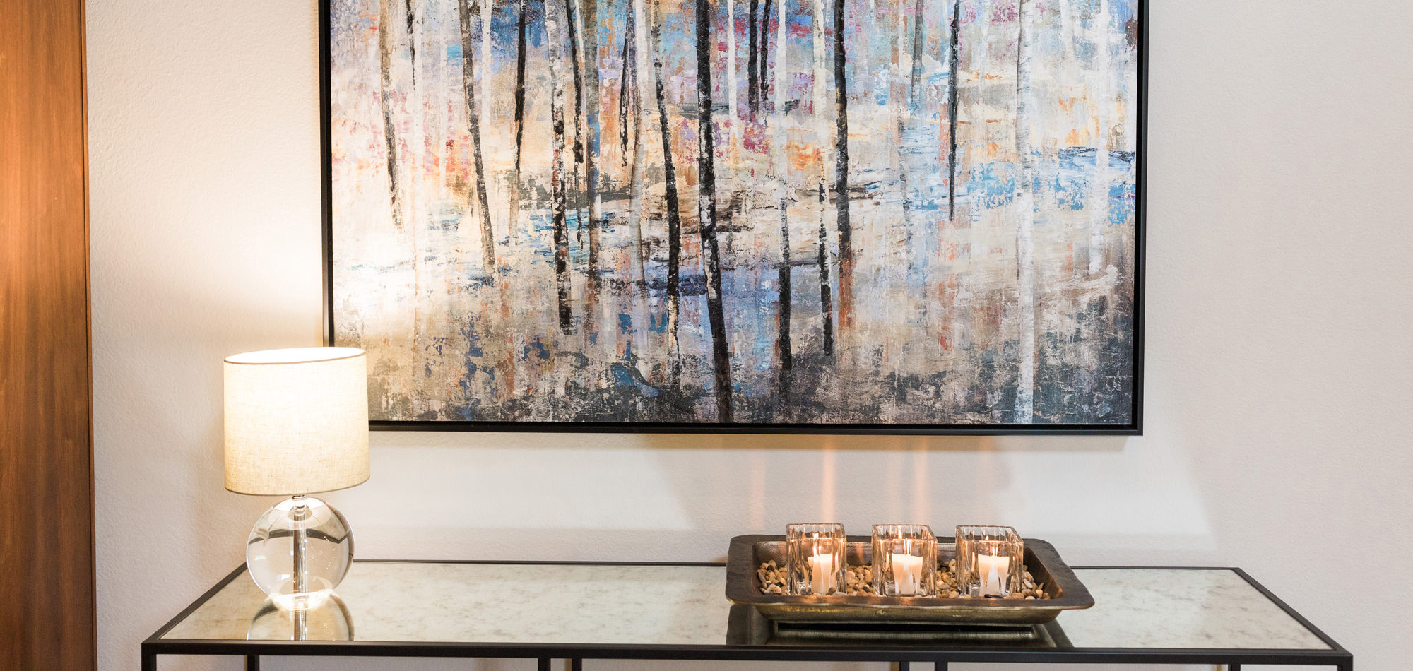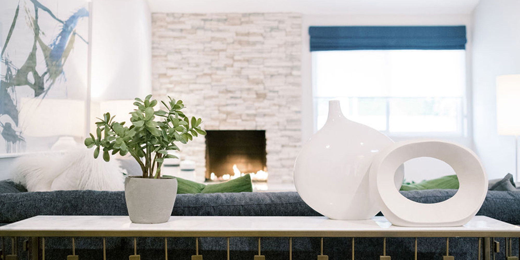 Our exuberant client requested a design with some funky and fun Mid-Century influence. She wanted color included in her home refresh. To have a space that was elegant, comfortable, and warm without taking the design style too literally. We began by laying out the space to suit preferences for seating and flow. We used some of the client’s own furniture while incorporating new pieces, some custom sofas, and a few mid-century pieces. We added bold color to large-scale art and tied it in with accessories to bring about rooms that were lively. Then we injected interest with an iconic light fixture over the dining table from Arteriors and added a splash of whimsey with “Broken Egg Art” from Phillips Collection (who says “every piece is a conversation”). In the beginning, our client wanted to keep her existing fireplace. We asked if she would be open to exploring other options and she agreed. In the end, we all decided that the original fireplace would look out of place in the new design. We elected to replace it with stacked stone, painted the inside firebrick black, and added decorative glass rocks for sparkle. They now love this updated look, and the fireplace adds a glow of warmth to the room. The overall atmosphere of the spaces induces balance, symmetry, and scale.