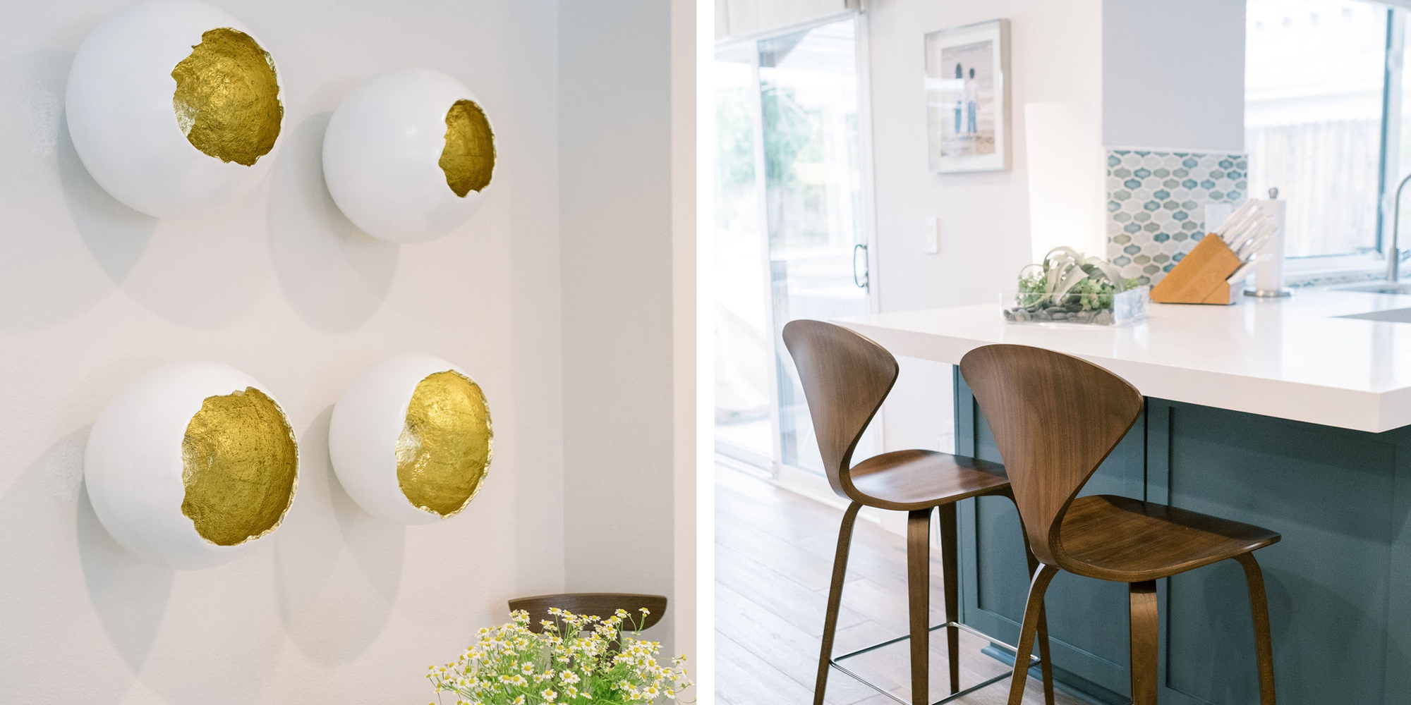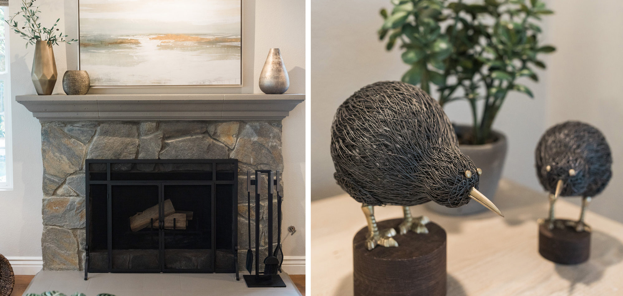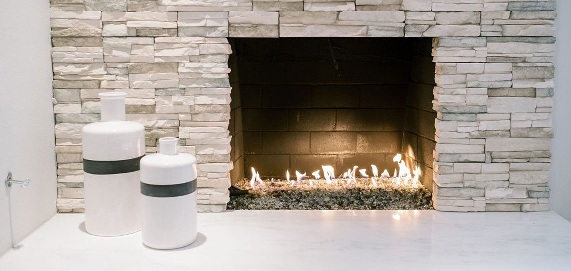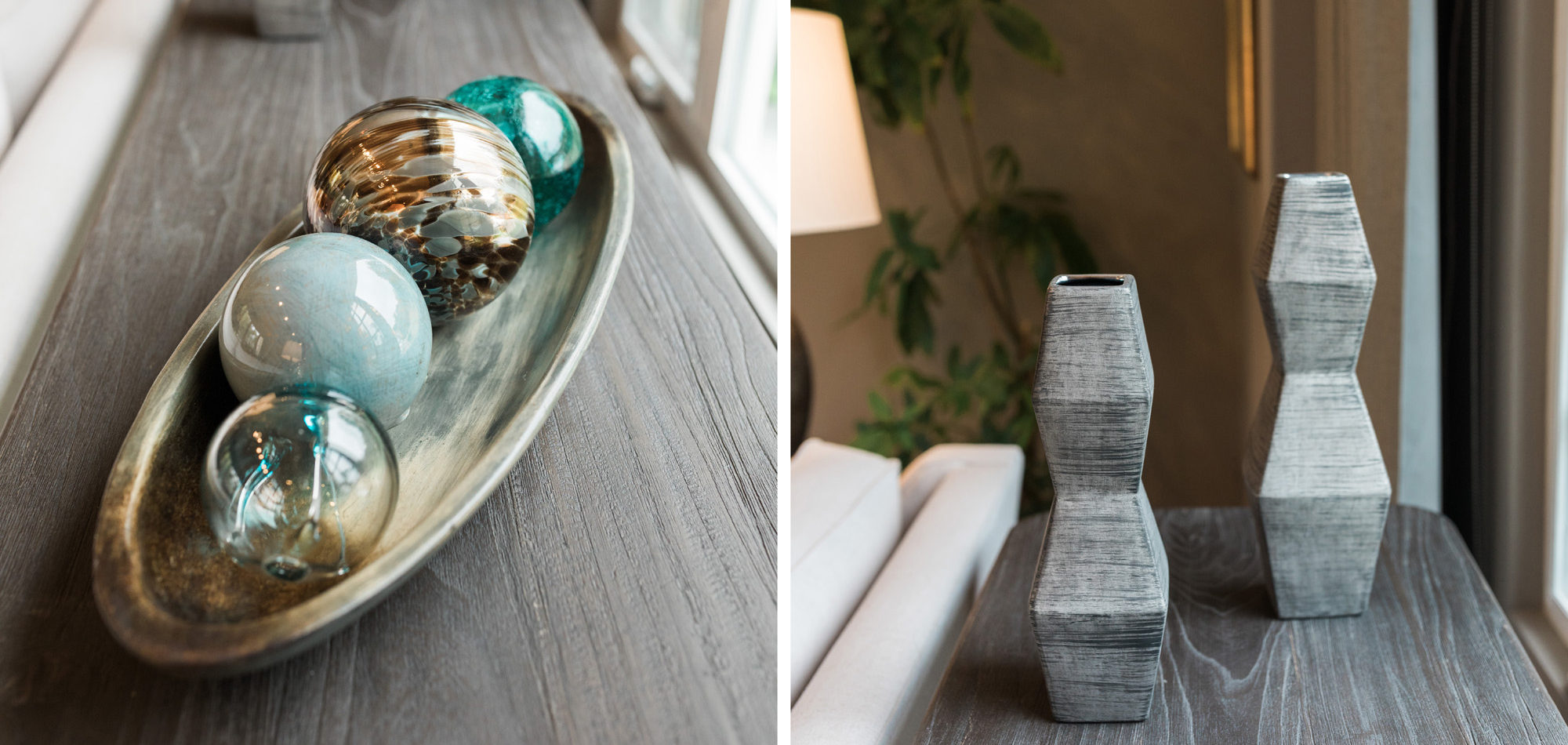 Our exuberant client requested a design with some funky and fun Mid-Century influence. She wanted color included in her home refresh. To have a space that was elegant, comfortable, and warm without taking the design style too literally. We began by laying out the space to suit preferences for seating and flow. We used some of the client’s own furniture while incorporating new pieces, some custom sofas, and a few mid-century pieces. We added bold color to large-scale art and tied it in with accessories to bring about rooms that were lively. Then we injected interest with an iconic light fixture over the dining table from Arteriors and added a splash of whimsey with “Broken Egg Art” from Phillips Collection (who says “every piece is a conversation”). In the beginning, our client wanted to keep her existing fireplace. We asked if she would be open to exploring other options and she agreed. In the end, we all decided that the original fireplace would look out of place in the new design. We elected to replace it with stacked stone, painted the inside firebrick black, and added decorative glass rocks for sparkle. They now love this updated look, and the fireplace adds a glow of warmth to the room. The overall atmosphere of the spaces induces balance, symmetry, and scale.