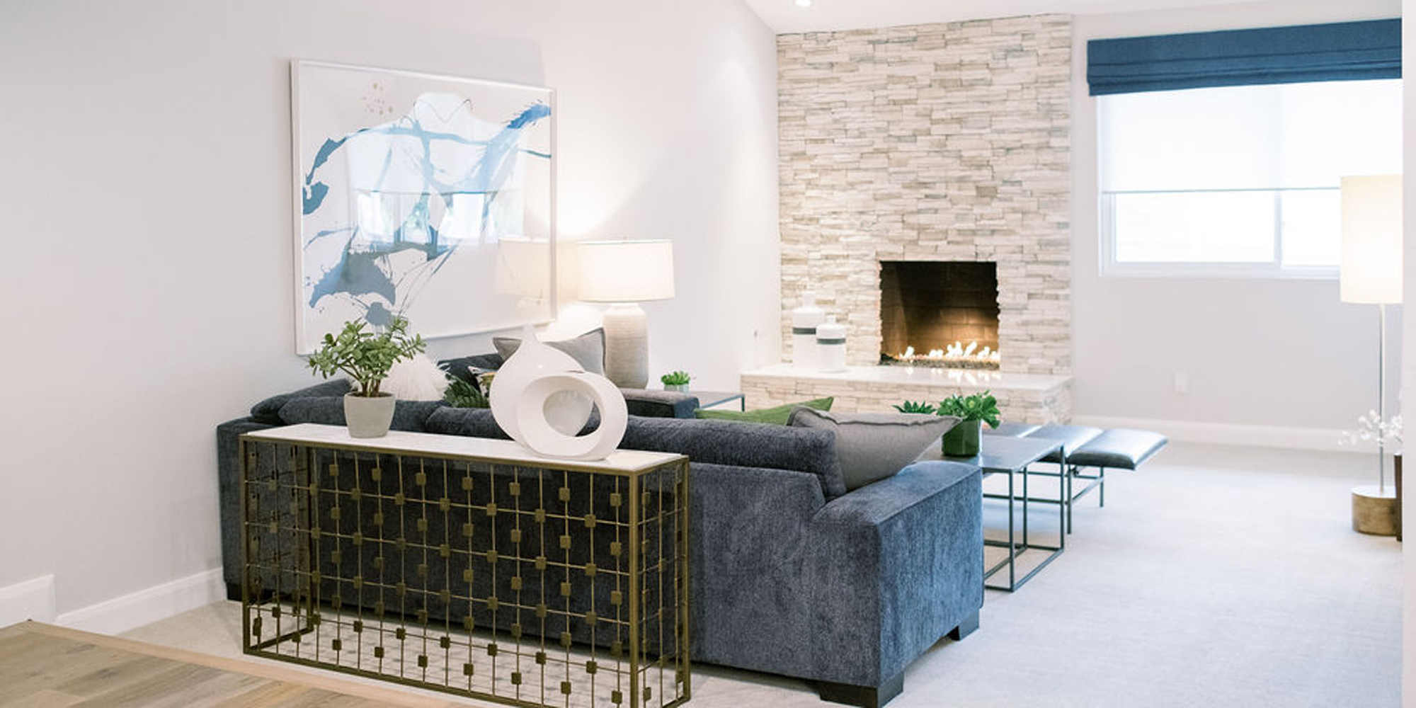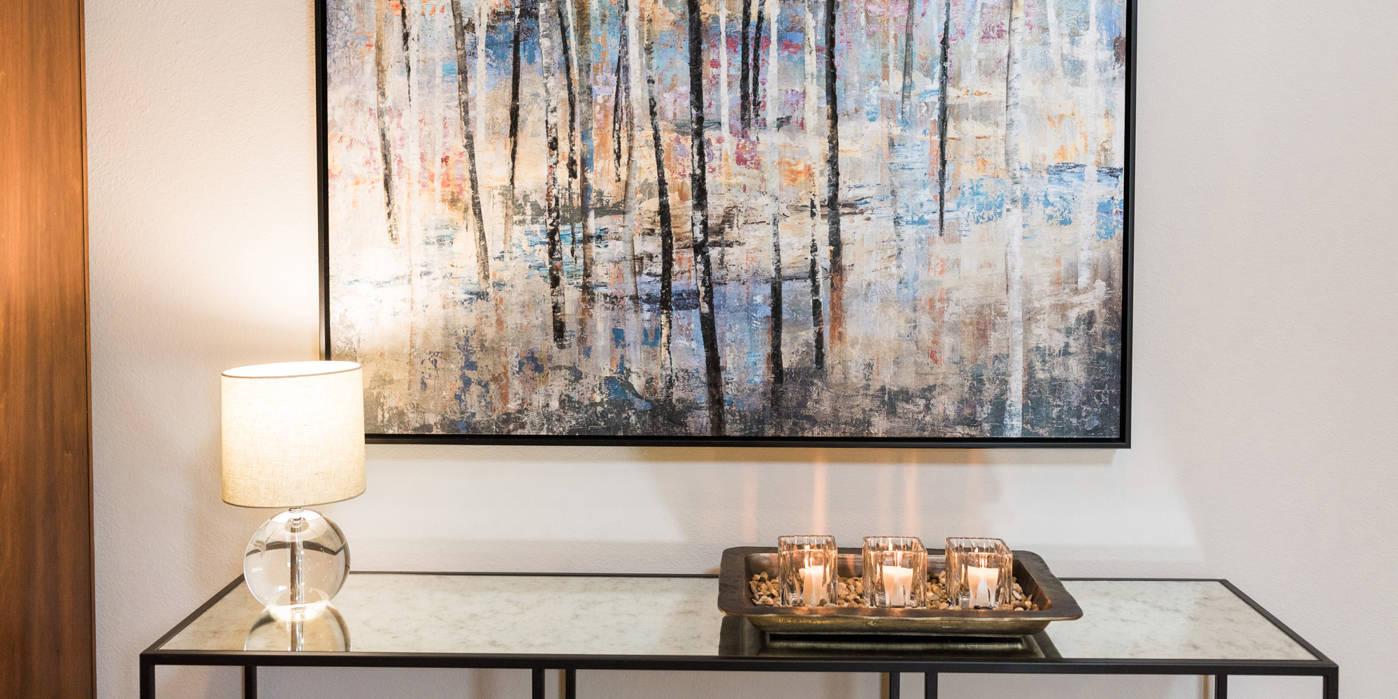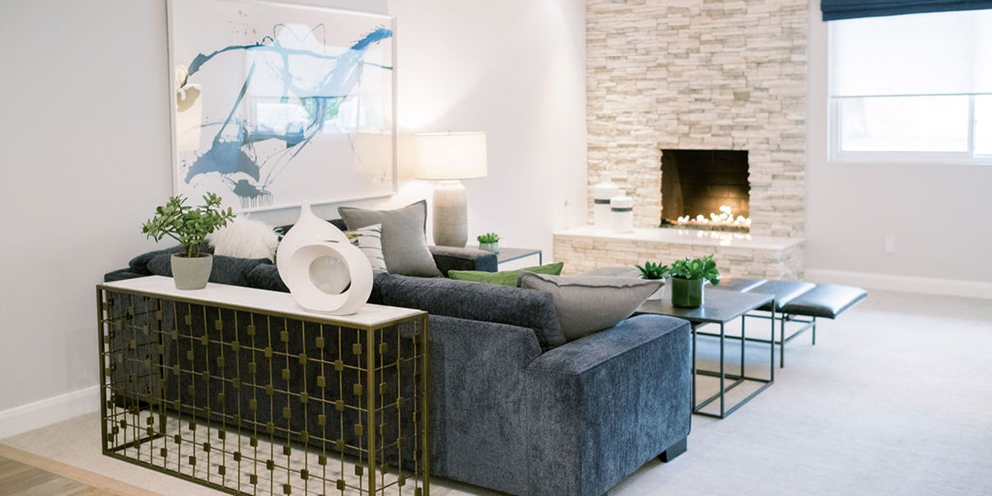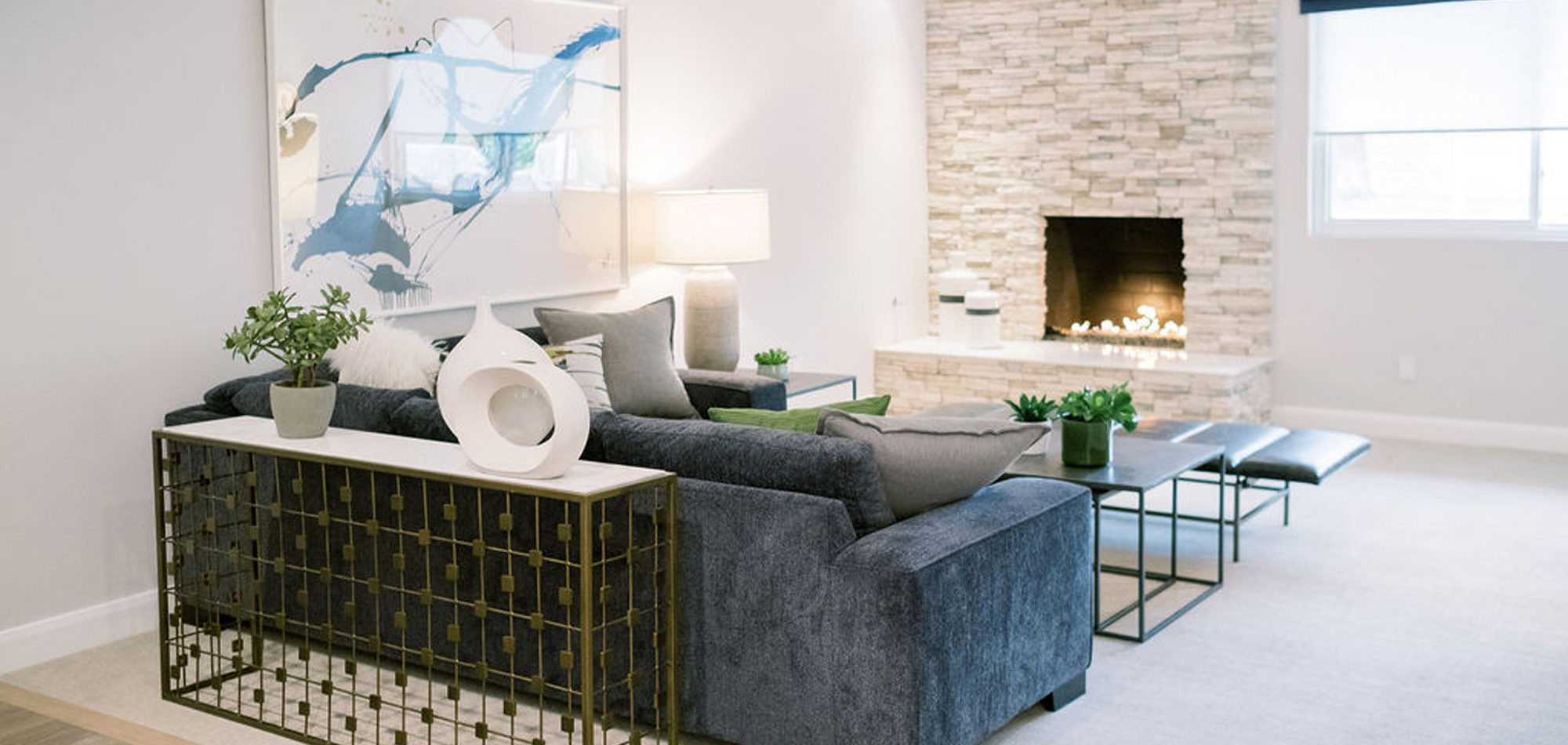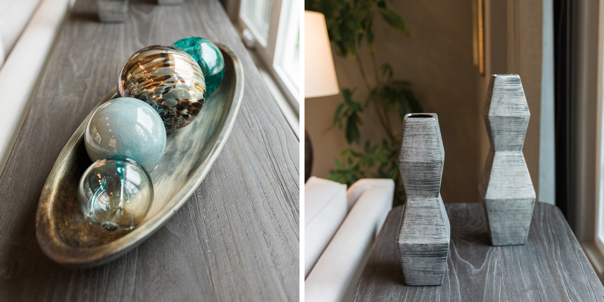 Our exuberant client requested a design with some funky and fun Mid-Century influence. She wanted color included in her home refresh. To have a space that was elegant, comfortable, and warm without taking the design style too literally. We began by laying out the space to suit preferences for seating and flow. We used some of the client’s own furniture while incorporating new pieces, some custom sofas, and a few mid-century pieces. We added bold color to large-scale art and tied it in with accessories to bring about rooms that were lively. Then we injected interest with an iconic light fixture over the dining table from Arteriors and added a splash of whimsey with “Broken Egg Art” from Phillips Collection (who says “every piece is a conversation”). In the beginning, our client wanted to keep her existing fireplace. We asked if she would be open to exploring other options and she agreed. In the end, we all decided that the original fireplace would look out of place in the new design. We elected to replace it with stacked stone, painted the inside firebrick black, and added decorative glass rocks for sparkle. They now love this updated look, and the fireplace adds a glow of warmth to the room. The overall atmosphere of the spaces induces balance, symmetry, and scale.