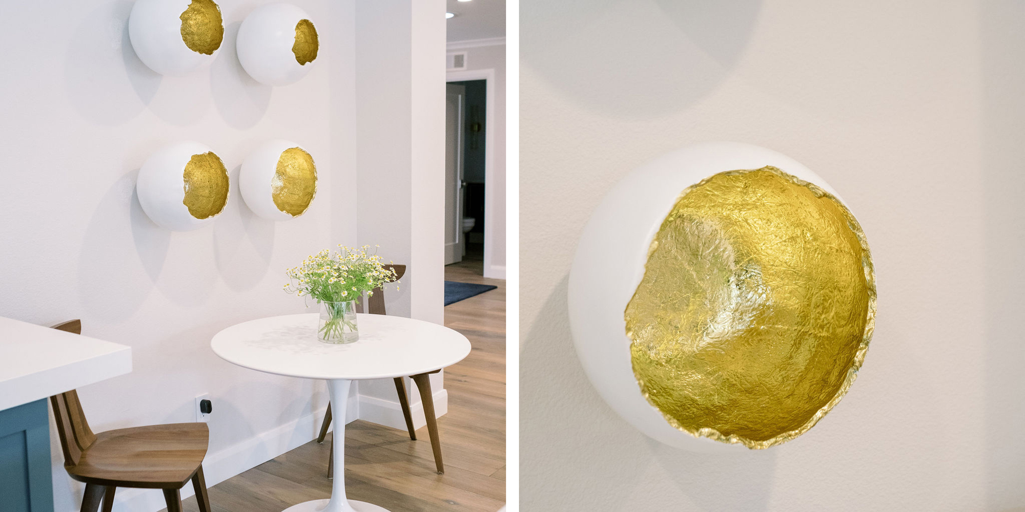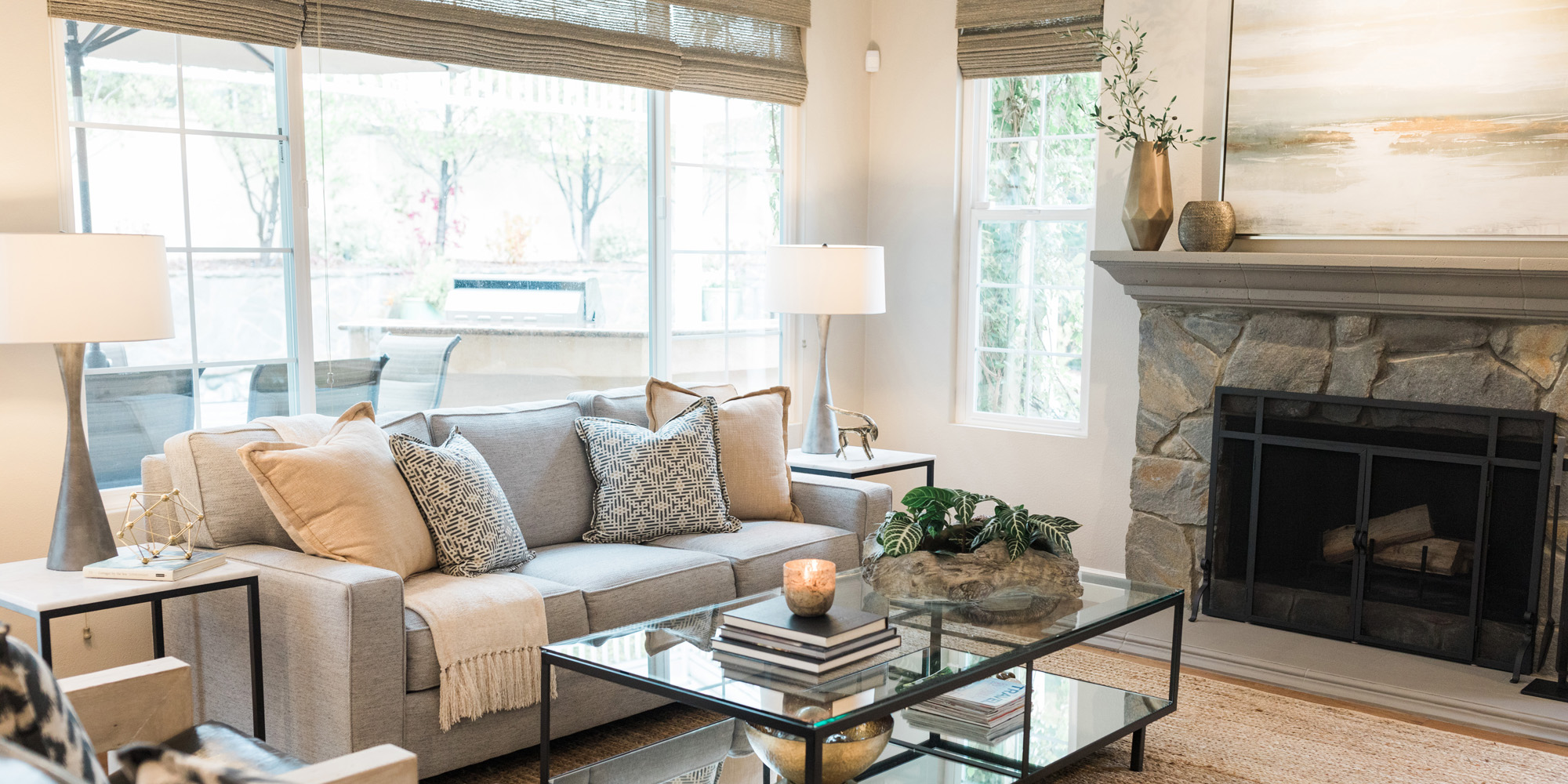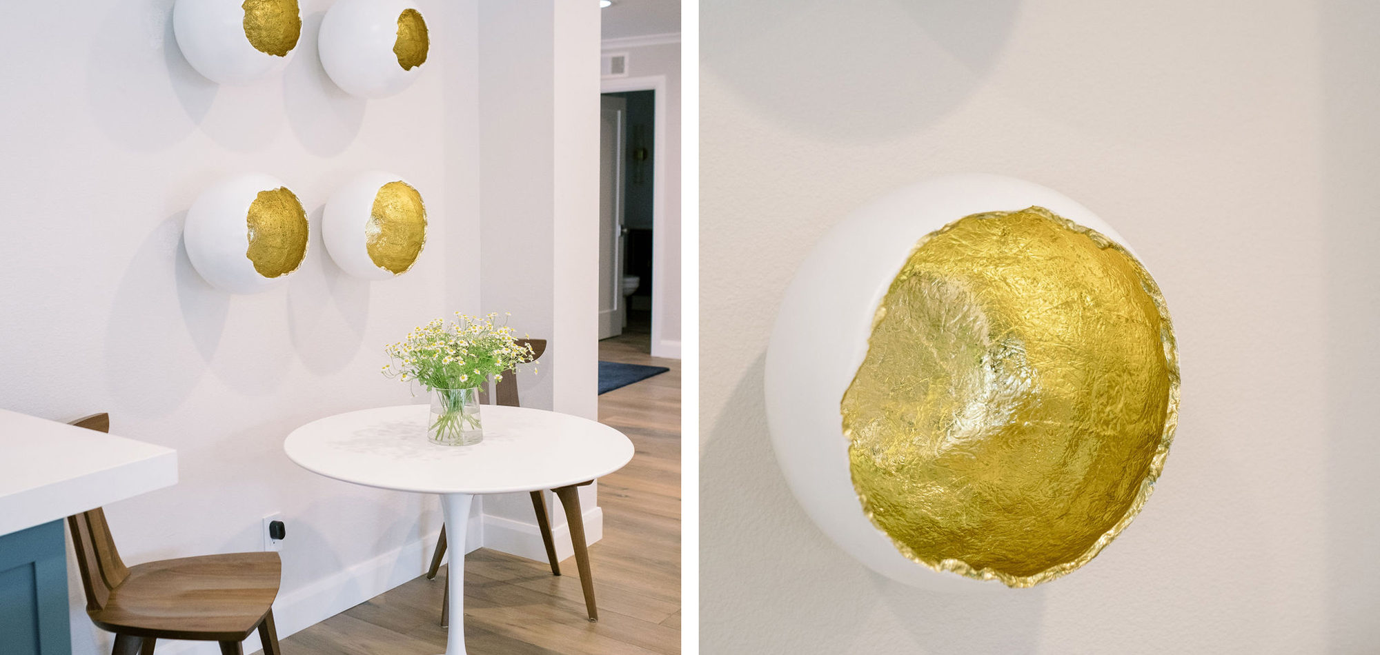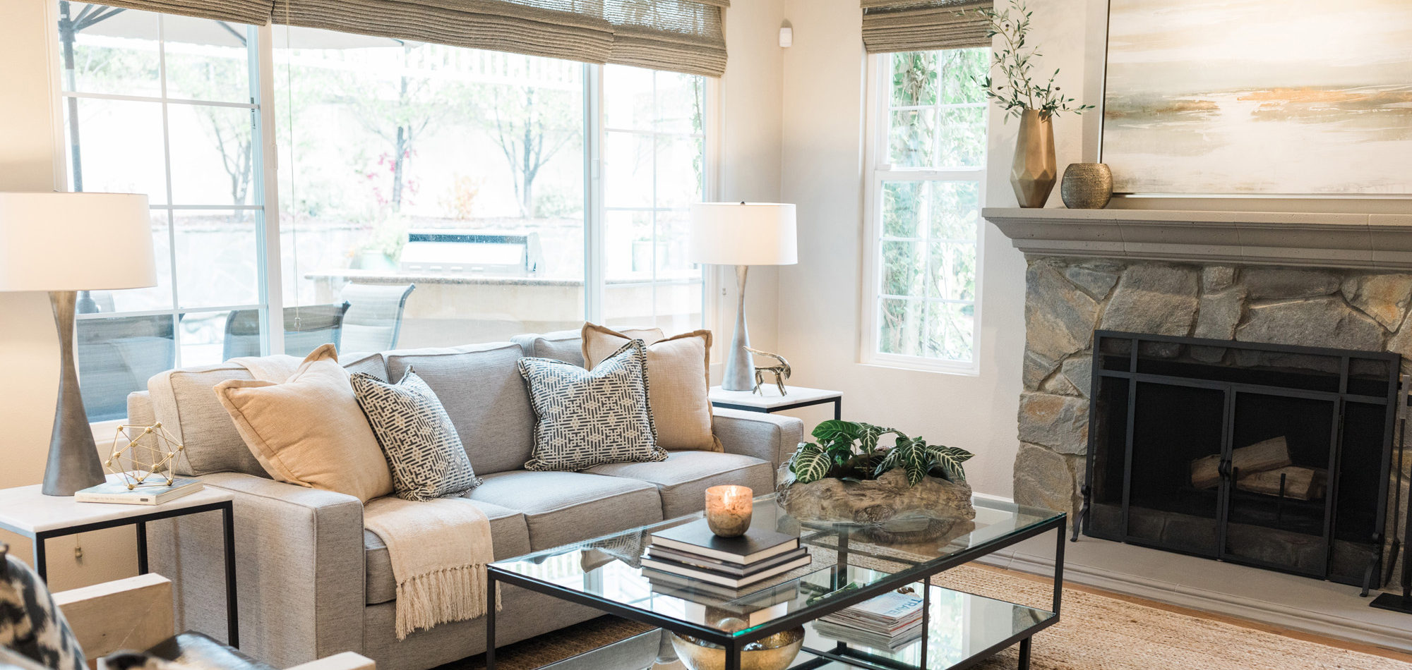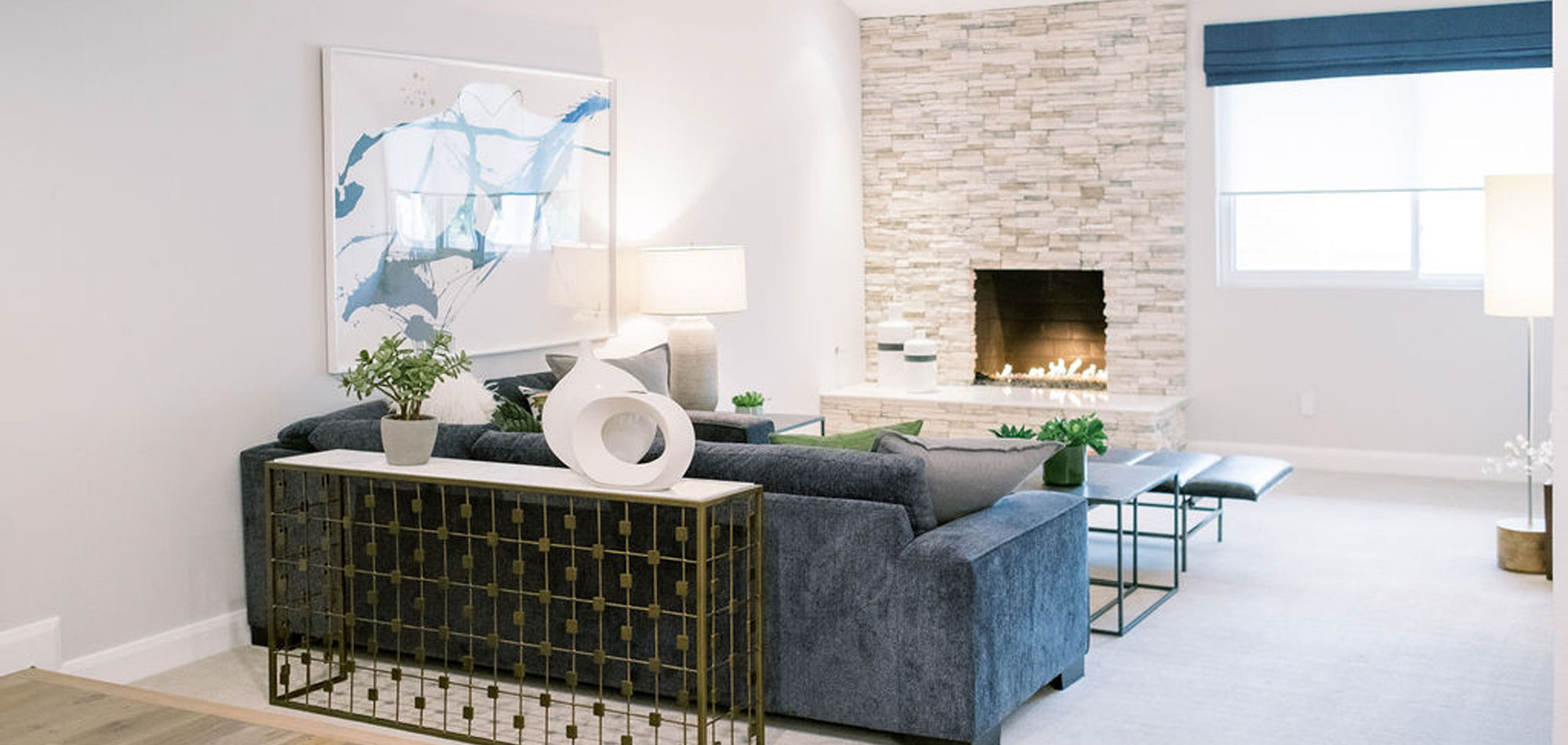 Our exuberant client requested a design with some funky and fun Mid-Century influence. She wanted color included in her home refresh. To have a space that was elegant, comfortable, and warm without taking the design style too literally. We began by laying out the space to suit preferences for seating and flow. We used some of the client’s own furniture while incorporating new pieces, some custom sofas, and a few mid-century pieces. We added bold color to large-scale art and tied it in with accessories to bring about rooms that were lively. Then we injected interest with an iconic light fixture over the dining table from Arteriors and added a splash of whimsey with “Broken Egg Art” from Phillips Collection (who says “every piece is a conversation”). In the beginning, our client wanted to keep her existing fireplace. We asked if she would be open to exploring other options and she agreed. In the end, we all decided that the original fireplace would look out of place in the new design. We elected to replace it with stacked stone, painted the inside firebrick black, and added decorative glass rocks for sparkle. They now love this updated look, and the fireplace adds a glow of warmth to the room. The overall atmosphere of the spaces induces balance, symmetry, and scale.