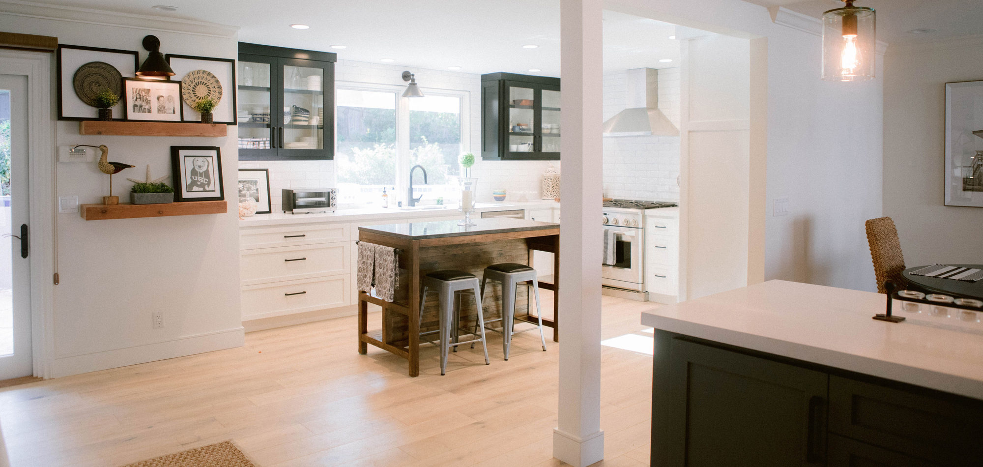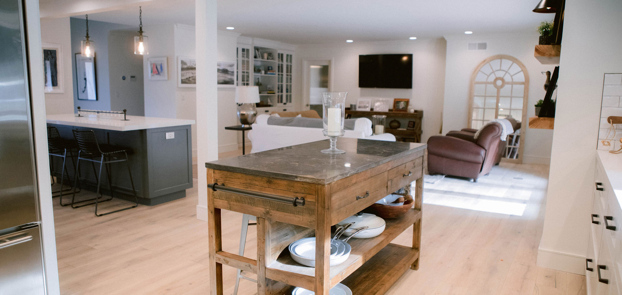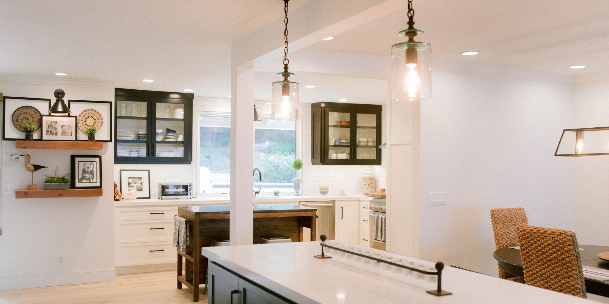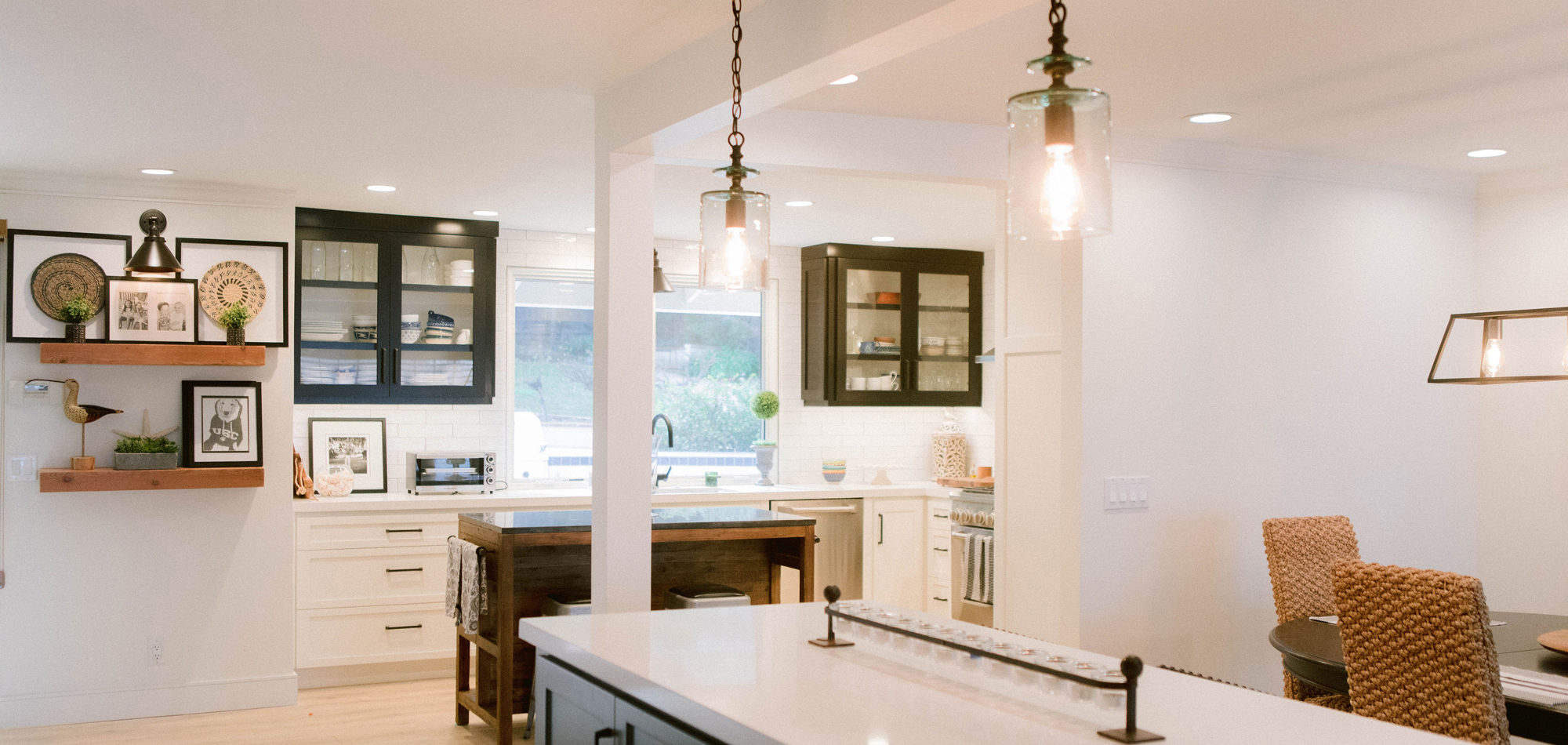 As with most of our projects, we began laying out the space and created a furniture plan. We planned to take down one wall and a portion of another. As some supports were structural and could not be moved, we needed to be creative in our approach. We used a wood furniture piece as an island in the kitchen and combined a classic white and black color scheme. In the area that separated the dining and living room, we designed a large built-in bar island that worked well for entertaining. All the living areas were now open to one another creating a fresh, bright look that makes you feel happy when you enter the home.