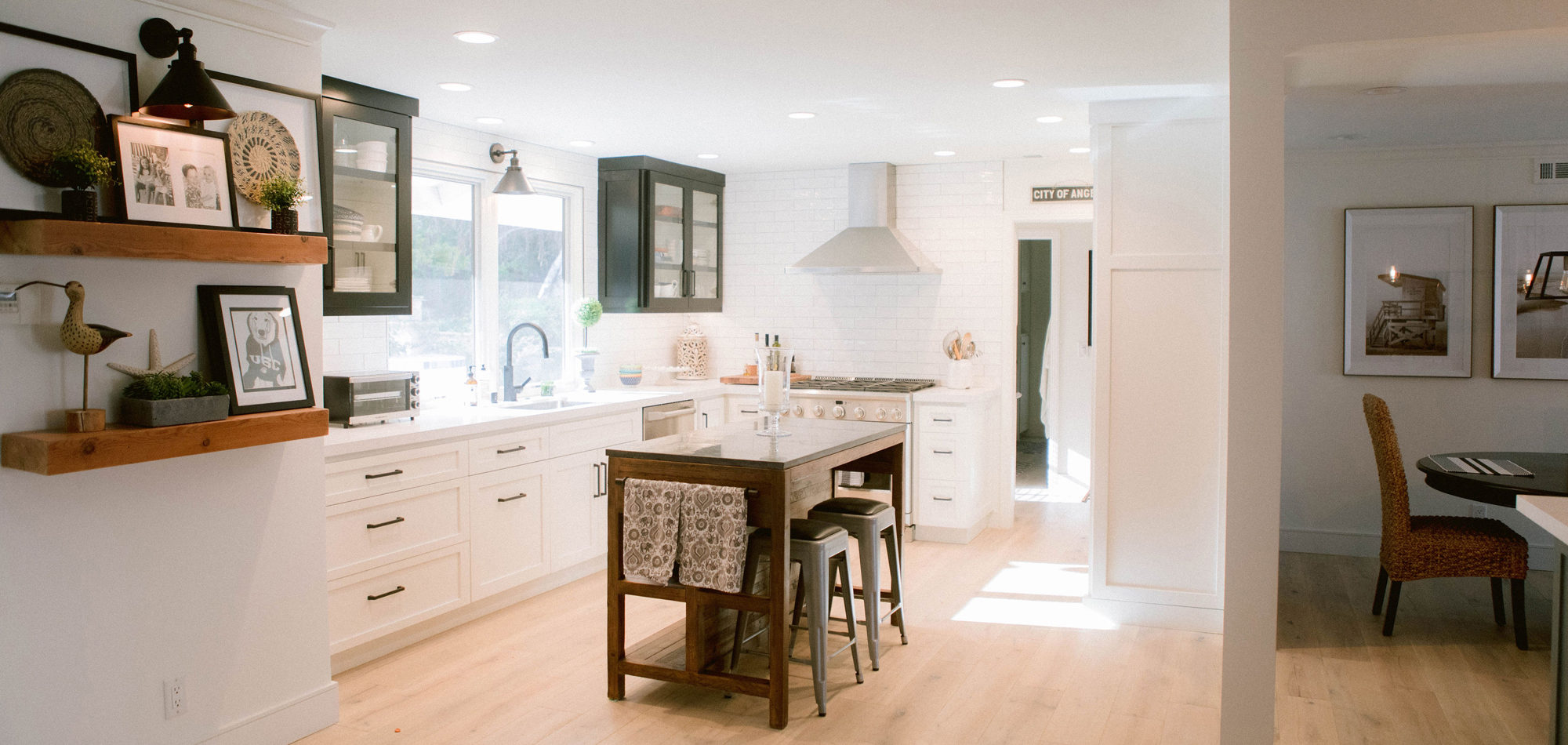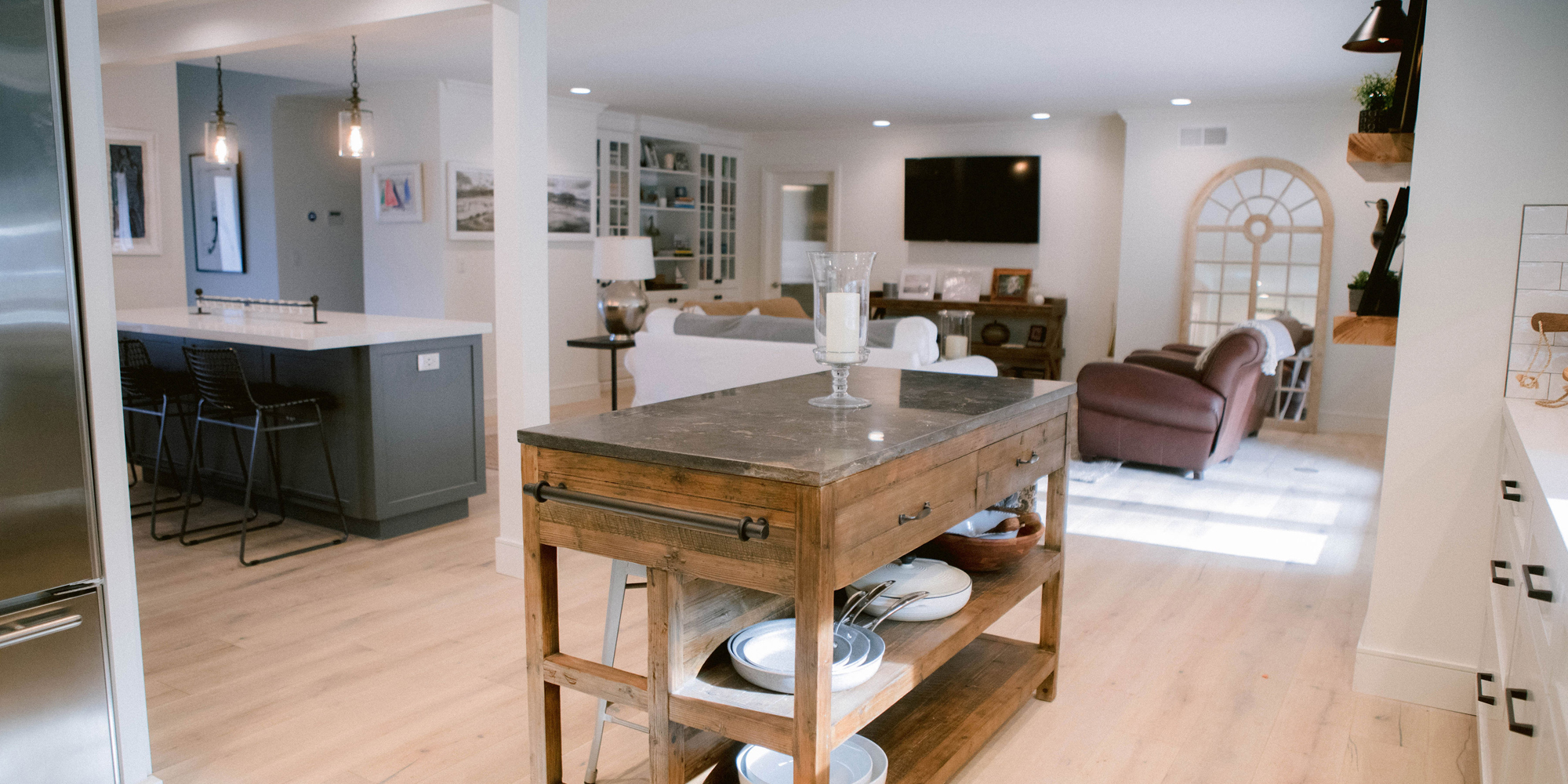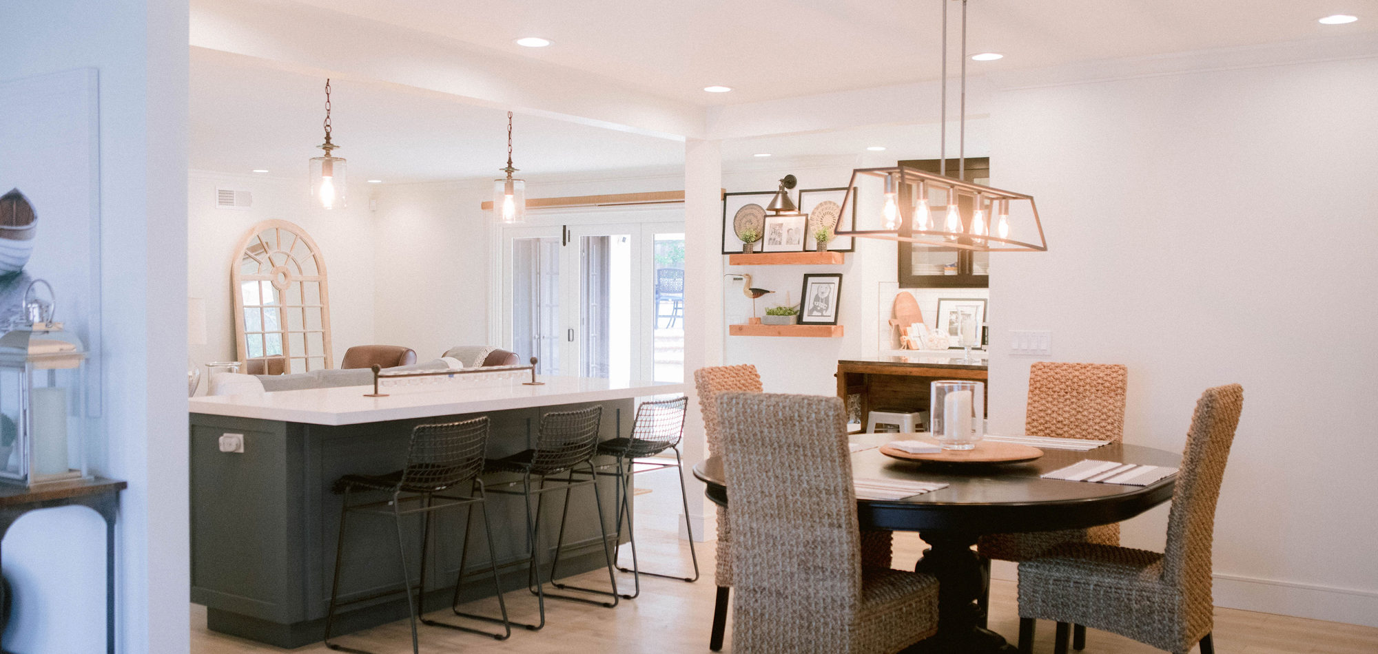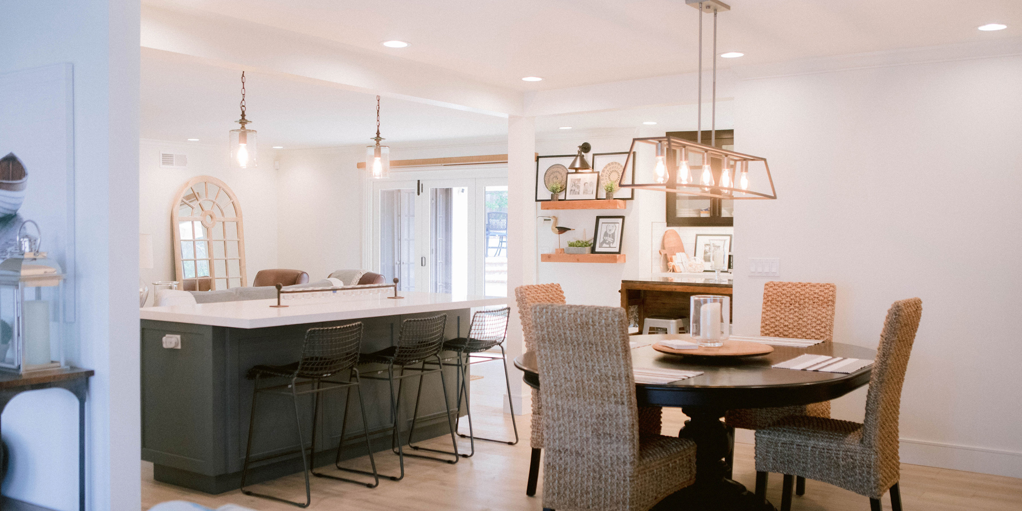 As with most of our projects, we began laying out the space and created a furniture plan. We planned to take down one wall and a portion of another. As some supports were structural and could not be moved, we needed to be creative in our approach. We used a wood furniture piece as an island in the kitchen and combined a classic white and black color scheme. In the area that separated the dining and living room, we designed a large built-in bar island that worked well for entertaining. All the living areas were now open to one another creating a fresh, bright look that makes you feel happy when you enter the home.