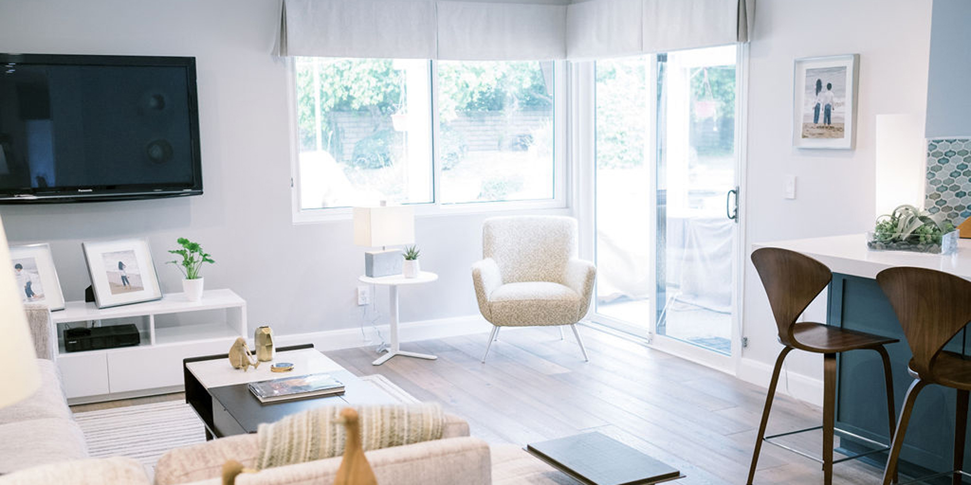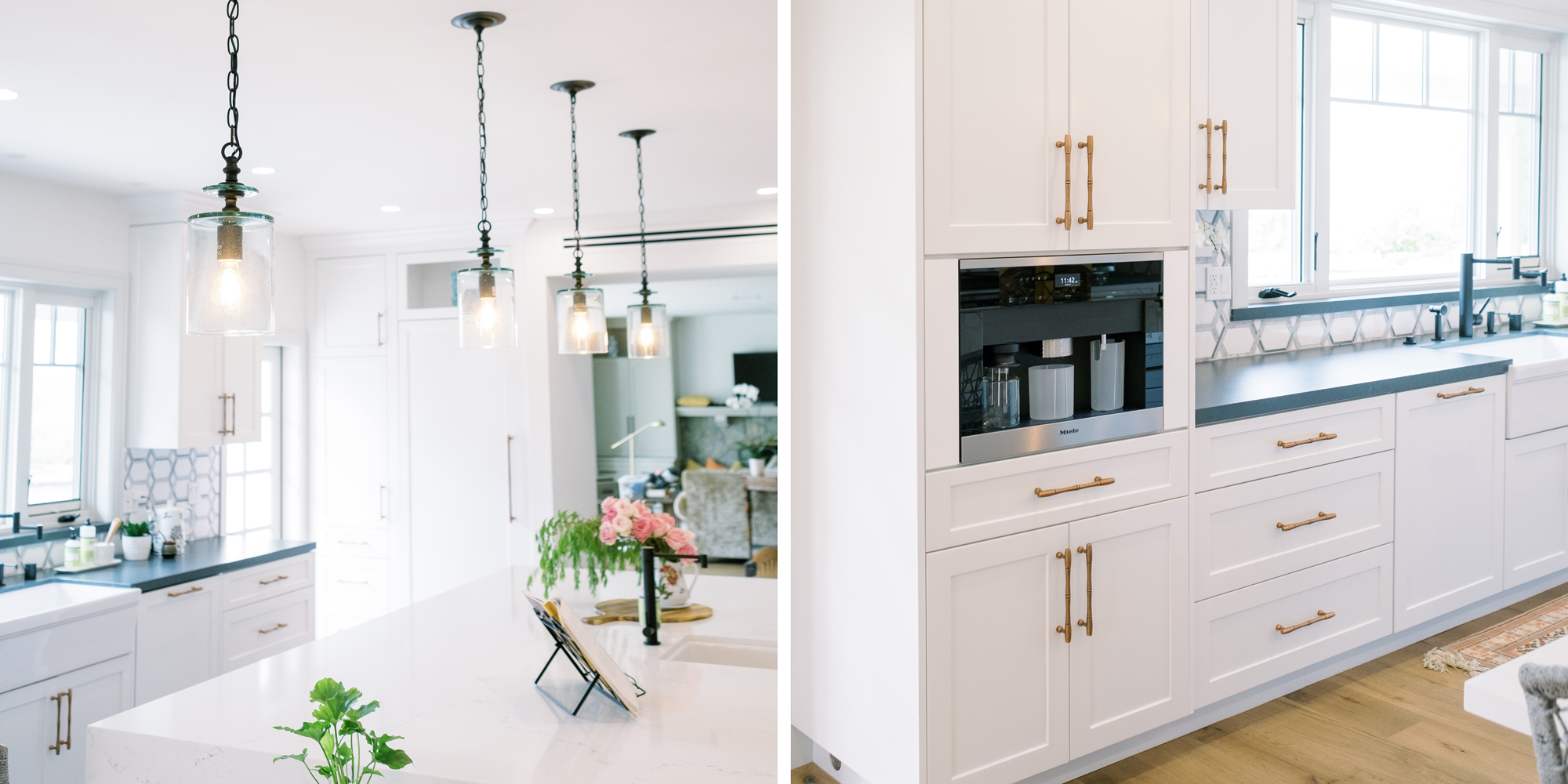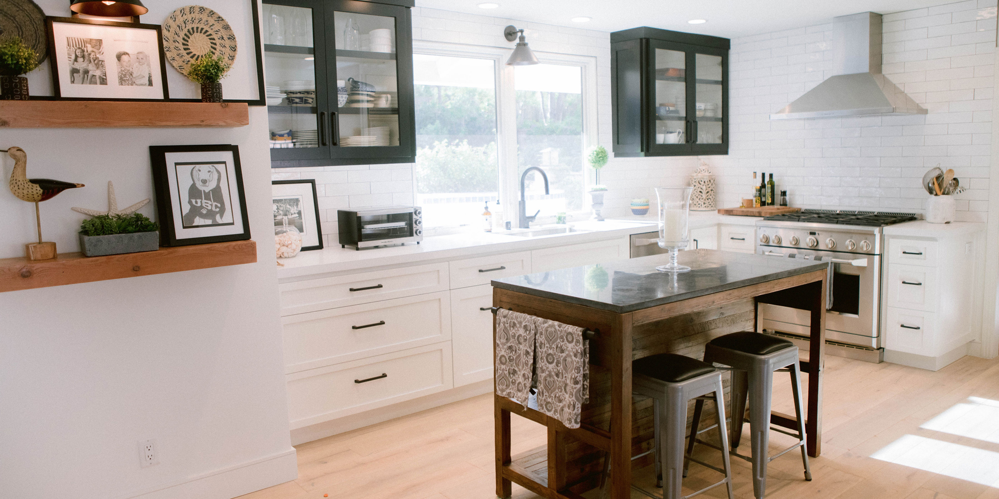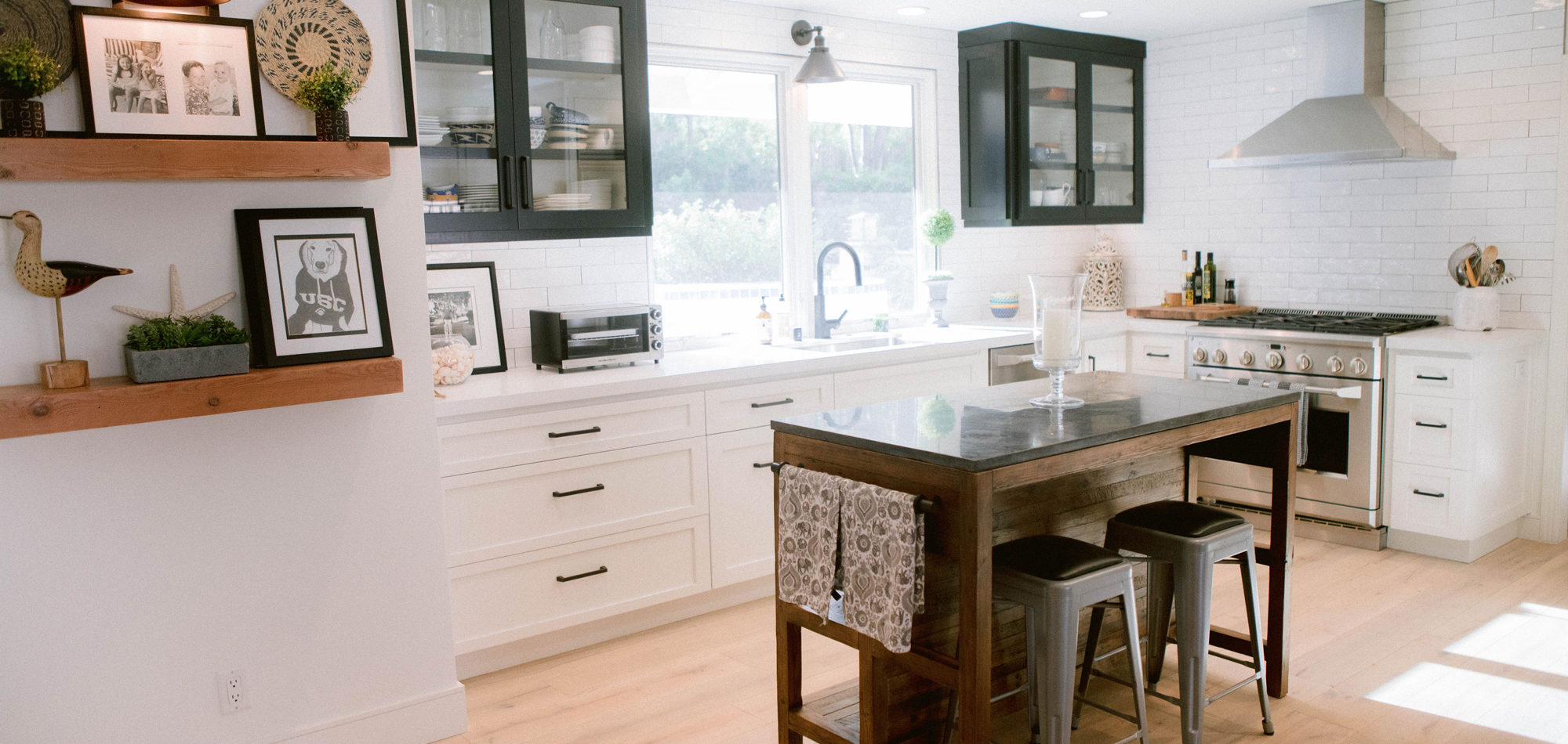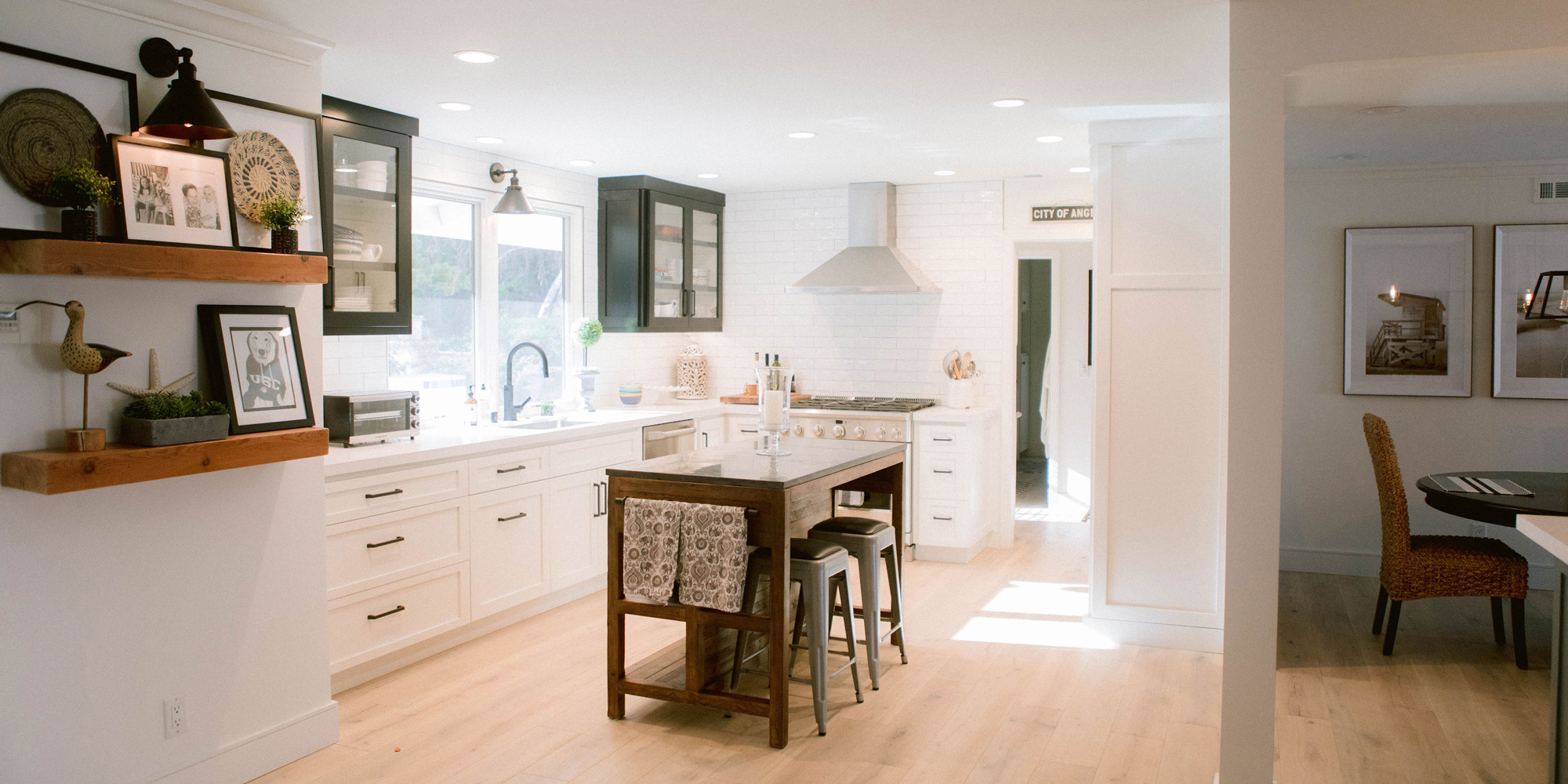 As with most of our projects, we began laying out the space and created a furniture plan. We planned to take down one wall and a portion of another. As some supports were structural and could not be moved, we needed to be creative in our approach. We used a wood furniture piece as an island in the kitchen and combined a classic white and black color scheme. In the area that separated the dining and living room, we designed a large built-in bar island that worked well for entertaining. All the living areas were now open to one another creating a fresh, bright look that makes you feel happy when you enter the home.