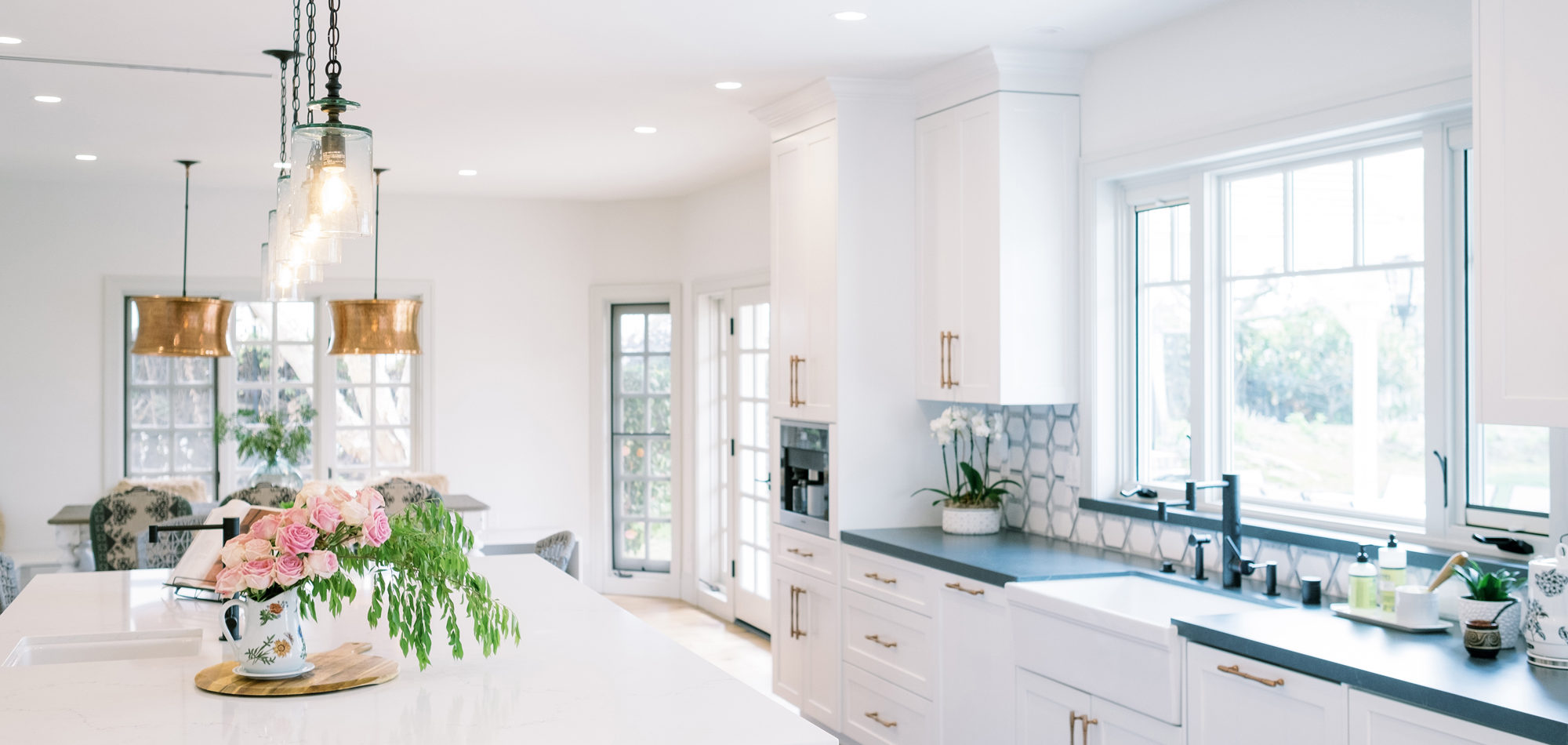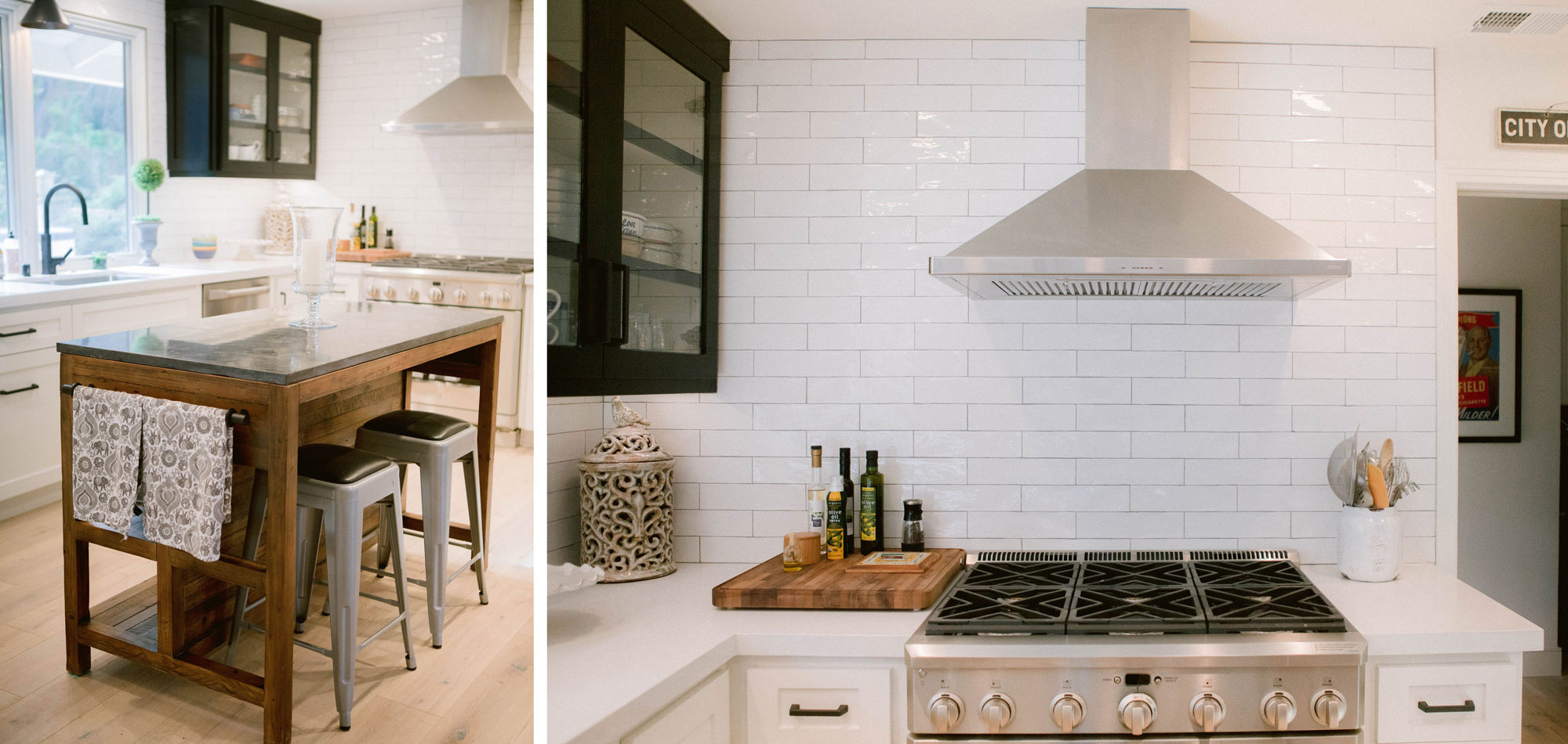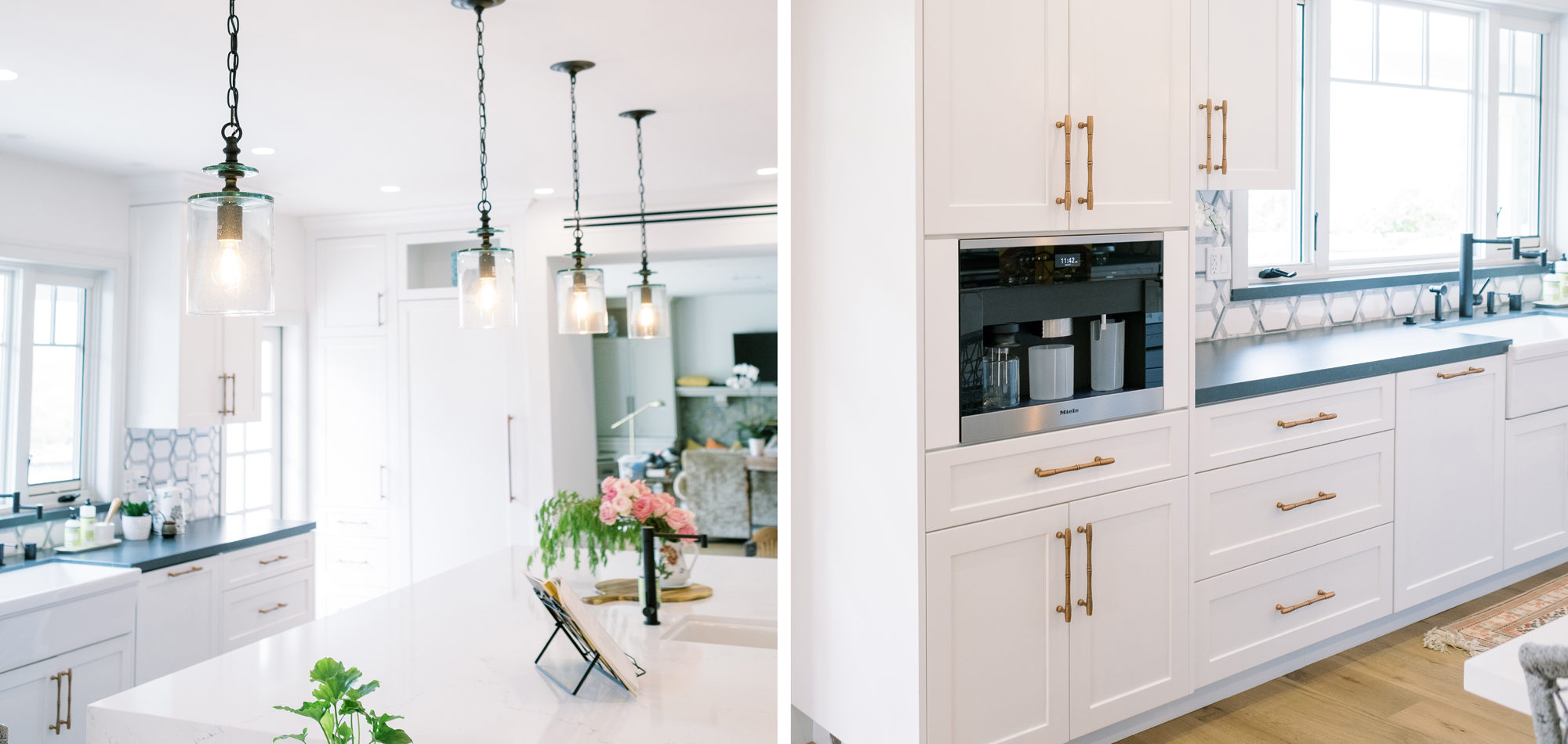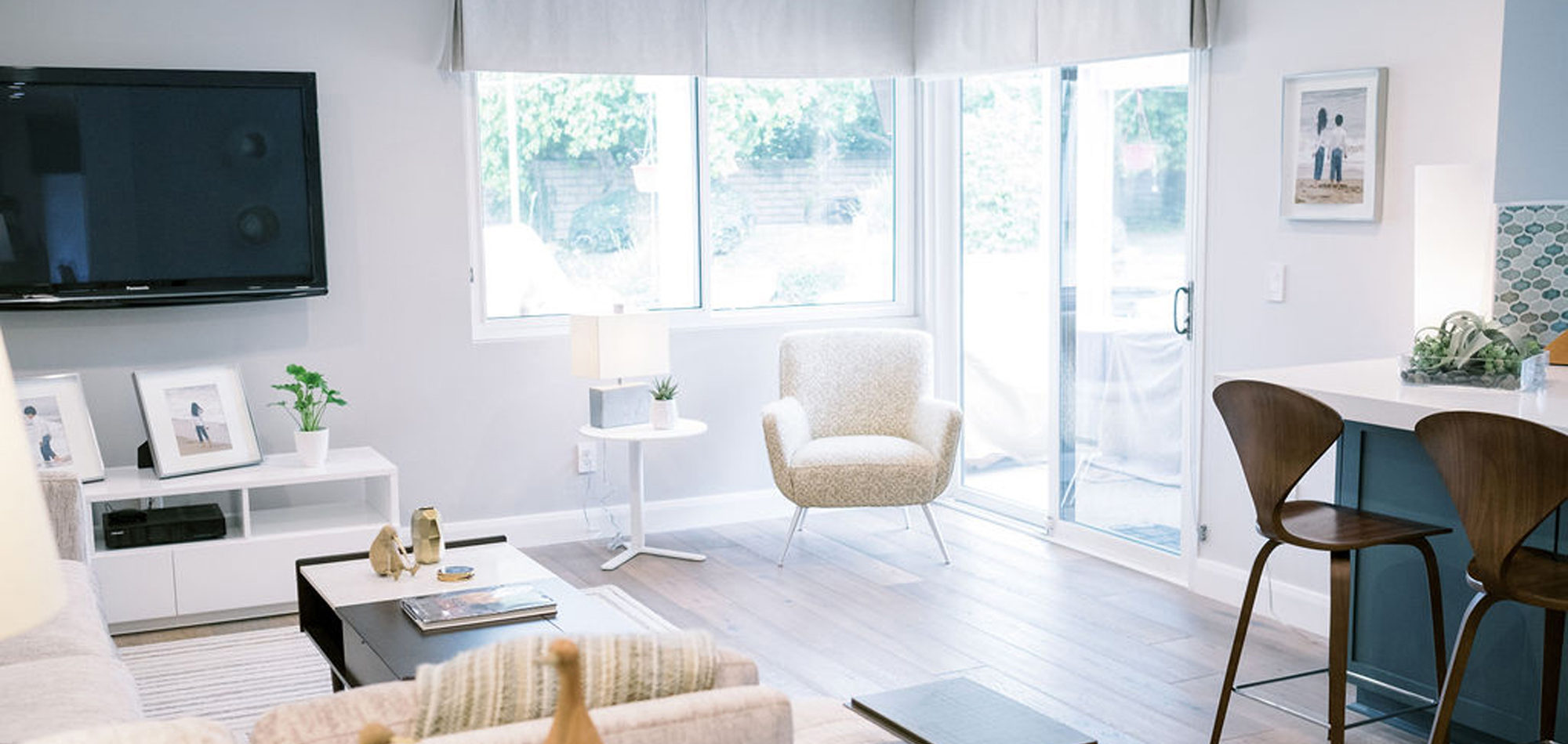 As with most of our projects, we began laying out the space and created a furniture plan. We planned to take down one wall and a portion of another. As some supports were structural and could not be moved, we needed to be creative in our approach. We used a wood furniture piece as an island in the kitchen and combined a classic white and black color scheme. In the area that separated the dining and living room, we designed a large built-in bar island that worked well for entertaining. All the living areas were now open to one another creating a fresh, bright look that makes you feel happy when you enter the home.