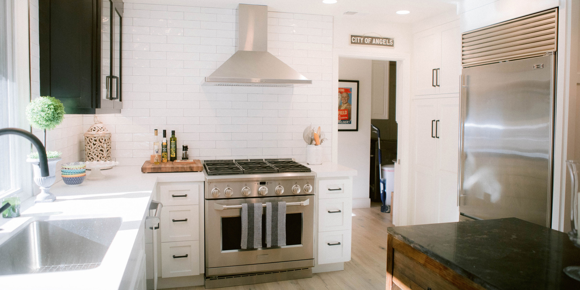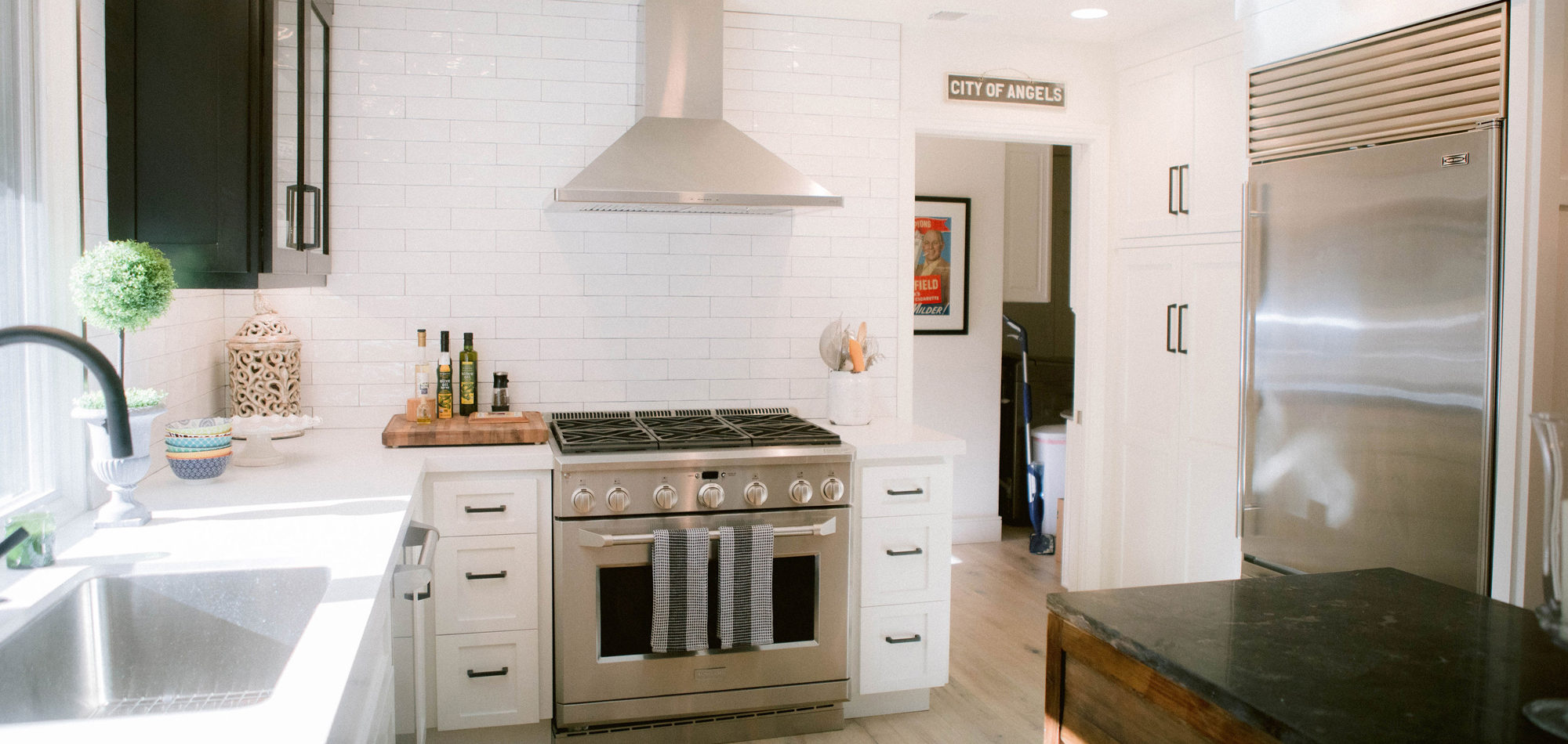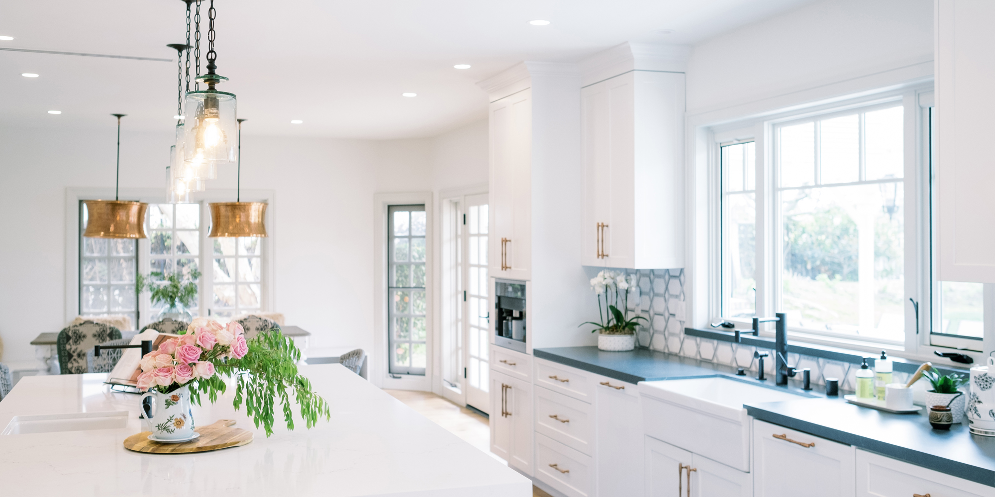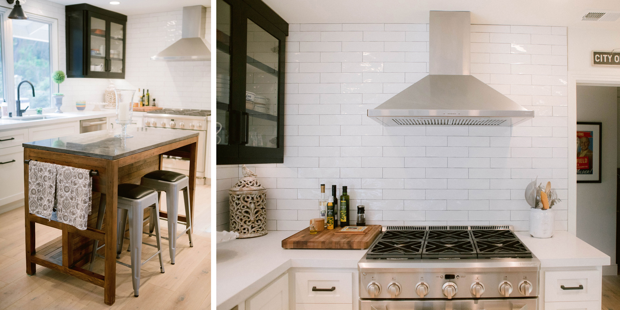 As with most of our projects, we began laying out the space and created a furniture plan. We planned to take down one wall and a portion of another. As some supports were structural and could not be moved, we needed to be creative in our approach. We used a wood furniture piece as an island in the kitchen and combined a classic white and black color scheme. In the area that separated the dining and living room, we designed a large built-in bar island that worked well for entertaining. All the living areas were now open to one another creating a fresh, bright look that makes you feel happy when you enter the home.