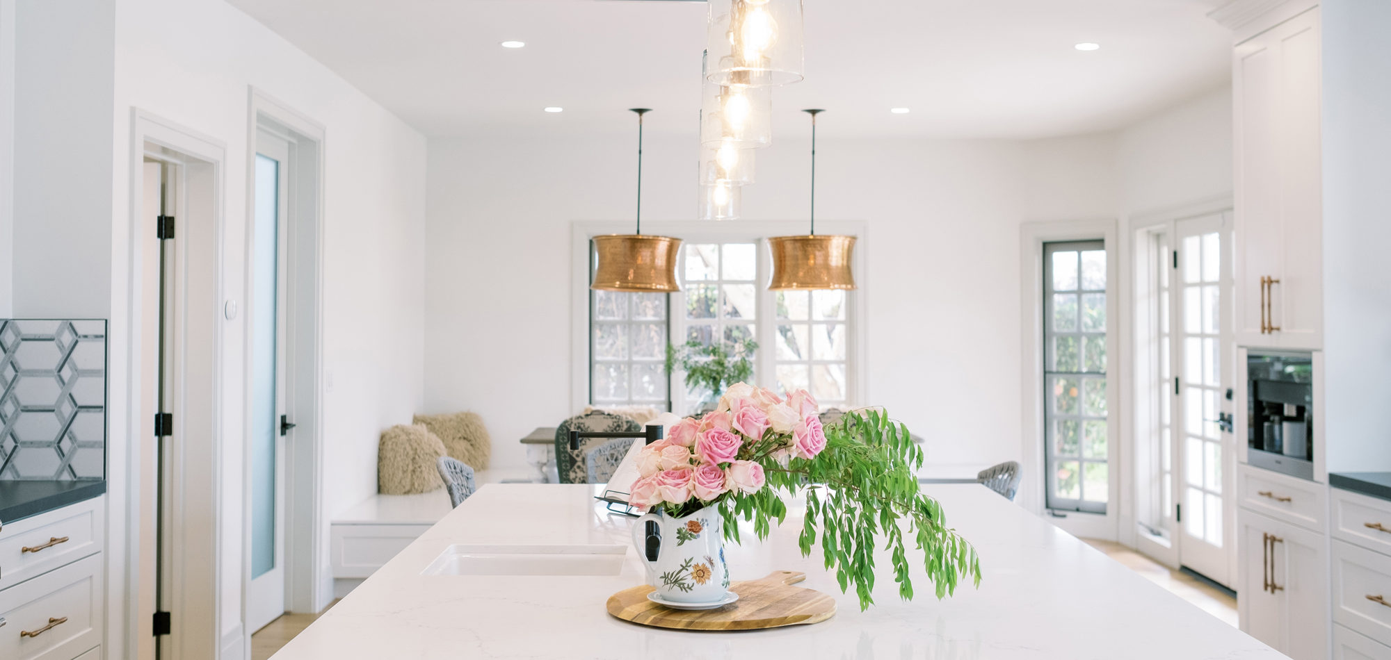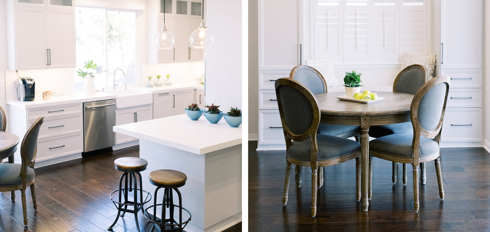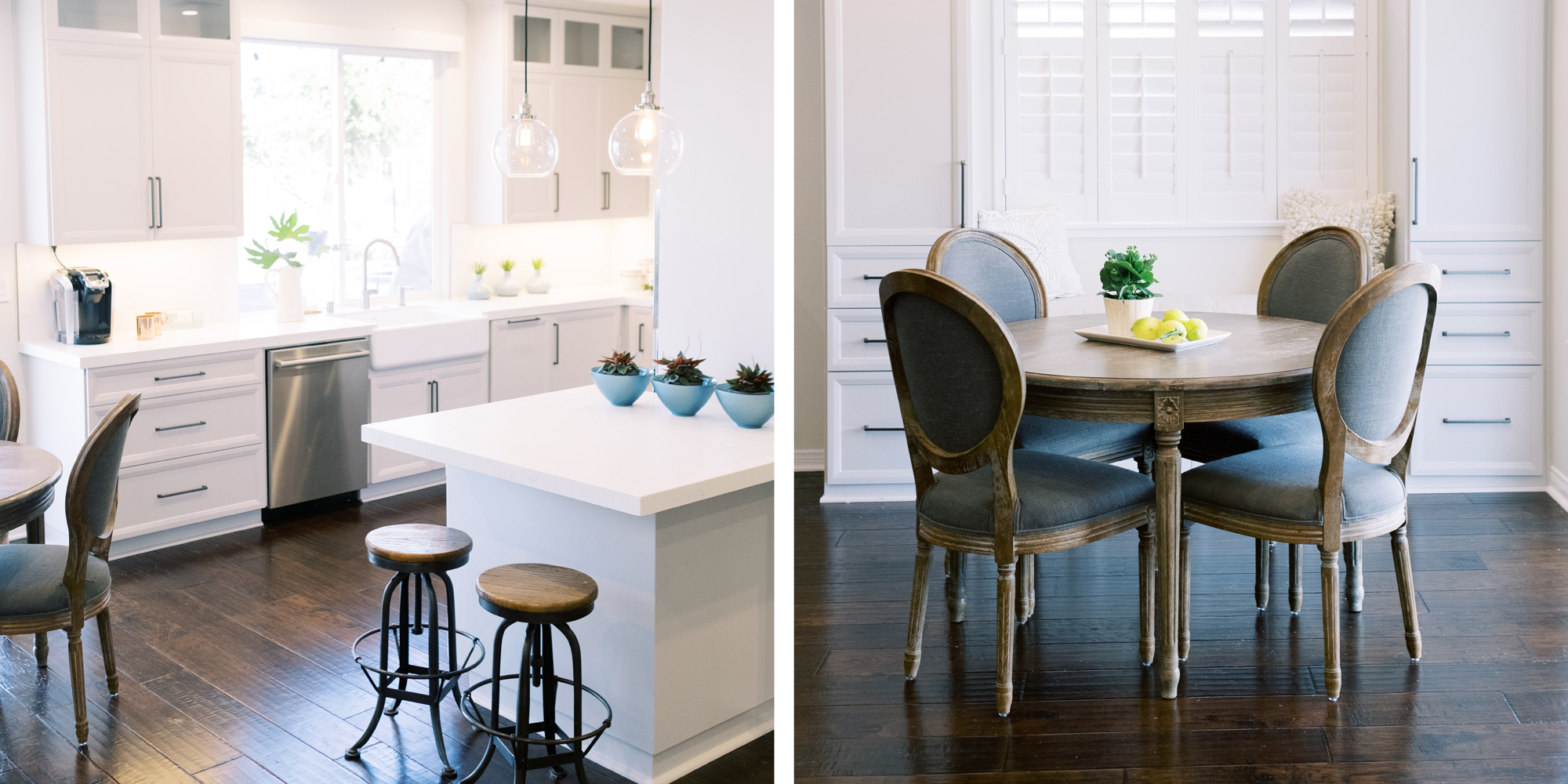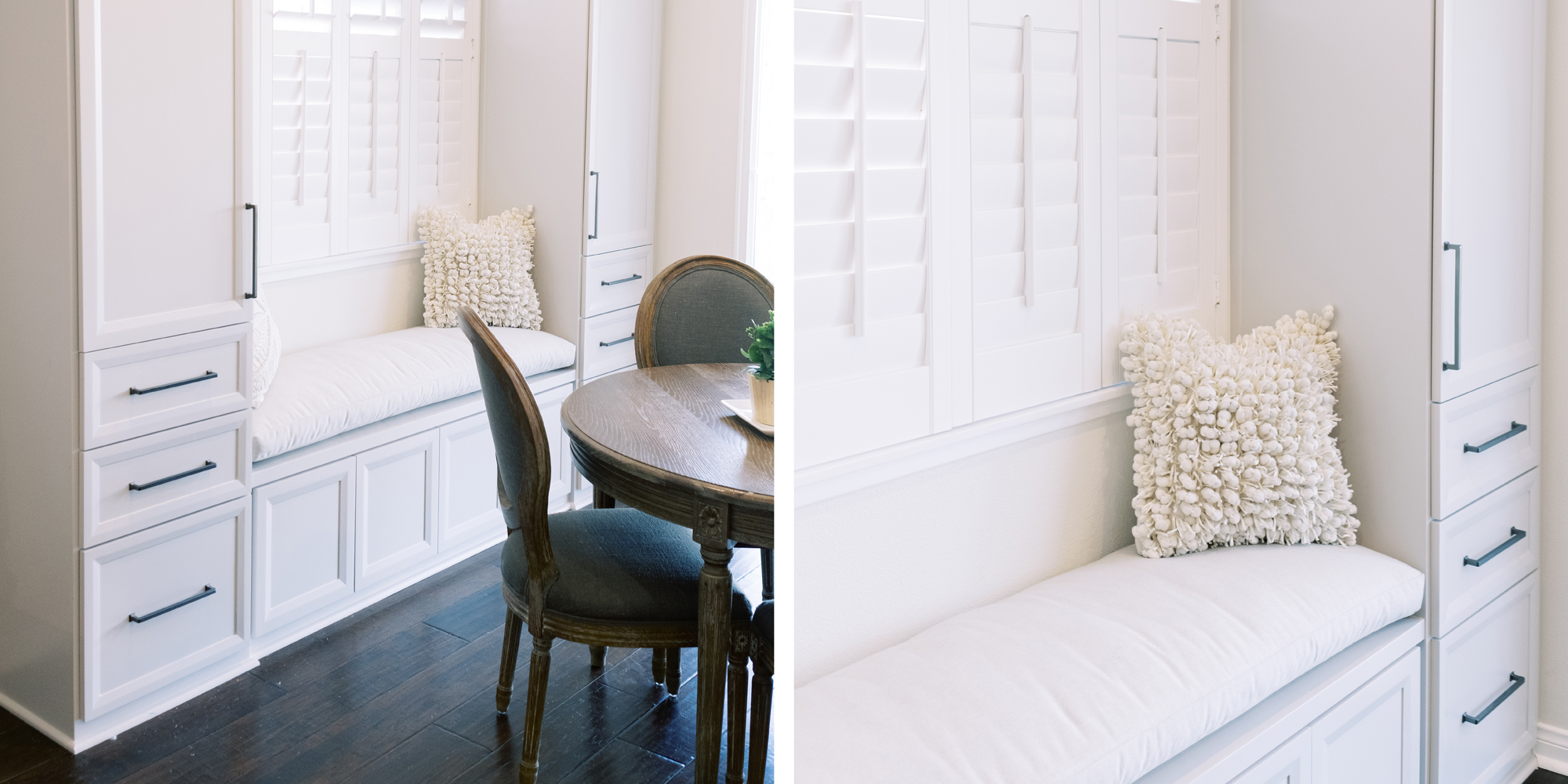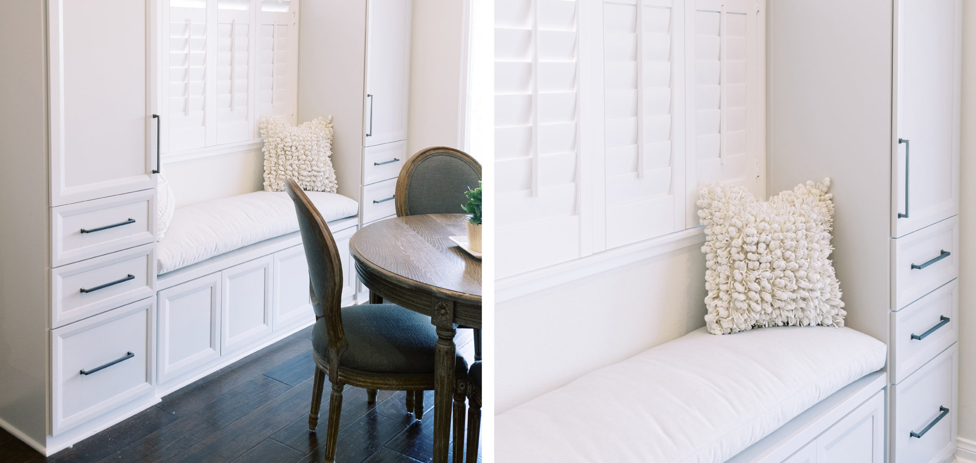 This was a phase 2 project for this fun-loving couple who wanted to update and modernize their kitchen. Our clients love white and an uncluttered design. We wanted to deliver a look that would support their young family. We began by removing the bulkheads and taking the cabinets to the ceiling, then installed stacked cabinets with glass inserts on the top portion to make the kitchen appear larger and more open. Large cabinet pulls were added as a little modern jewelry. A custom built-in hood was designed to create a striking feature on a somewhat small wall area. There was formerly an underused cabinet in the breakfast area which we redesigned to include a window seat with flanking cabinets on either side and storage below. These cabinets now house toys and items for crafts projects for the girls. The space is now functional and feels fresh and current.