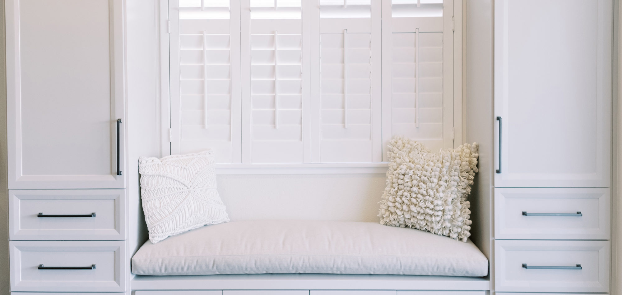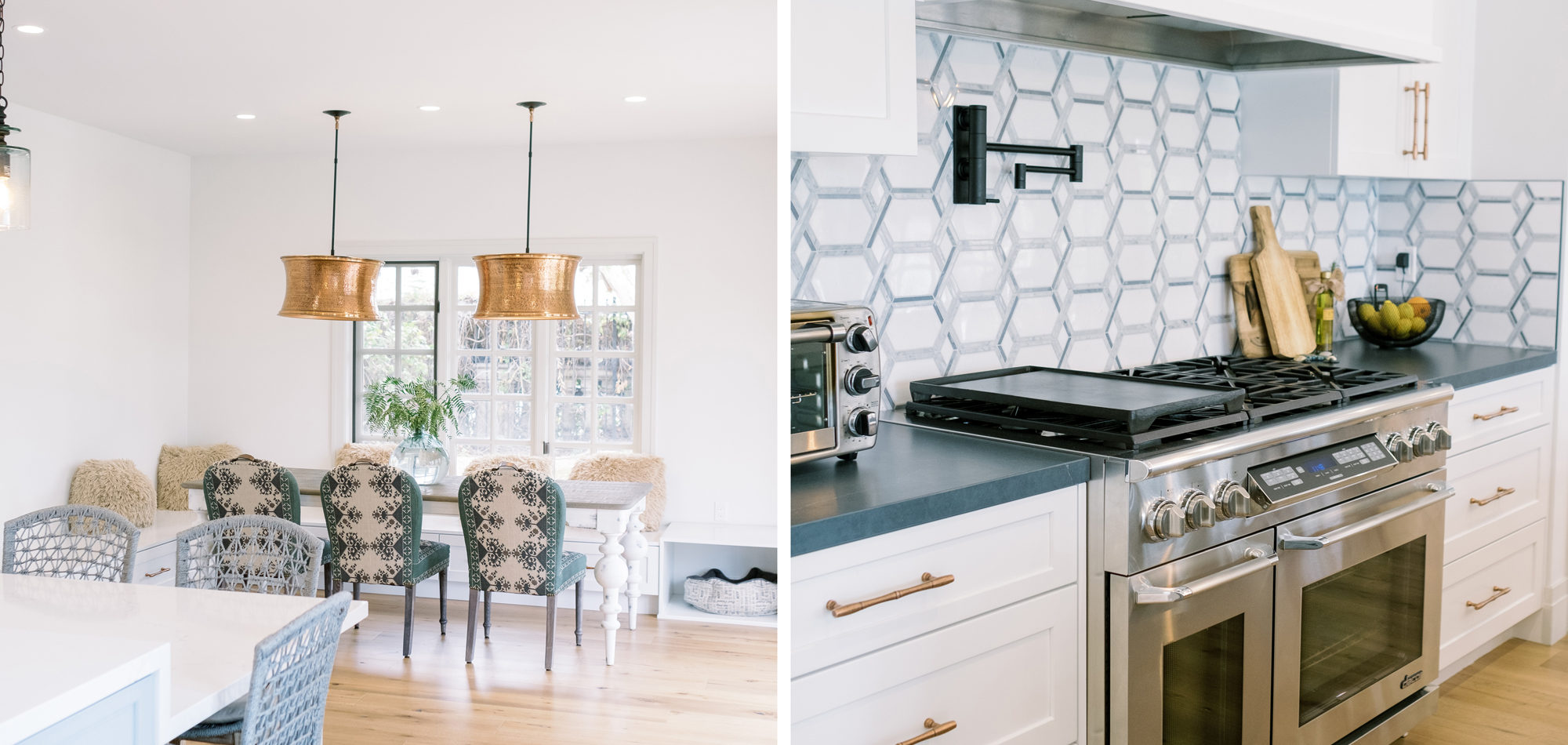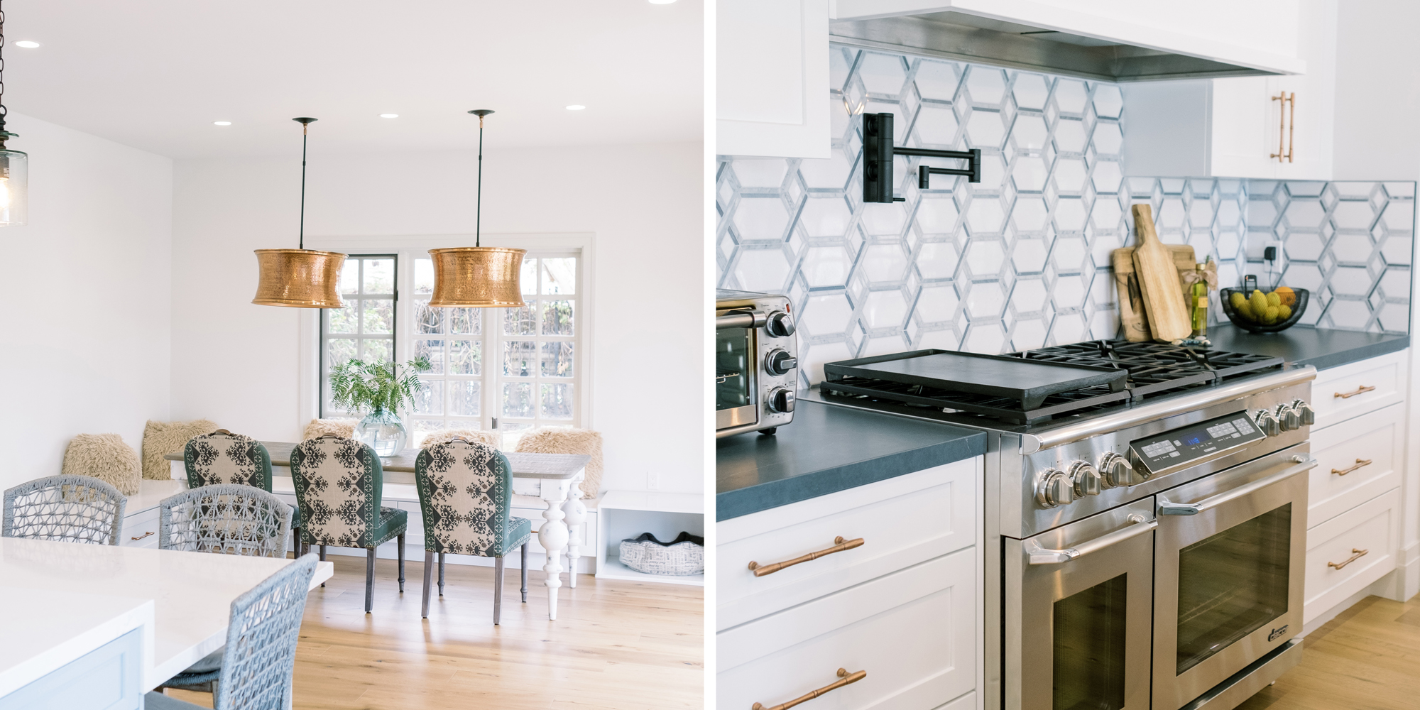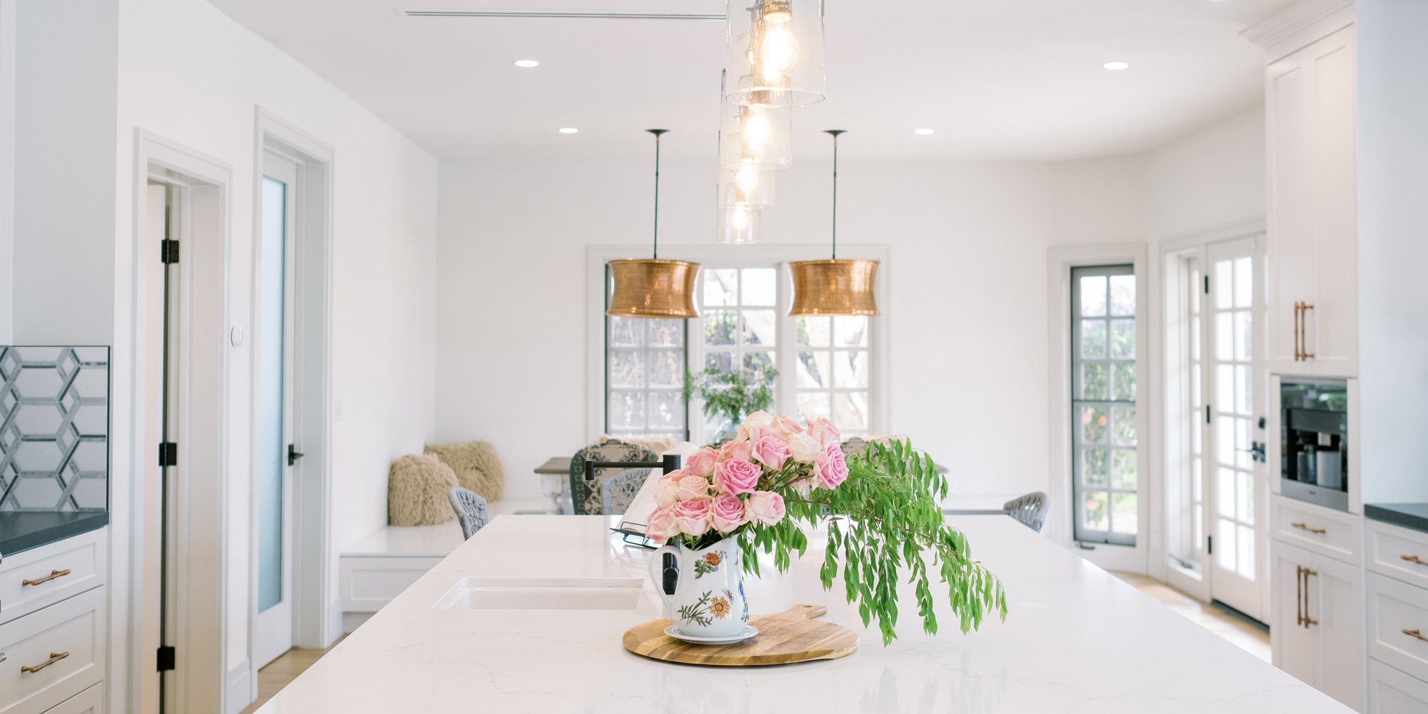 This was a phase 2 project for this fun-loving couple who wanted to update and modernize their kitchen. Our clients love white and an uncluttered design. We wanted to deliver a look that would support their young family. We began by removing the bulkheads and taking the cabinets to the ceiling, then installed stacked cabinets with glass inserts on the top portion to make the kitchen appear larger and more open. Large cabinet pulls were added as a little modern jewelry. A custom built-in hood was designed to create a striking feature on a somewhat small wall area. There was formerly an underused cabinet in the breakfast area which we redesigned to include a window seat with flanking cabinets on either side and storage below. These cabinets now house toys and items for crafts projects for the girls. The space is now functional and feels fresh and current.