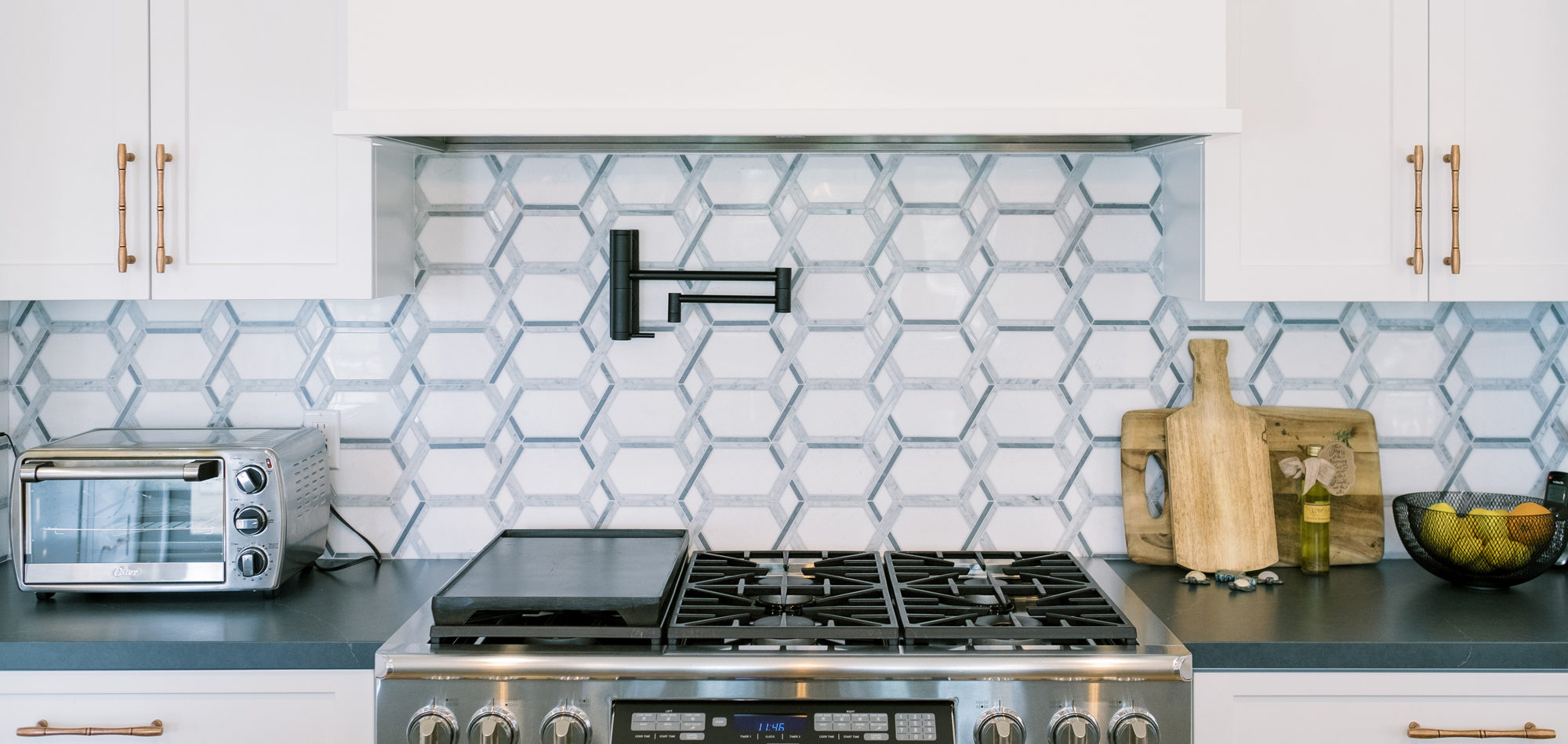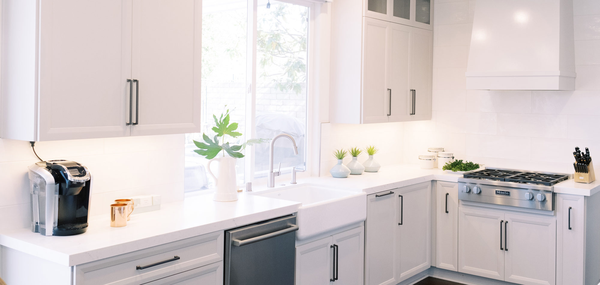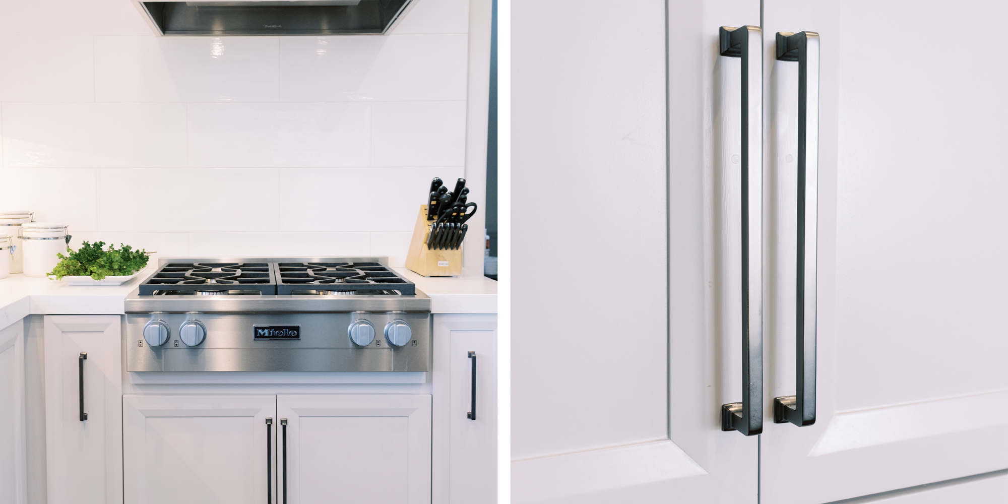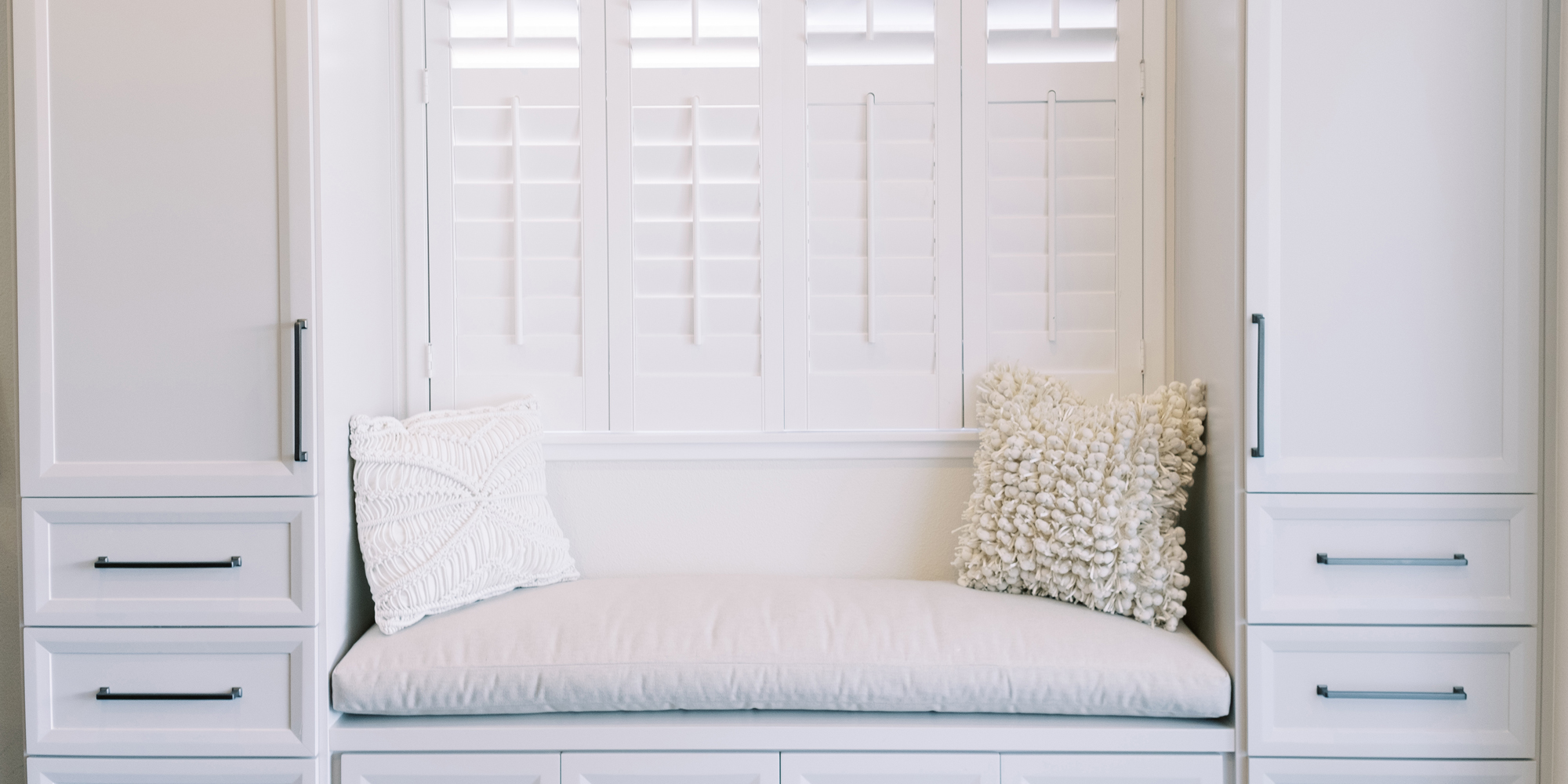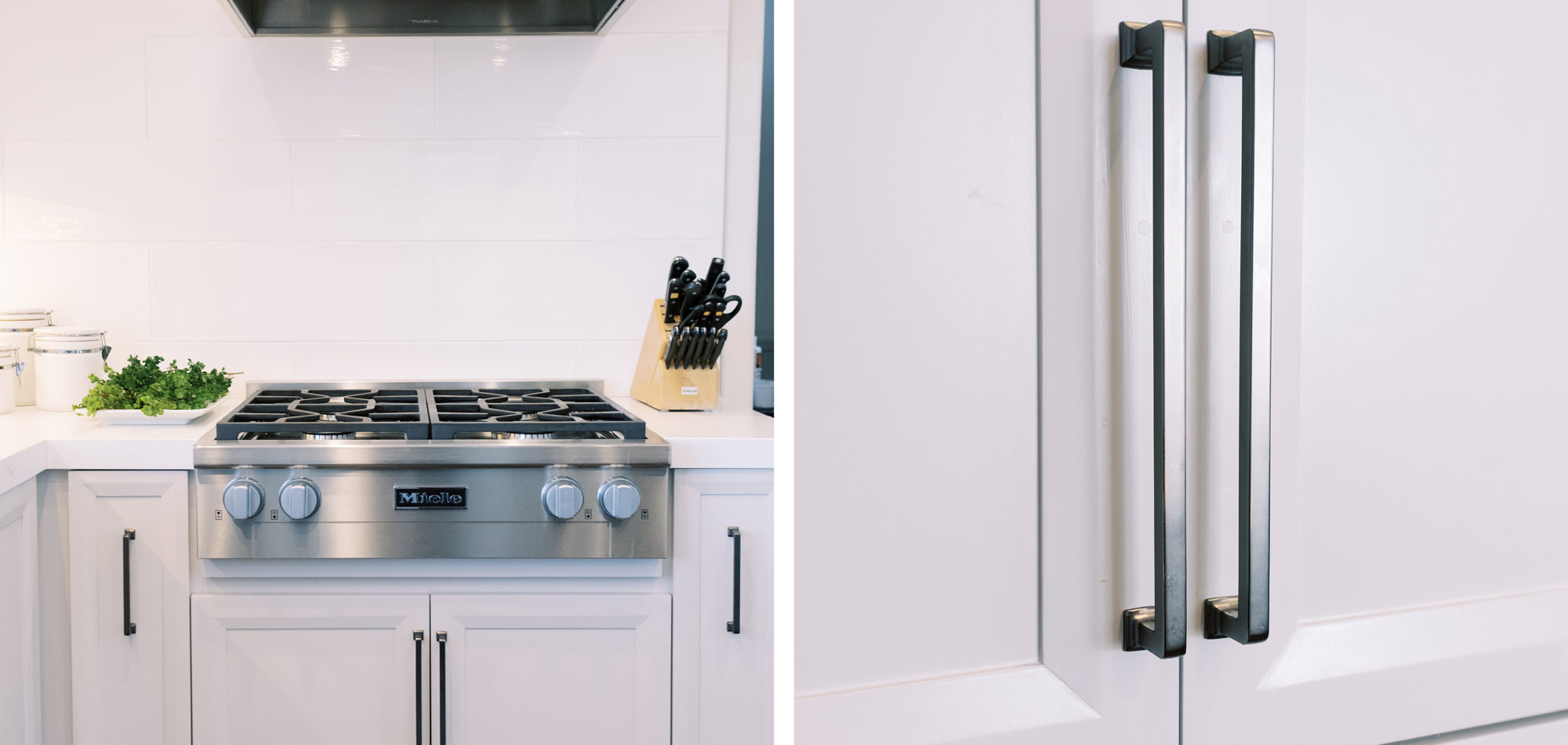 This was a phase 2 project for this fun-loving couple who wanted to update and modernize their kitchen. Our clients love white and an uncluttered design. We wanted to deliver a look that would support their young family. We began by removing the bulkheads and taking the cabinets to the ceiling, then installed stacked cabinets with glass inserts on the top portion to make the kitchen appear larger and more open. Large cabinet pulls were added as a little modern jewelry. A custom built-in hood was designed to create a striking feature on a somewhat small wall area. There was formerly an underused cabinet in the breakfast area which we redesigned to include a window seat with flanking cabinets on either side and storage below. These cabinets now house toys and items for crafts projects for the girls. The space is now functional and feels fresh and current.