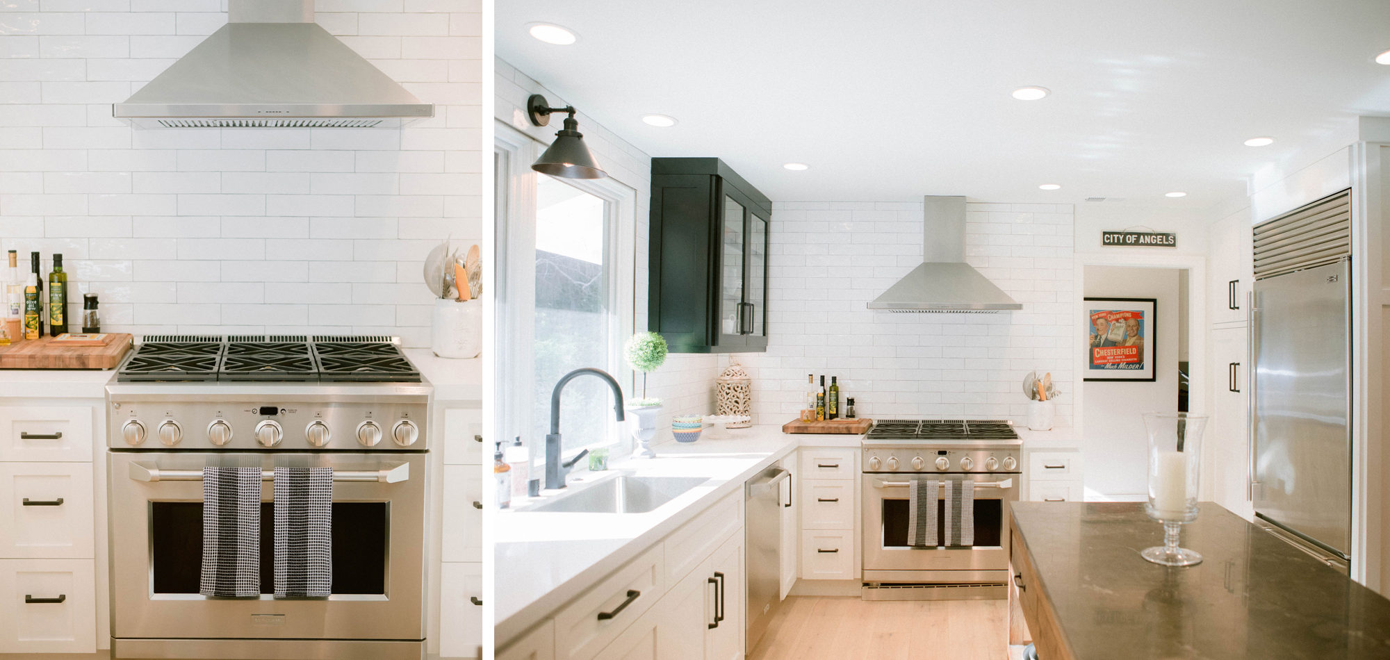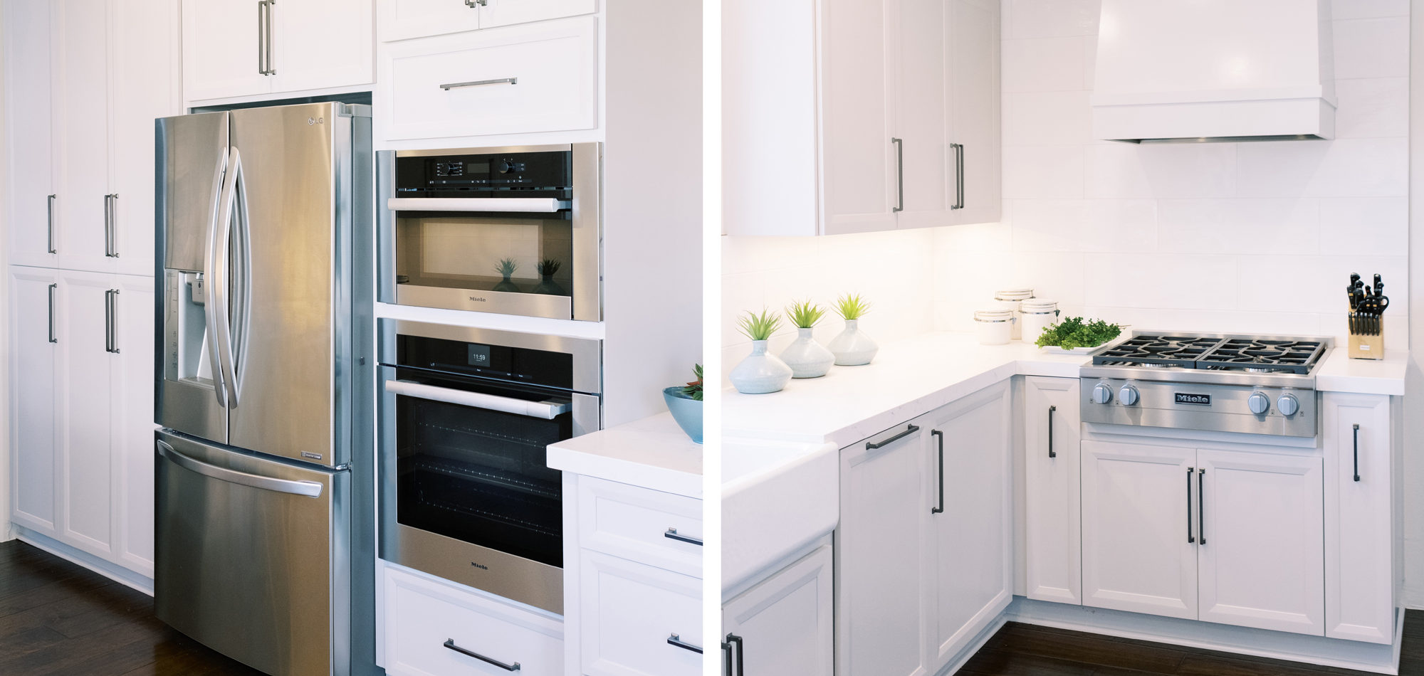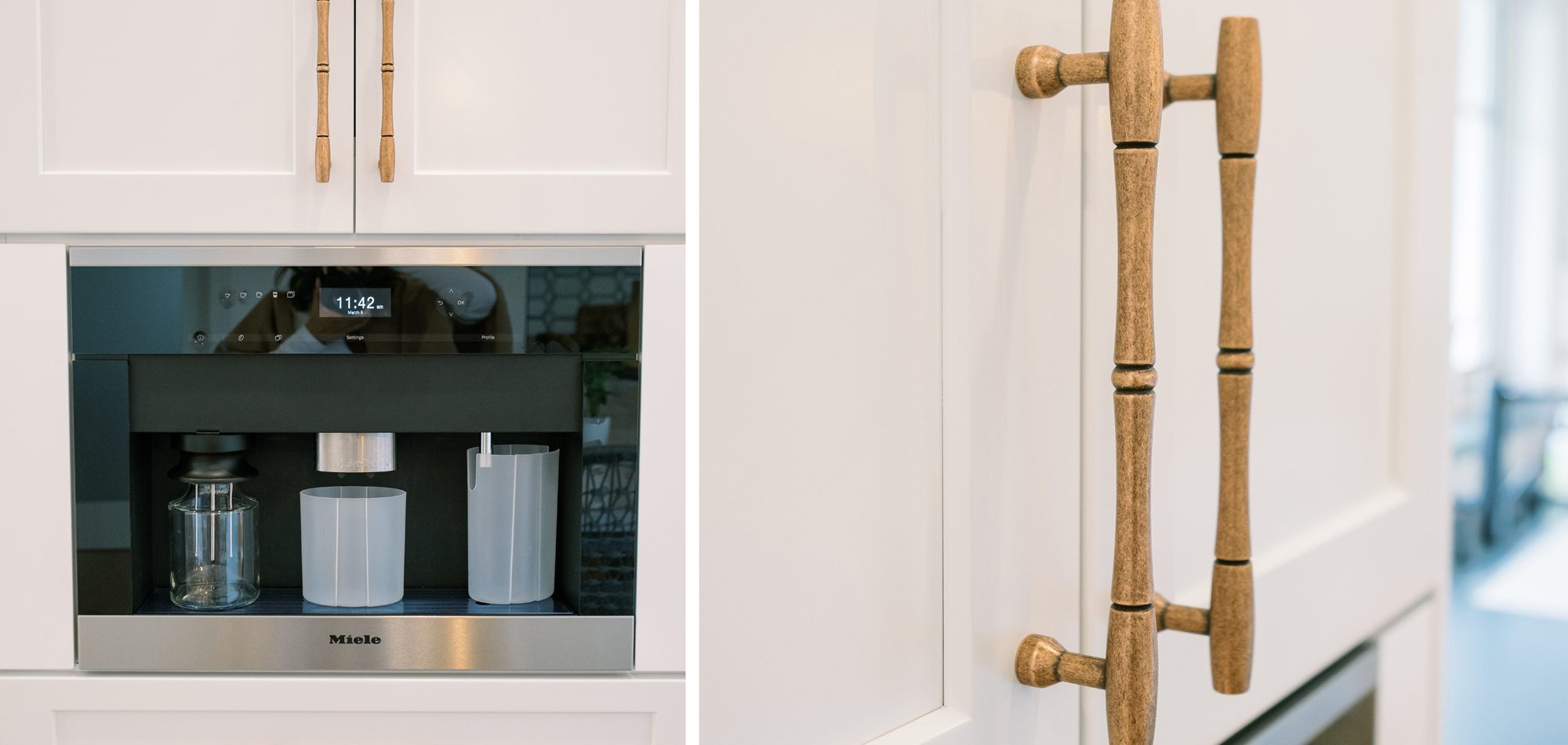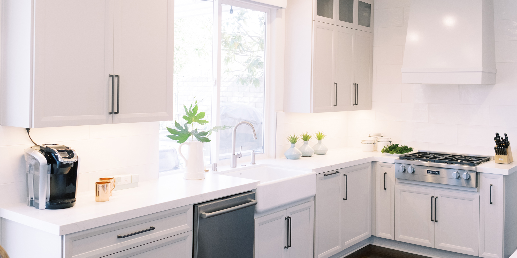 This was a phase 2 project for this fun-loving couple who wanted to update and modernize their kitchen. Our clients love white and an uncluttered design. We wanted to deliver a look that would support their young family. We began by removing the bulkheads and taking the cabinets to the ceiling, then installed stacked cabinets with glass inserts on the top portion to make the kitchen appear larger and more open. Large cabinet pulls were added as a little modern jewelry. A custom built-in hood was designed to create a striking feature on a somewhat small wall area. There was formerly an underused cabinet in the breakfast area which we redesigned to include a window seat with flanking cabinets on either side and storage below. These cabinets now house toys and items for crafts projects for the girls. The space is now functional and feels fresh and current.