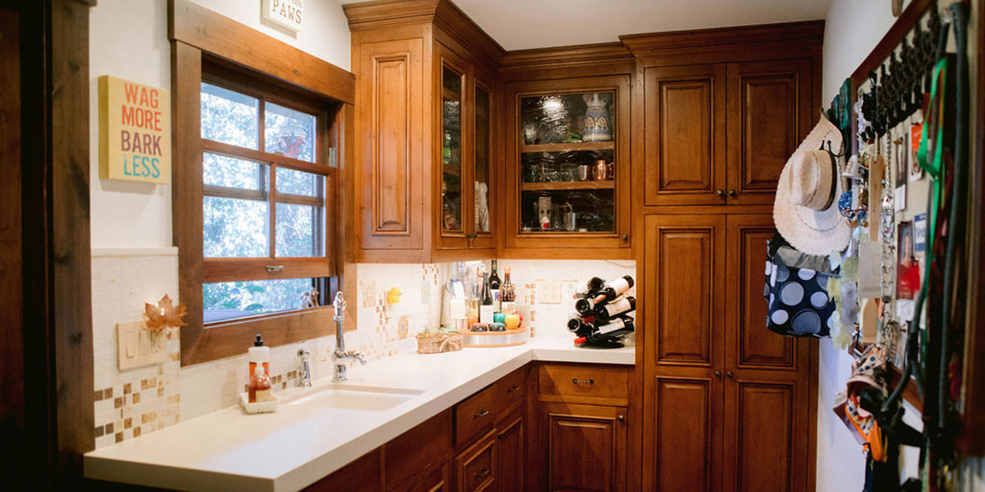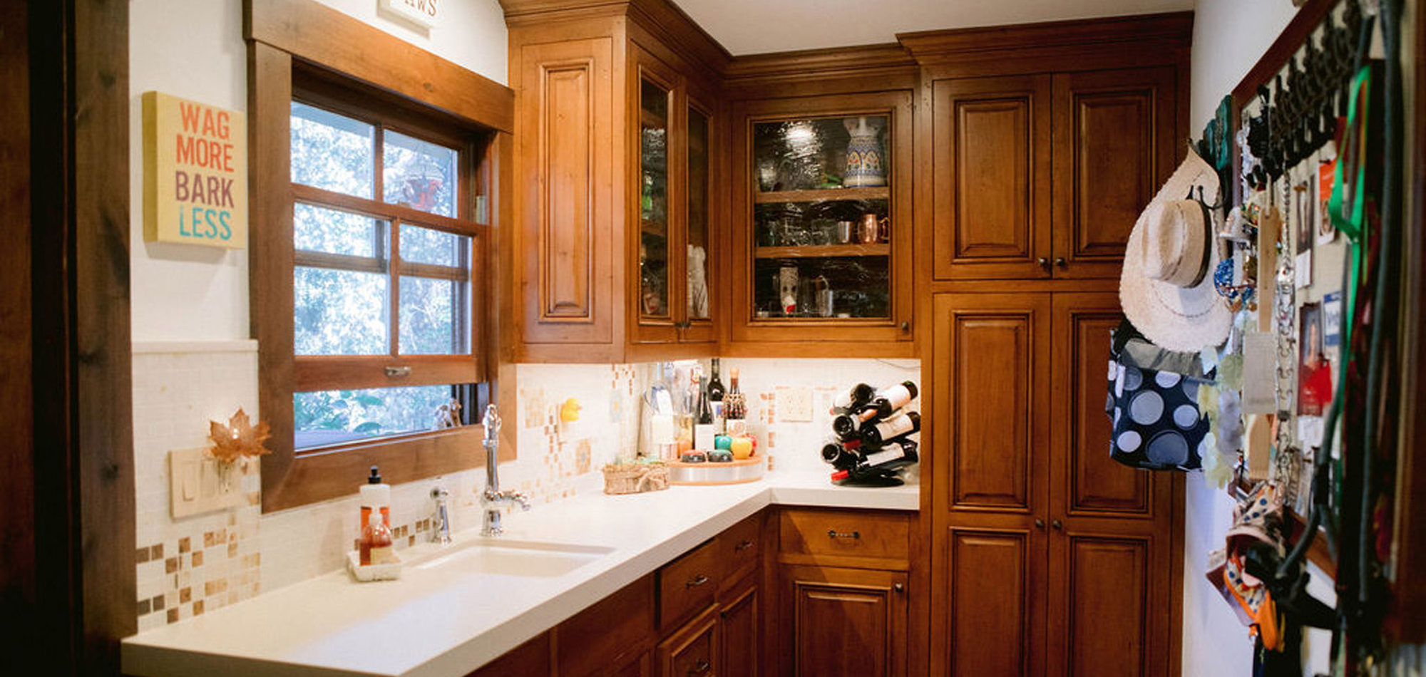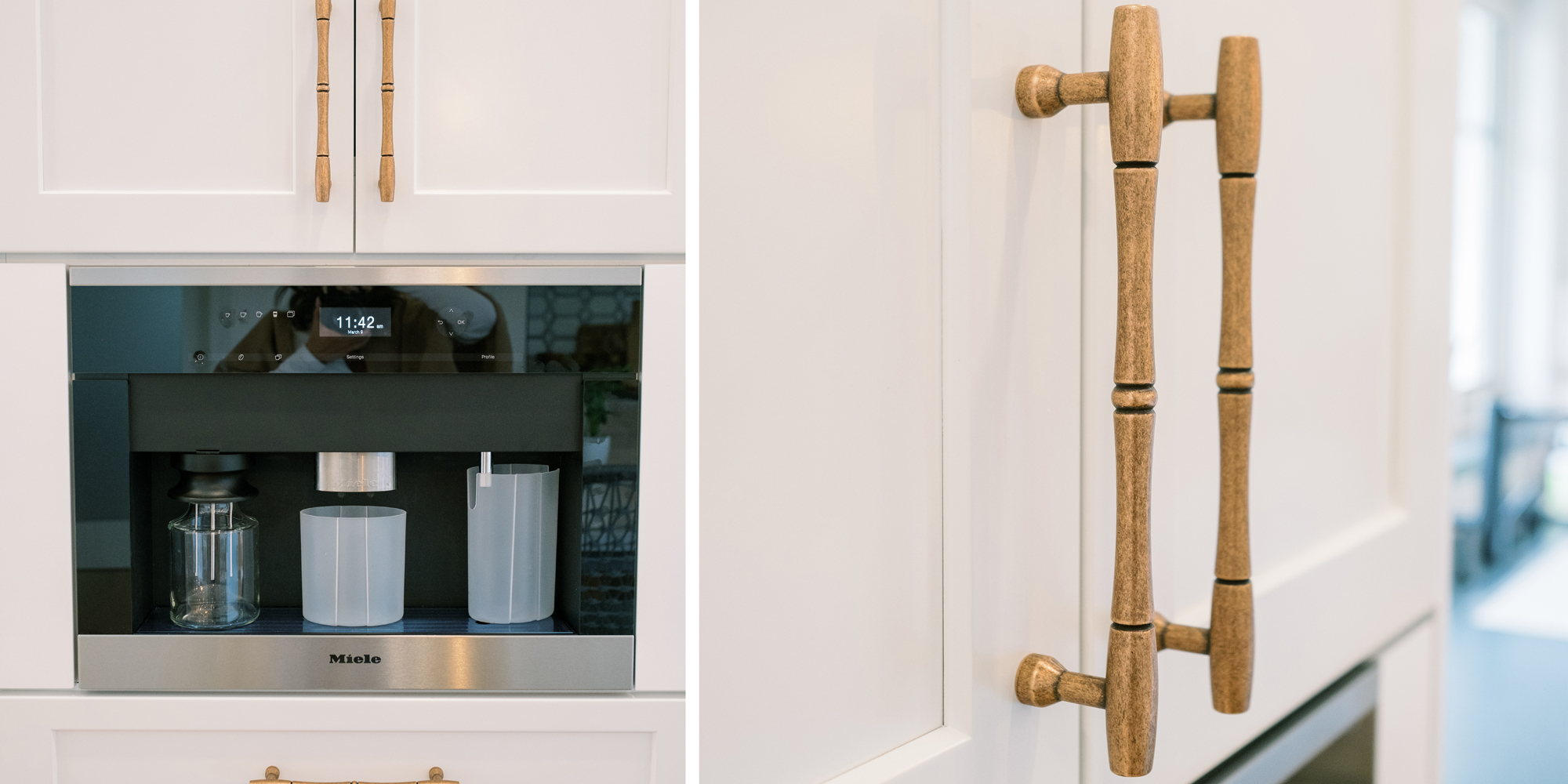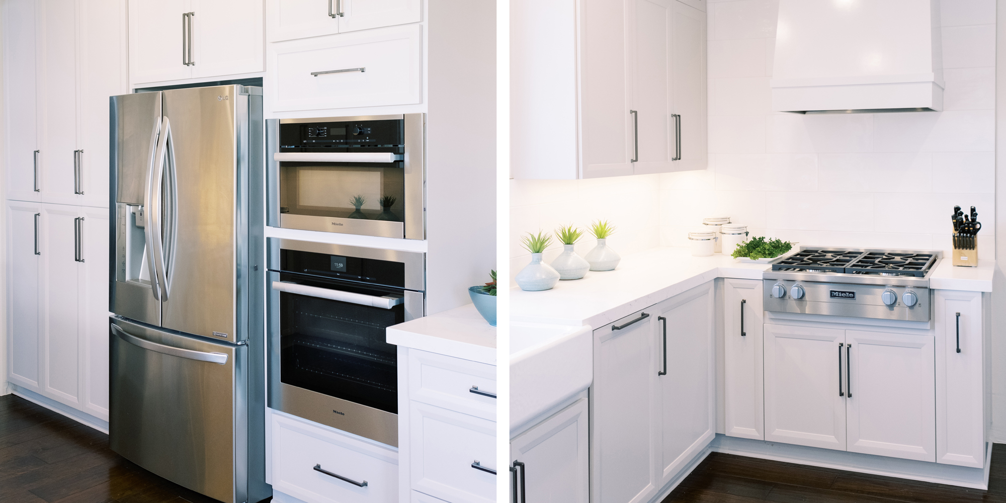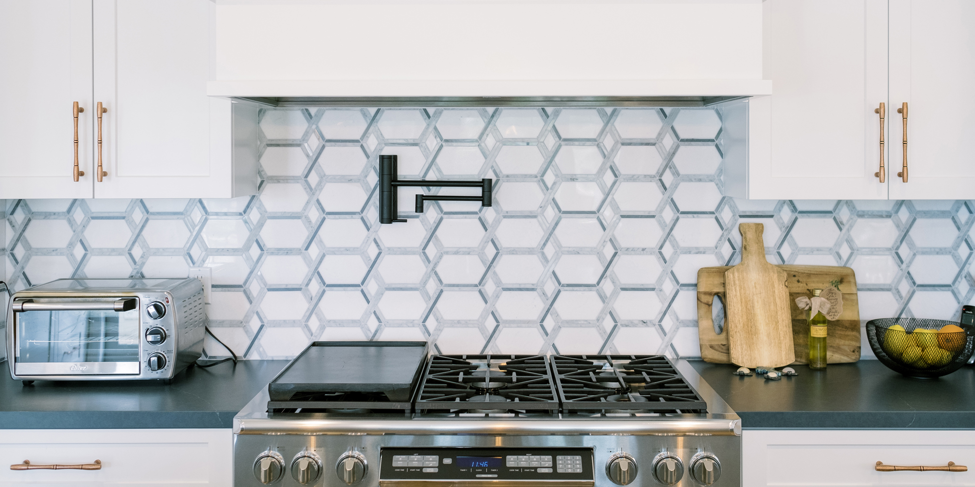 This was a phase 2 project for this fun-loving couple who wanted to update and modernize their kitchen. Our clients love white and an uncluttered design. We wanted to deliver a look that would support their young family. We began by removing the bulkheads and taking the cabinets to the ceiling, then installed stacked cabinets with glass inserts on the top portion to make the kitchen appear larger and more open. Large cabinet pulls were added as a little modern jewelry. A custom built-in hood was designed to create a striking feature on a somewhat small wall area. There was formerly an underused cabinet in the breakfast area which we redesigned to include a window seat with flanking cabinets on either side and storage below. These cabinets now house toys and items for crafts projects for the girls. The space is now functional and feels fresh and current.