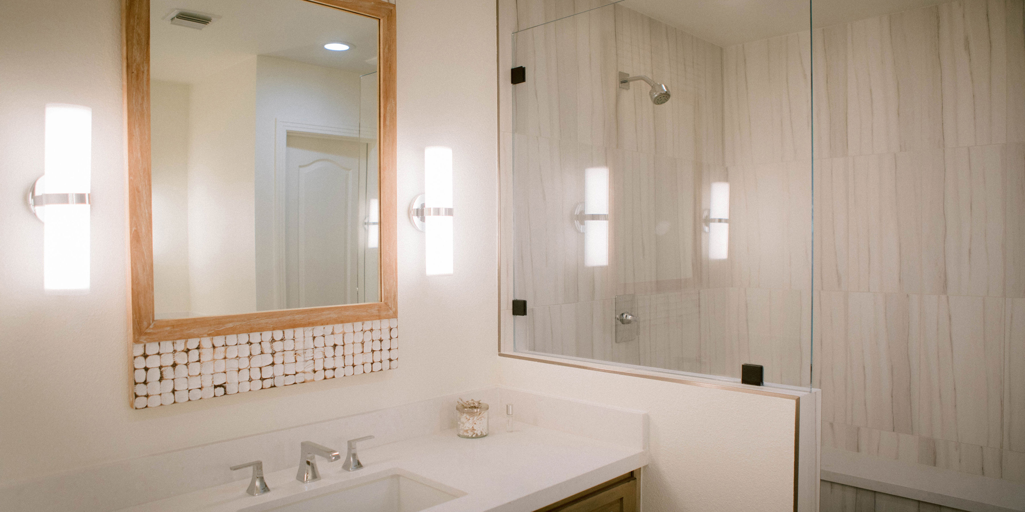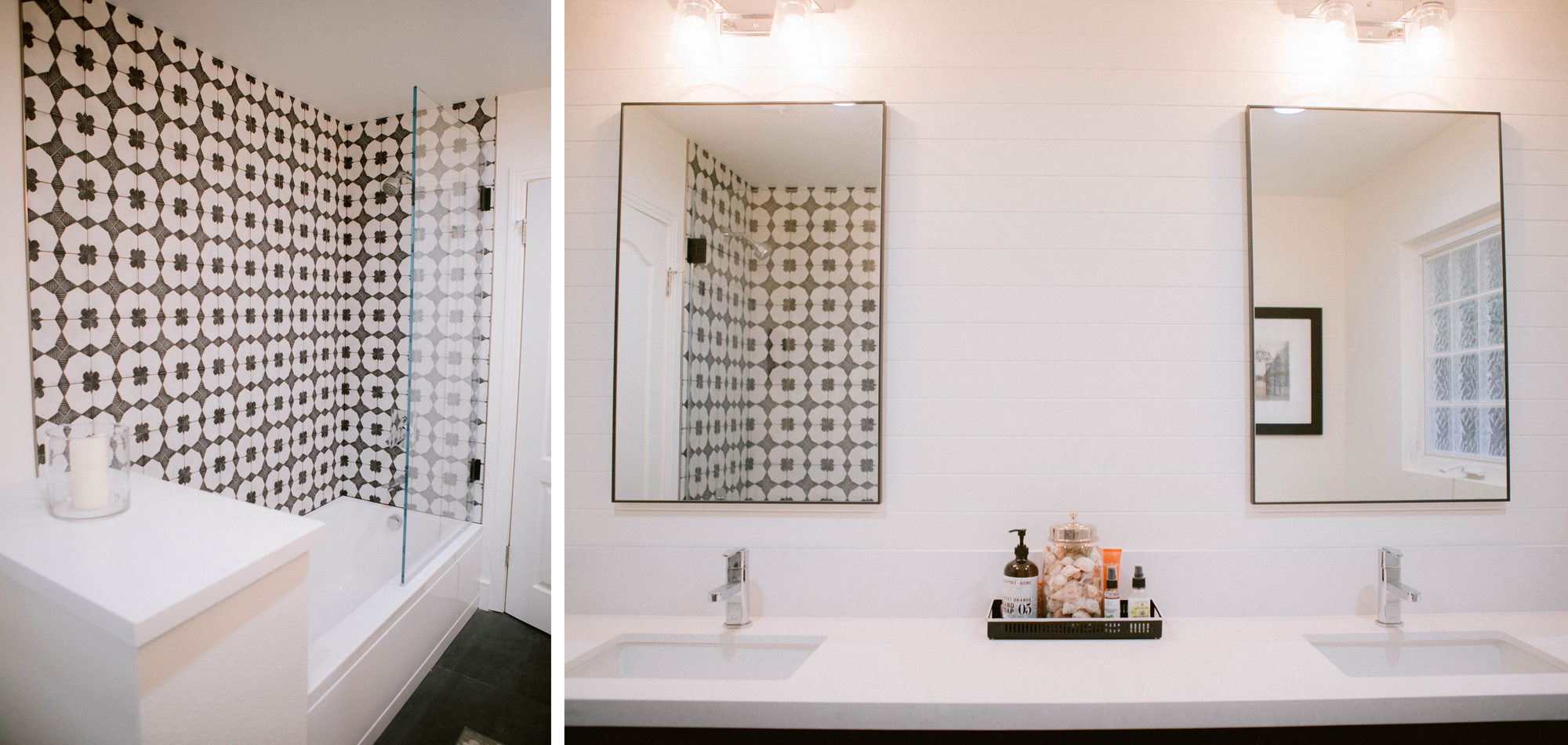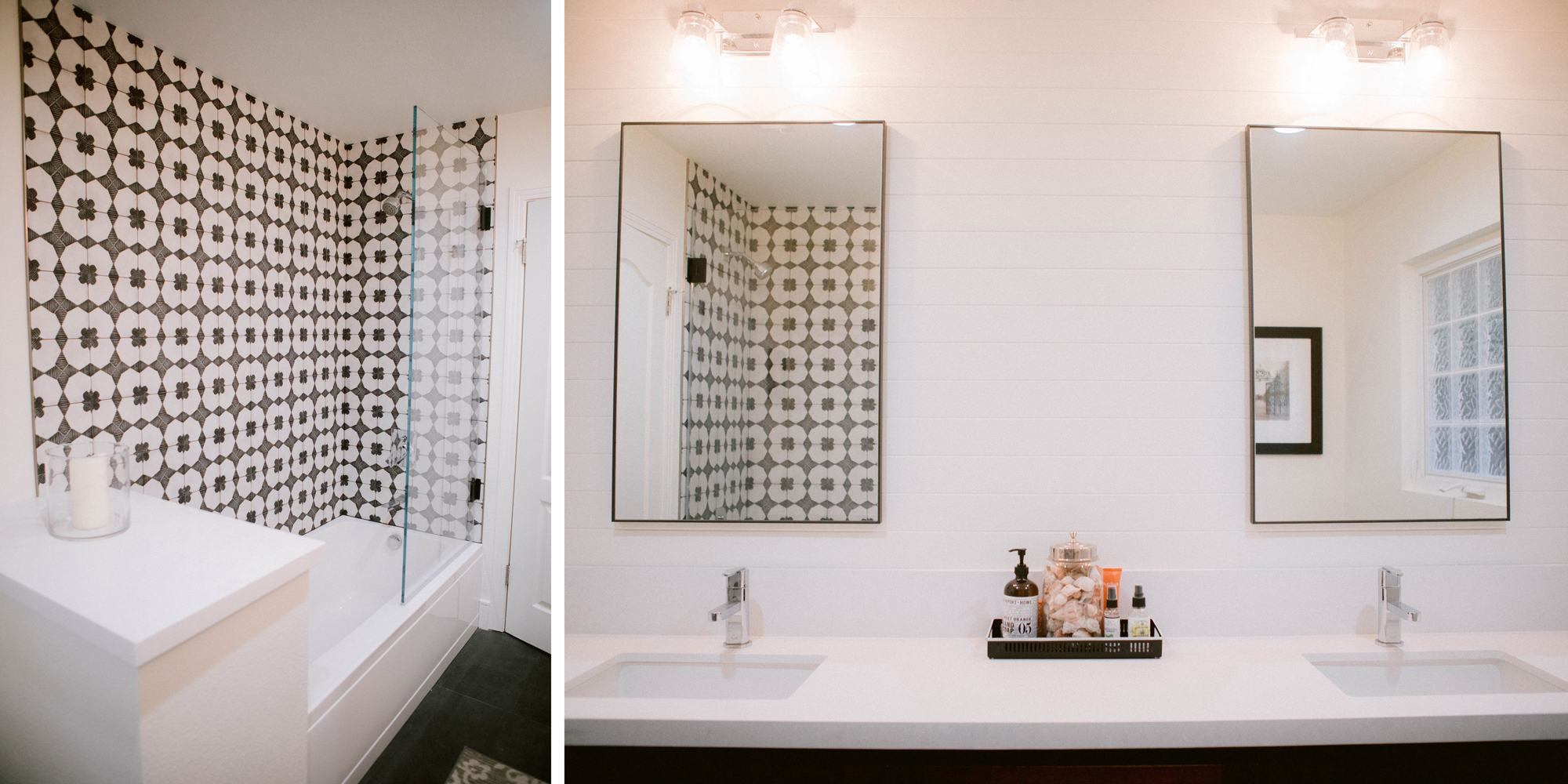 The primary bathroom originally consisted of two small rooms and was poorly laid out. We took down a wall and designed an expansive walk-in shower with a bench. For the guest bathroom, we used a statement patterned tile on the wall and kept the other finishes neutral. Clean lines and neutral tones transformed this home into a Modern Farmhouse-inspired gem.