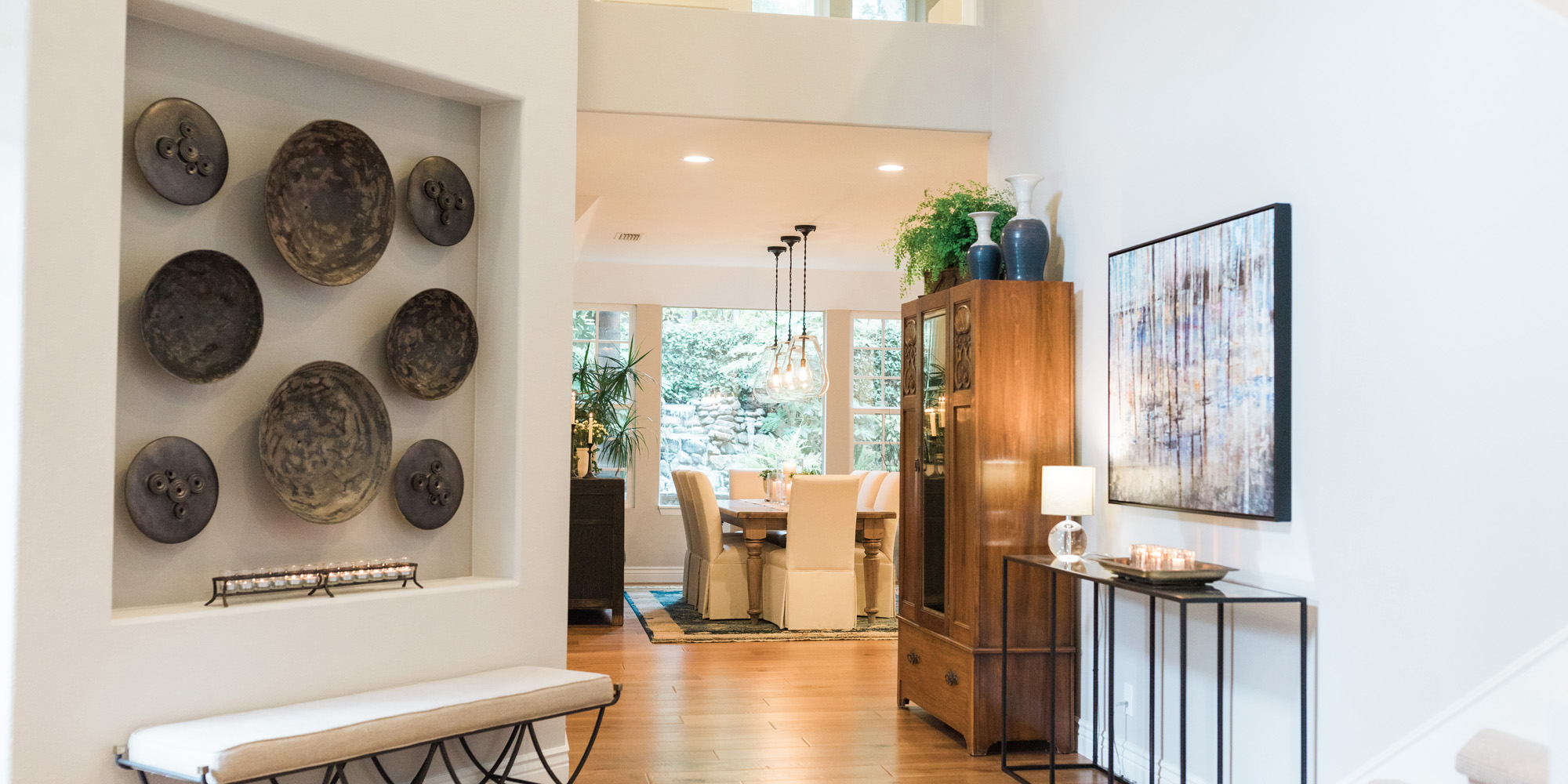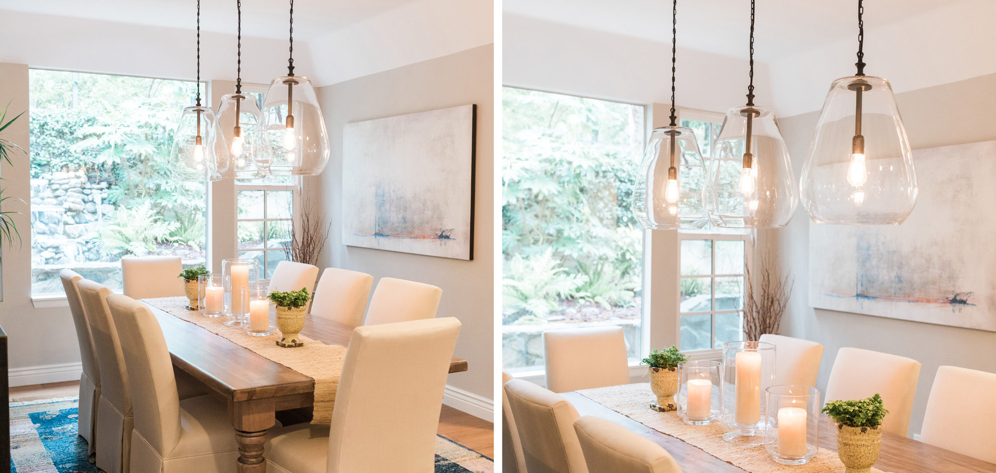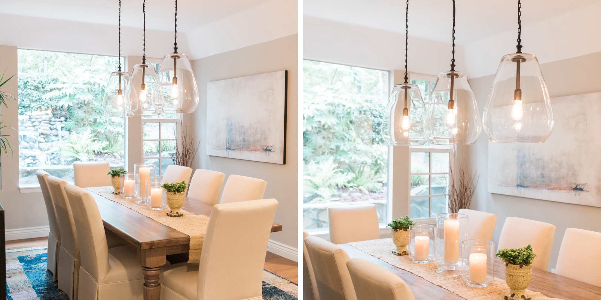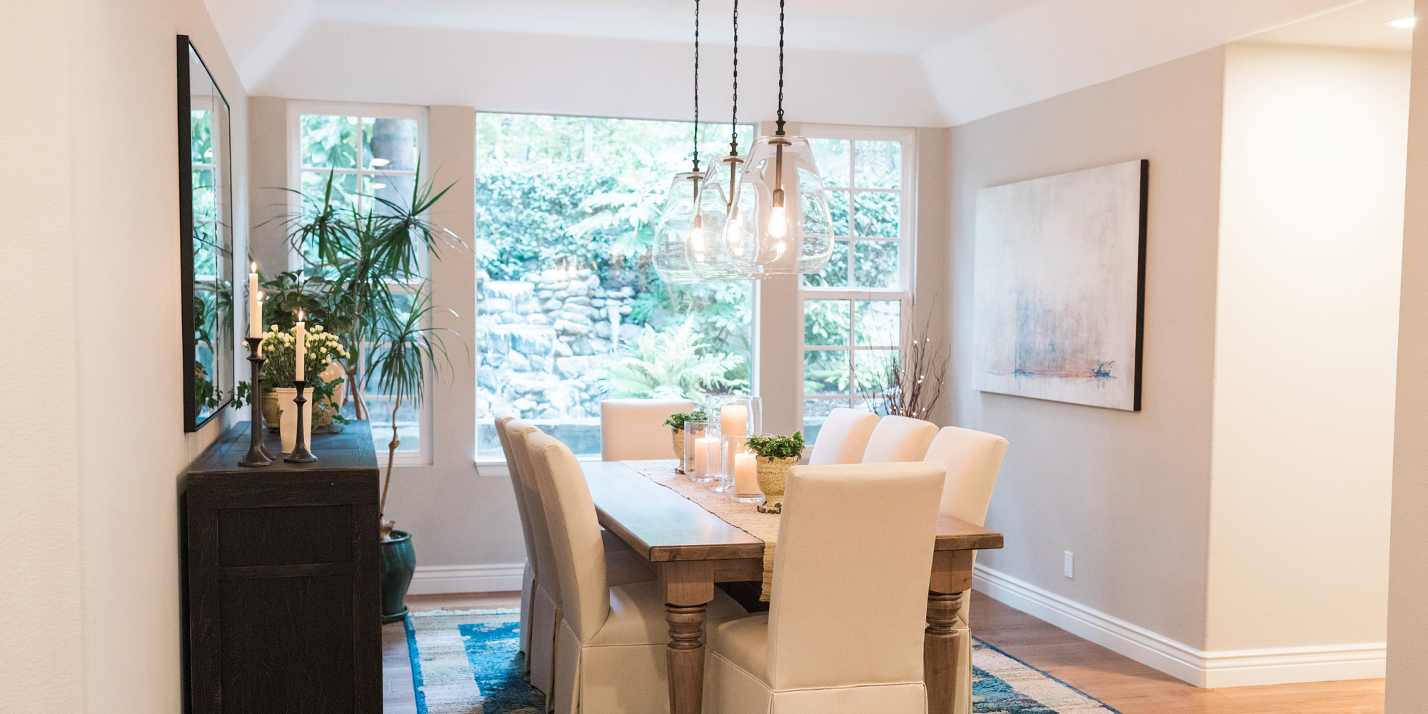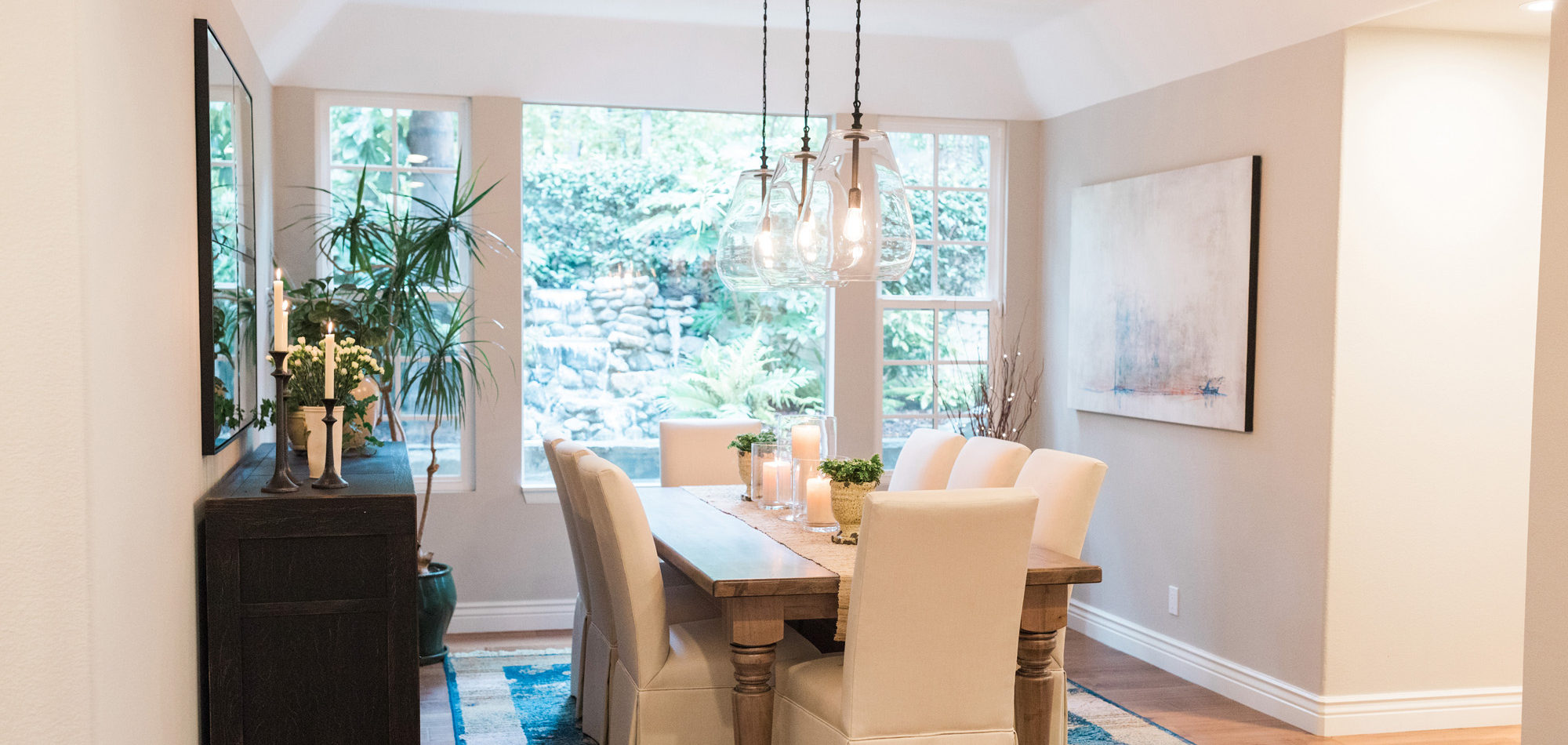 The dining room featured a window that overlooked a beautiful water feature. We wanted the room to feel like it was part of the outdoors by day and night. Light bounced off multiple glass pendants and a large-scale beveled mirror while allowing an unobstructed view of the outdoors.