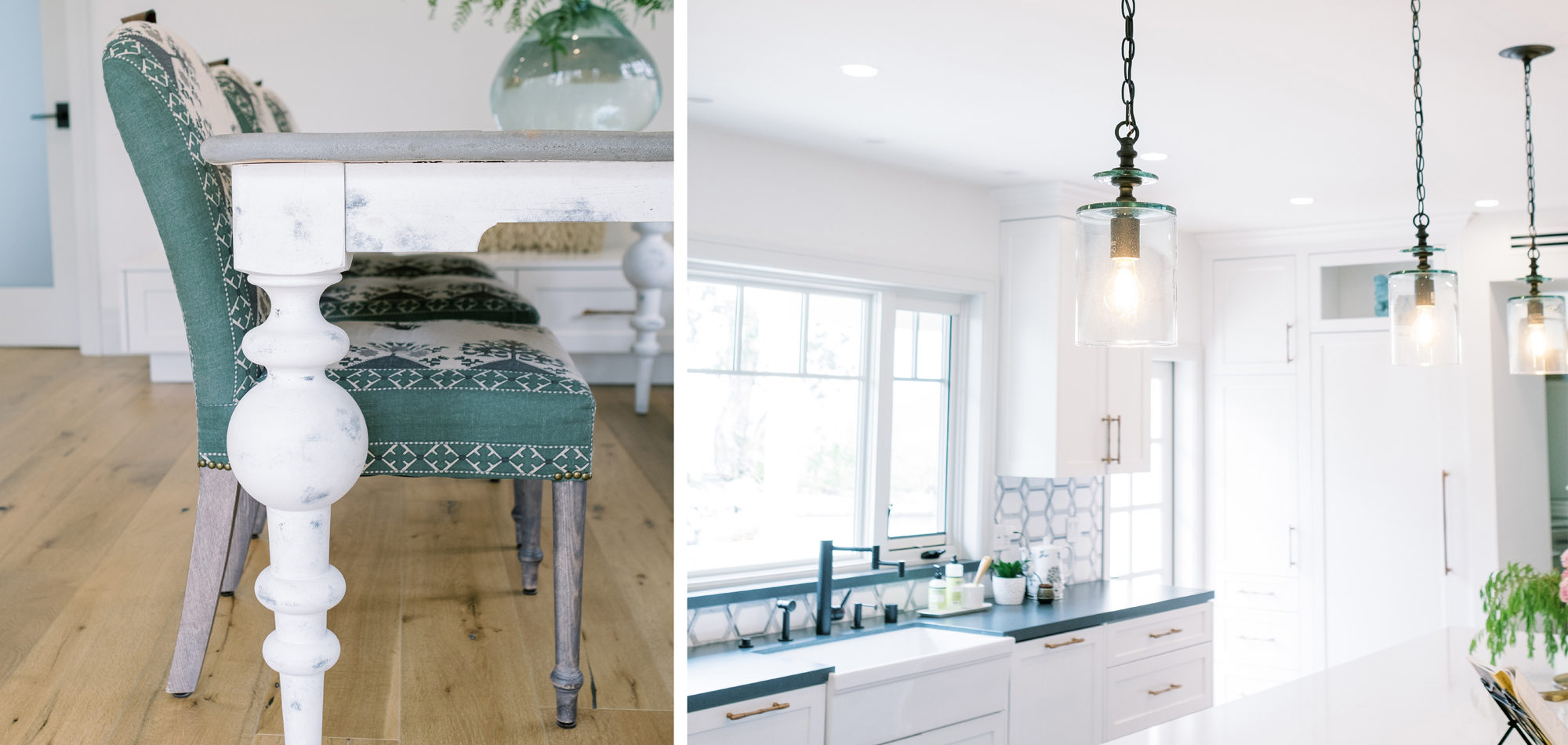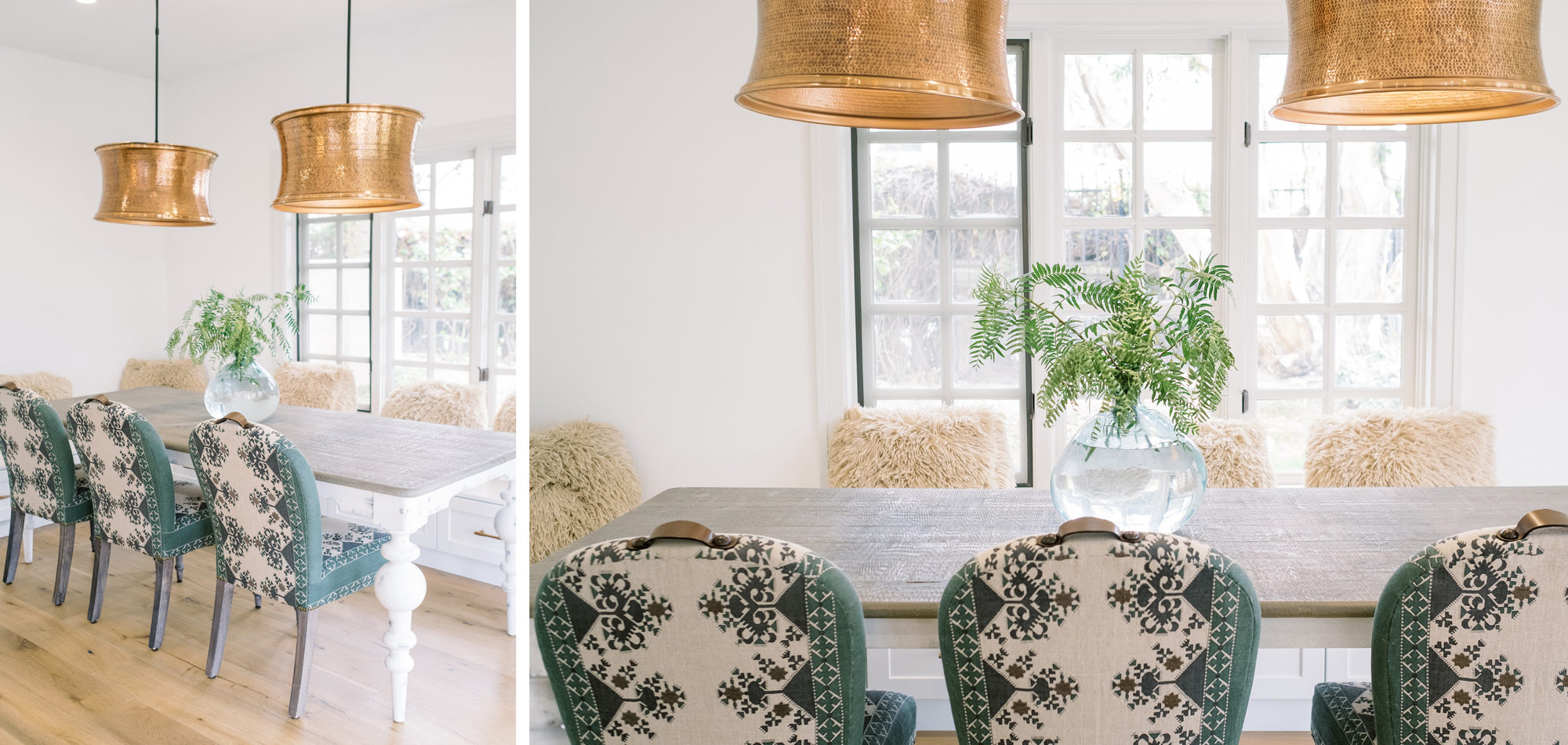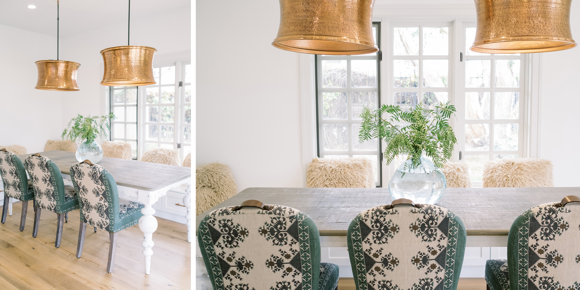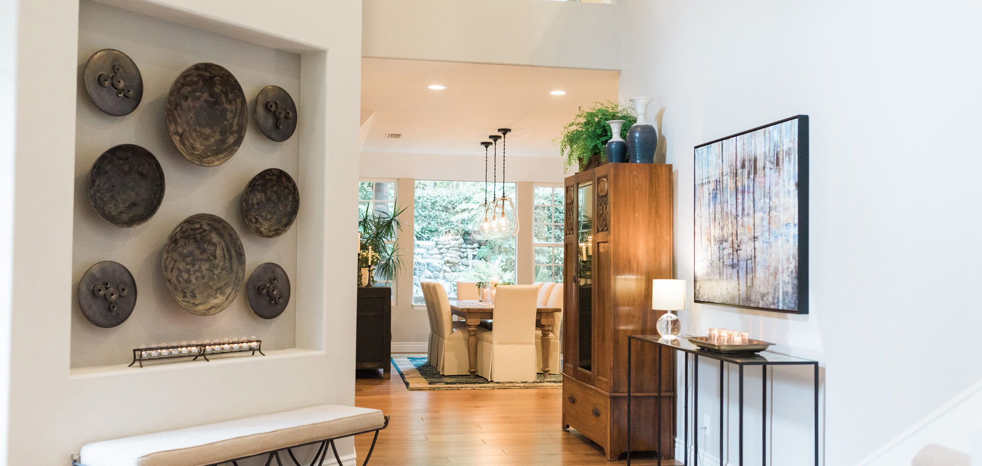 The dining room featured a window that overlooked a beautiful water feature. We wanted the room to feel like it was part of the outdoors by day and night. Light bounced off multiple glass pendants and a large-scale beveled mirror while allowing an unobstructed view of the outdoors.