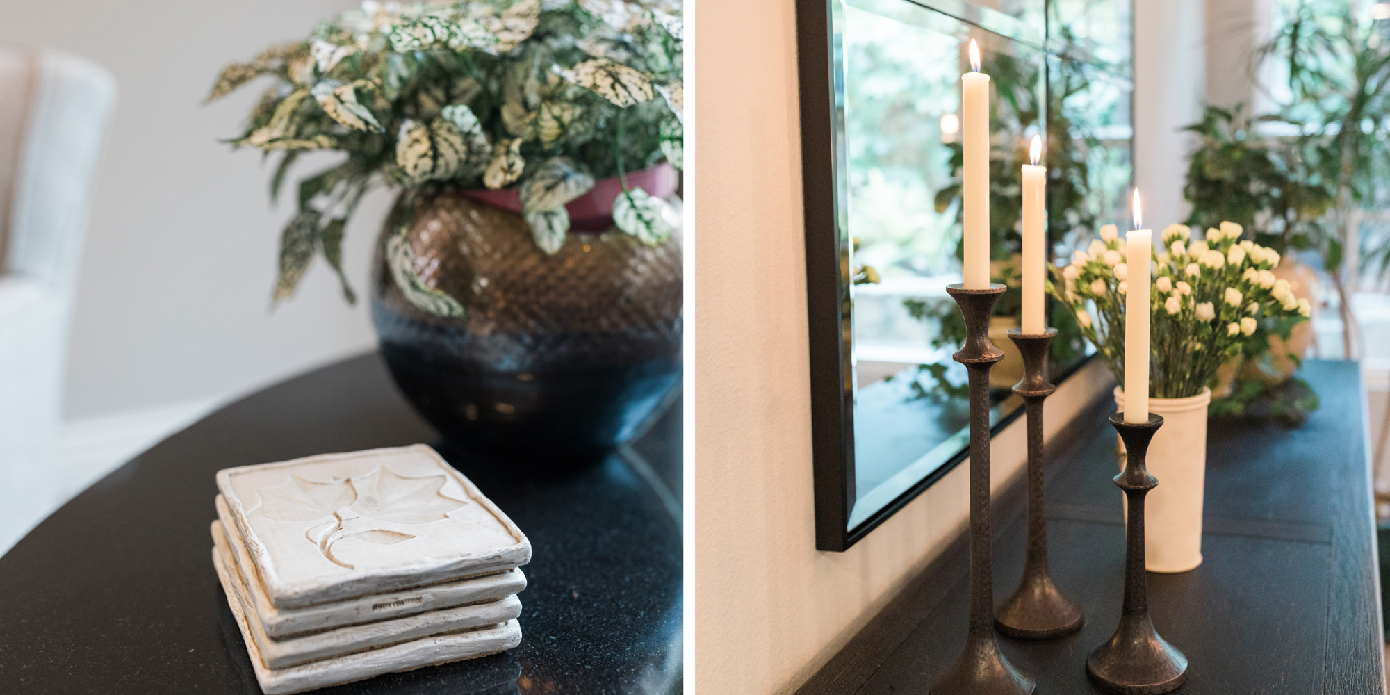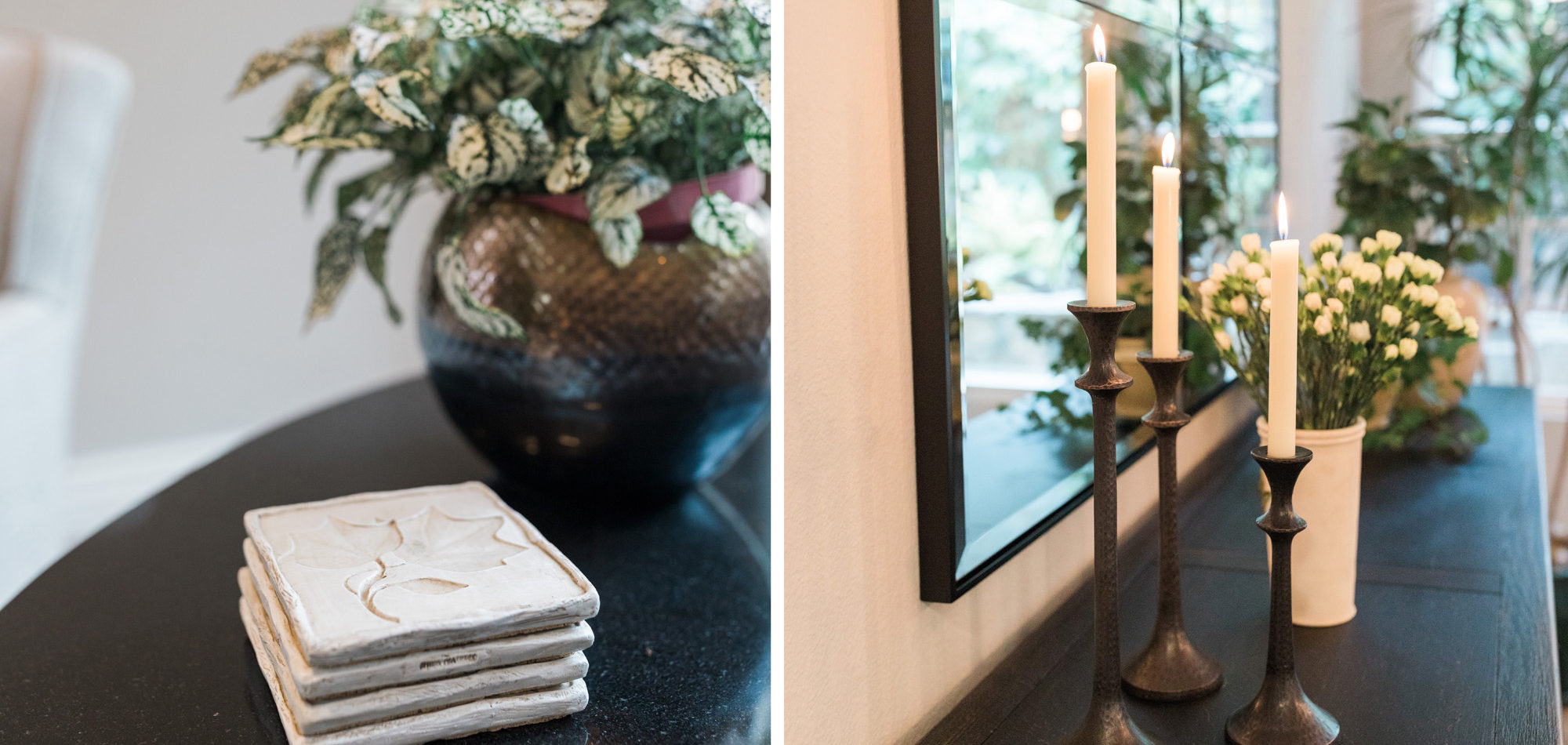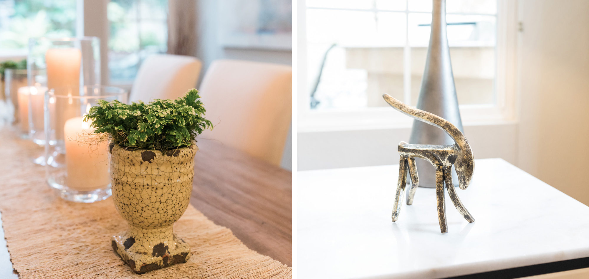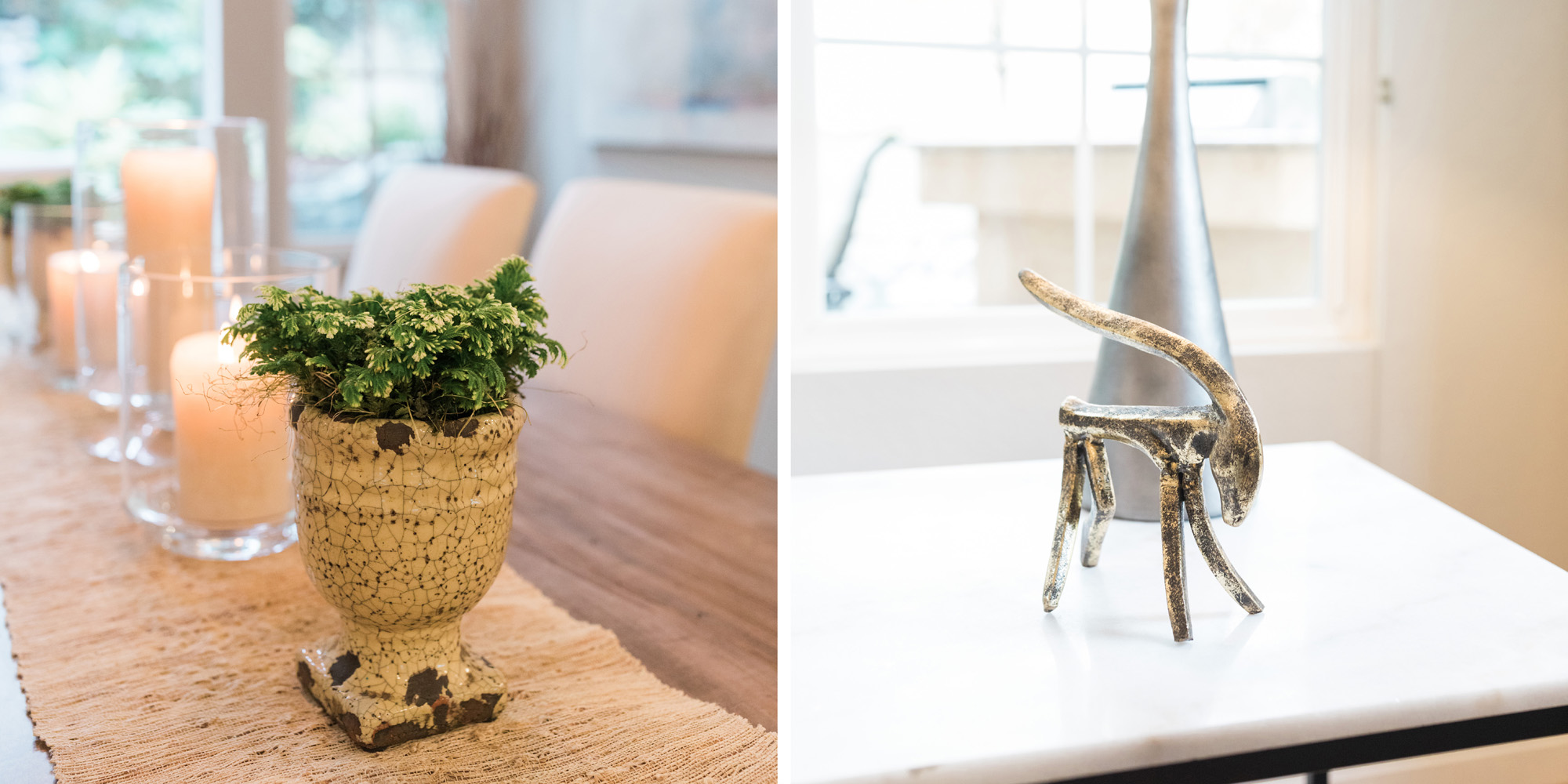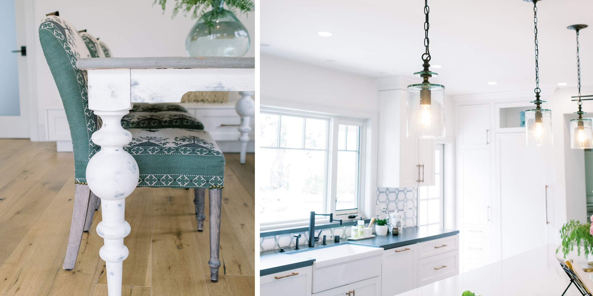 The dining room featured a window that overlooked a beautiful water feature. We wanted the room to feel like it was part of the outdoors by day and night. Light bounced off multiple glass pendants and a large-scale beveled mirror while allowing an unobstructed view of the outdoors.