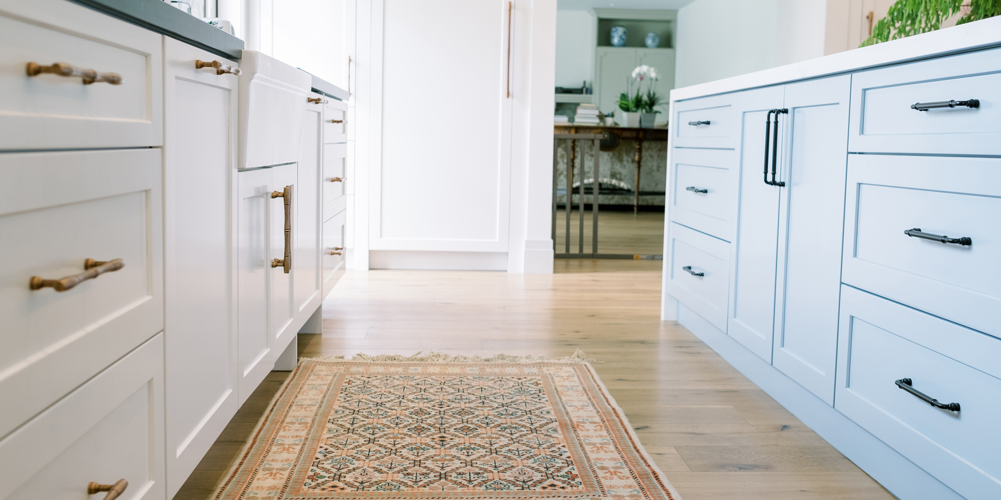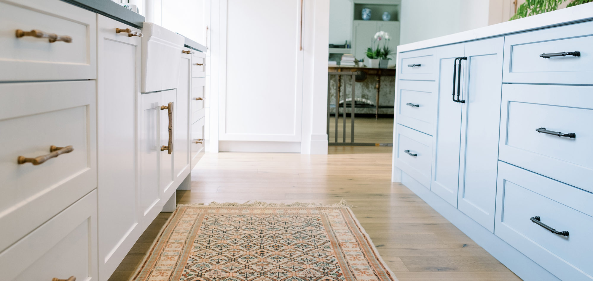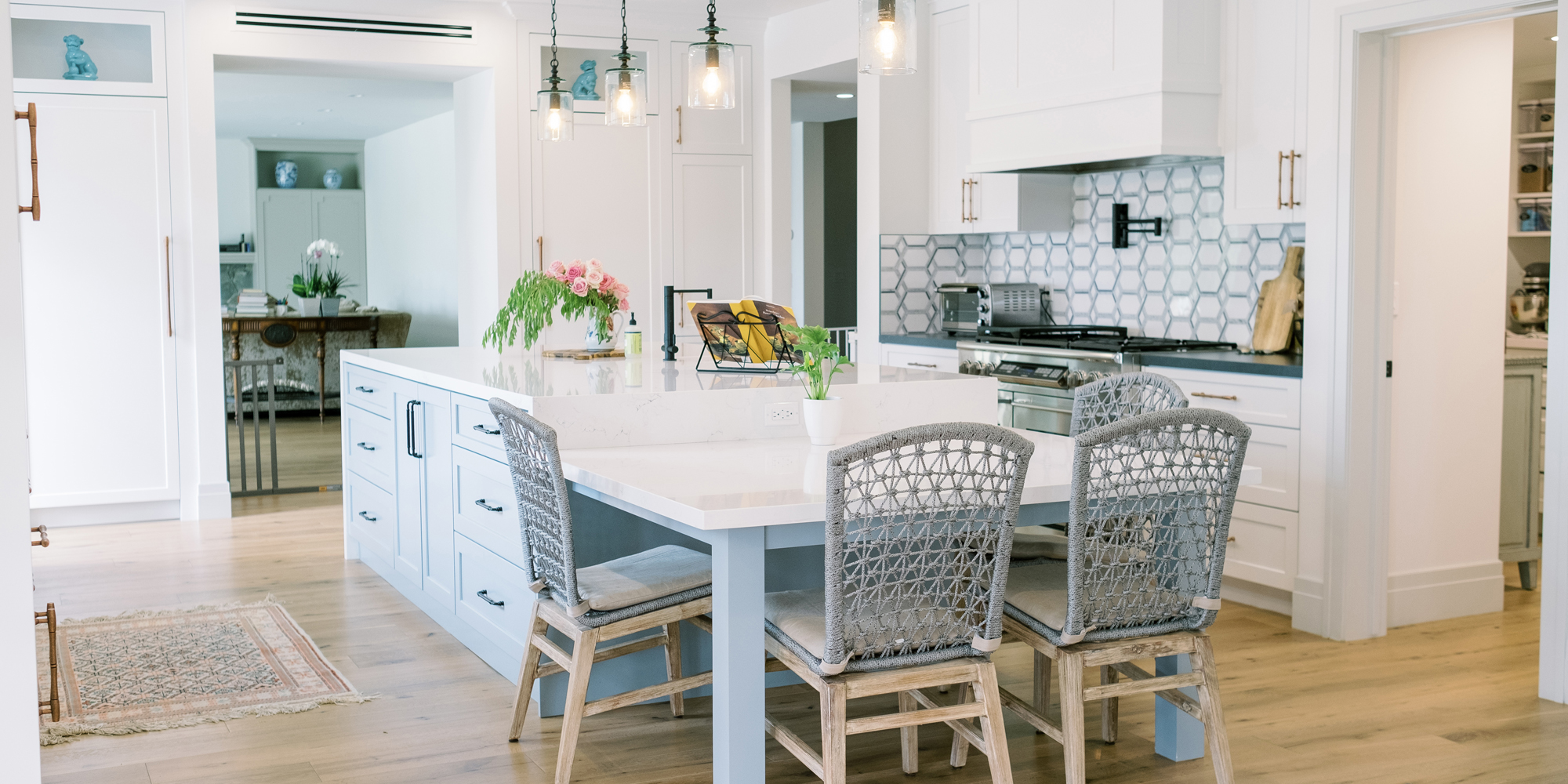 It is important to understand the needs and desires of our clients. In this case, there is one main cook, however, there can be 3 or 4 cooks in the kitchen during holidays and family dinners. They like to have people hang out in the kitchen with them when preparing dinner. They wanted the look of one main island and panels on the appliances. Baking is important to our client, and she wanted a place to roll dough. Other items on the wish list included a range with wall ovens, a Farmhouse sink, pot filler, whitewashed hardwood flooring throughout, and a blue island. We were also asked to rework the layout to include a walk-in pantry and a separate closet to access from the hallway.