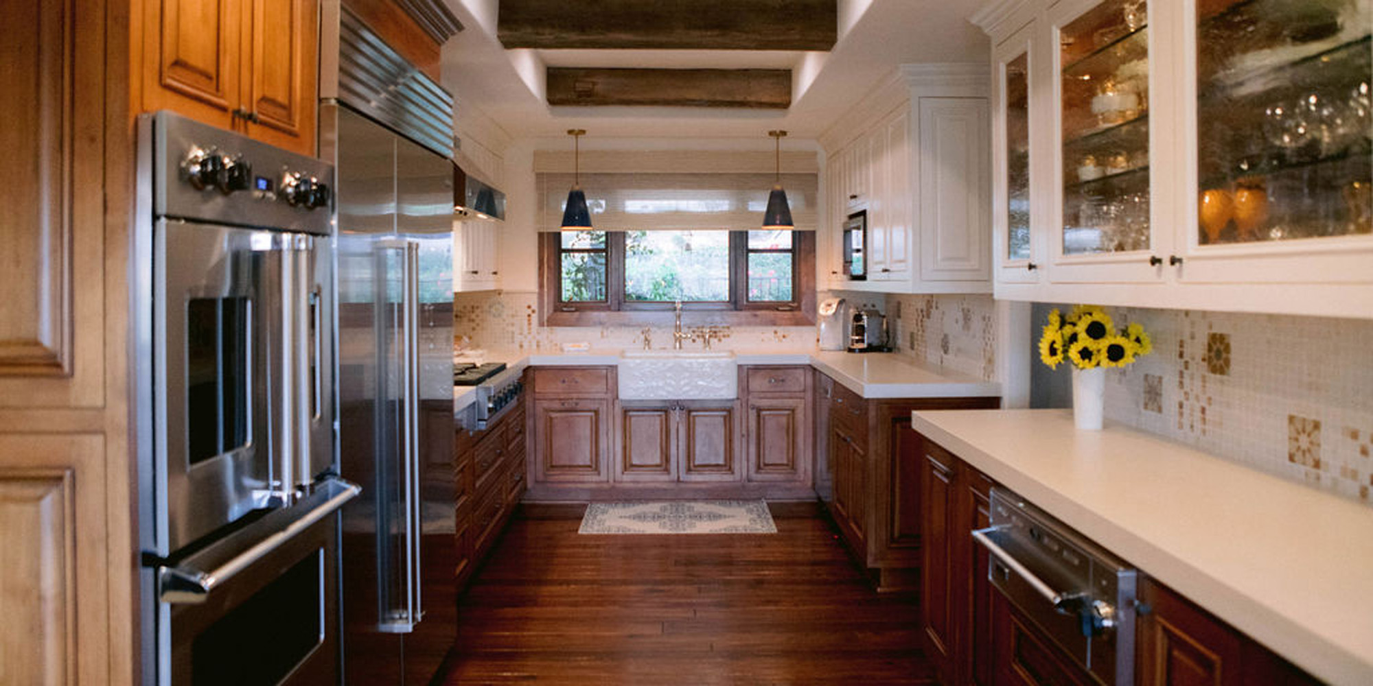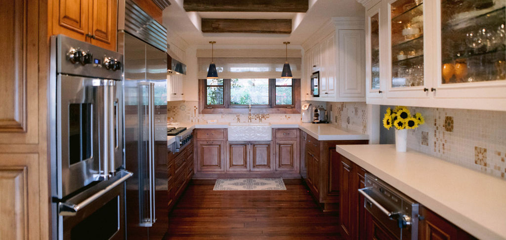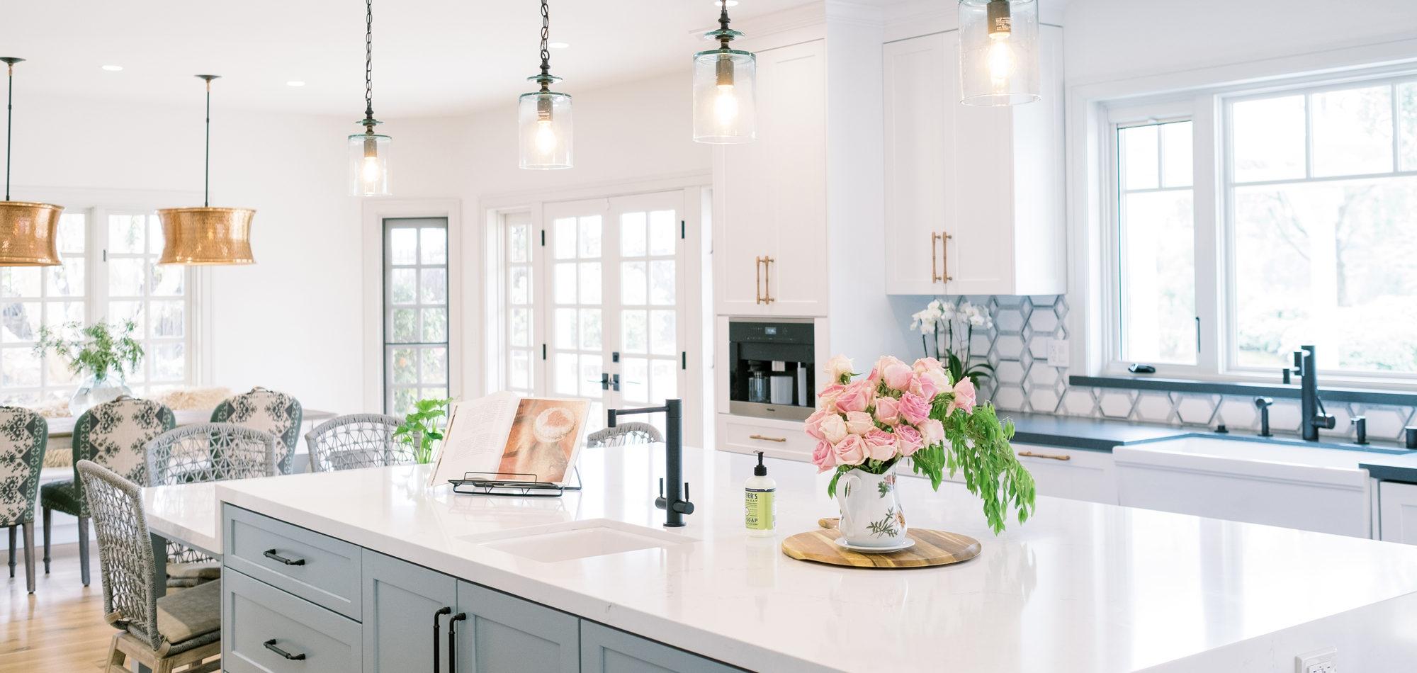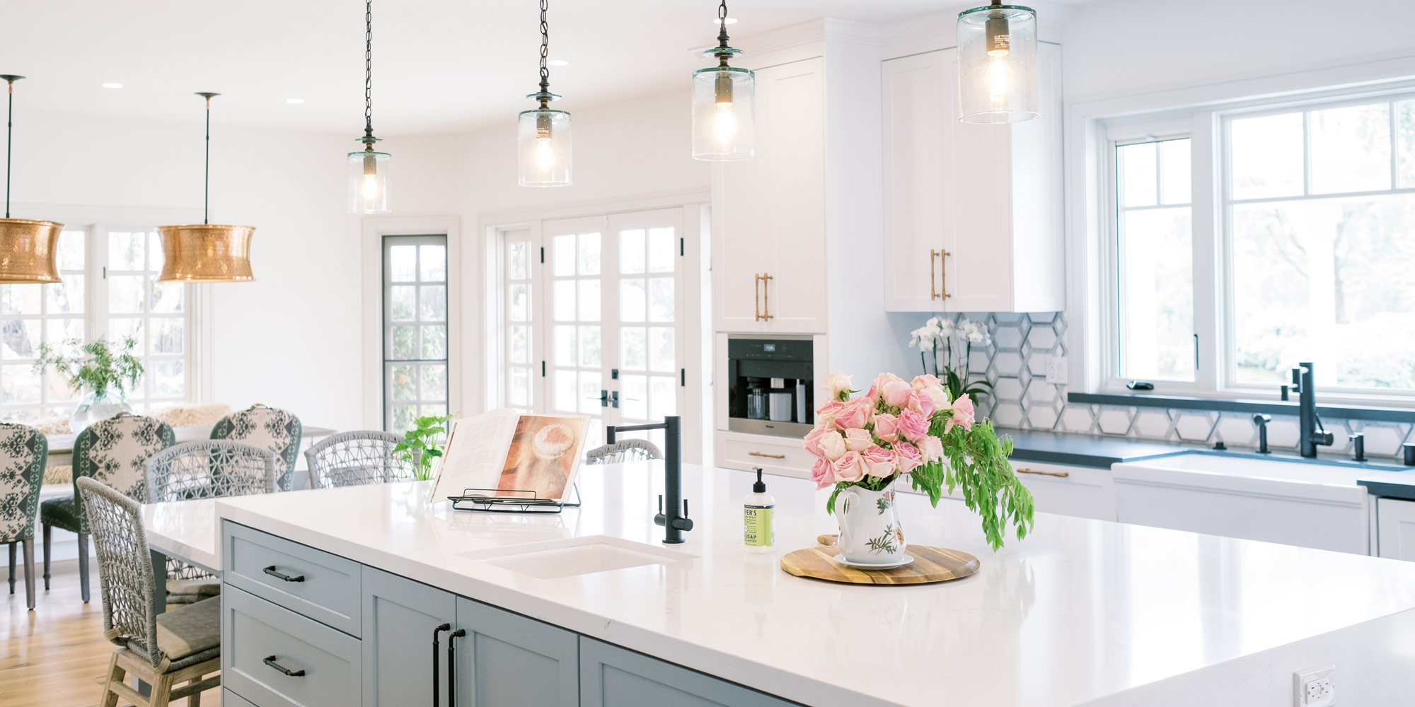 It is important to understand the needs and desires of our clients. In this case, there is one main cook, however, there can be 3 or 4 cooks in the kitchen during holidays and family dinners. They like to have people hang out in the kitchen with them when preparing dinner. They wanted the look of one main island and panels on the appliances. Baking is important to our client, and she wanted a place to roll dough. Other items on the wish list included a range with wall ovens, a Farmhouse sink, pot filler, whitewashed hardwood flooring throughout, and a blue island. We were also asked to rework the layout to include a walk-in pantry and a separate closet to access from the hallway.