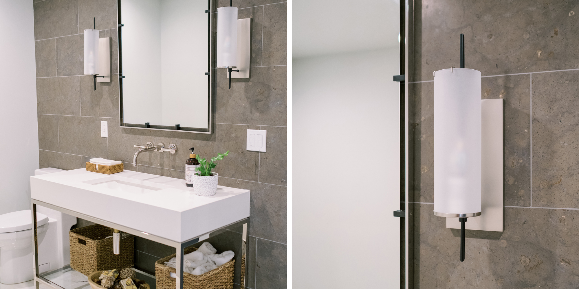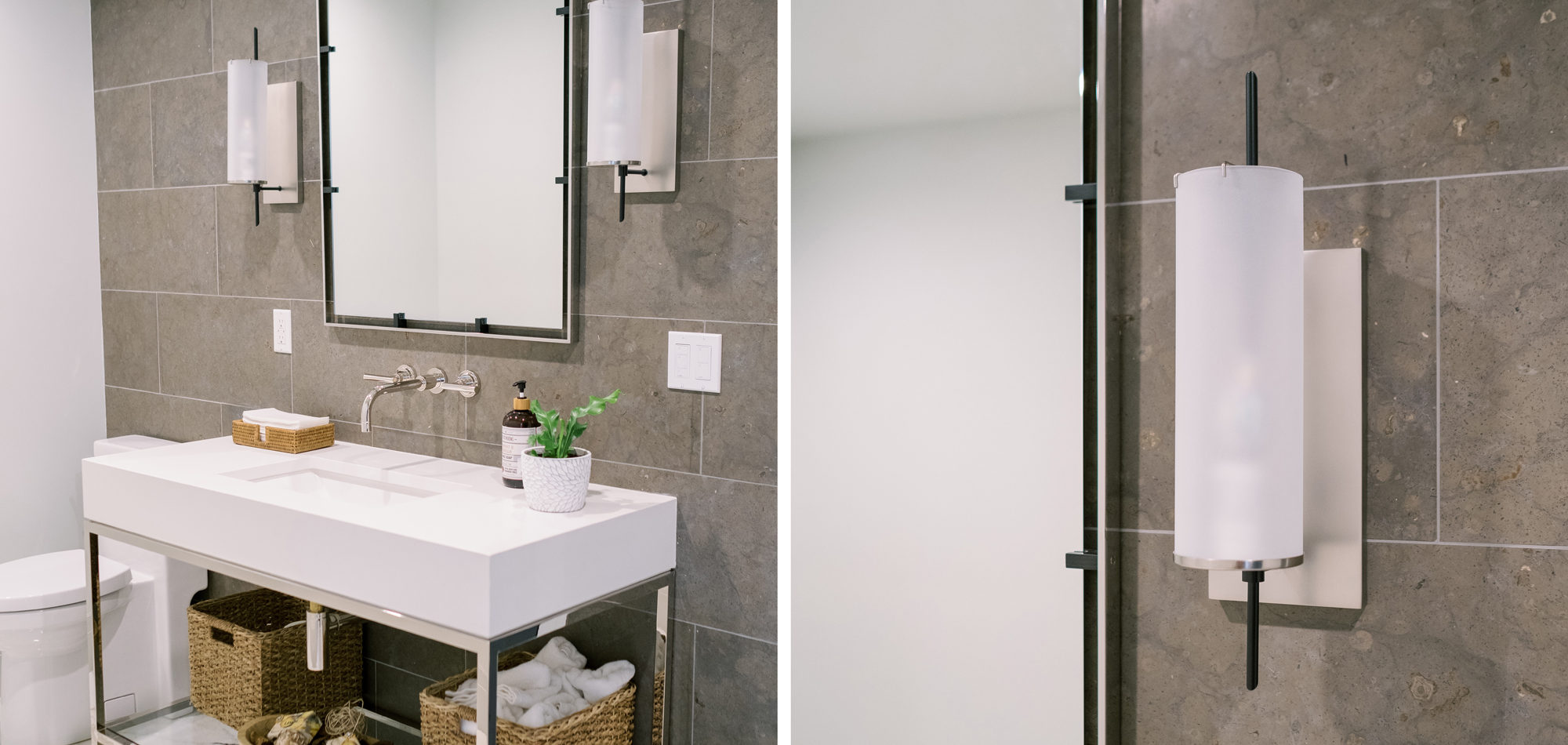 A dark and dated powder bath came to life with a modern French Country flair. The vanity and mirror from Restoration Hardware were set off with honed limestone backsplash on the entire wall behind and a wall-mounted faucet.