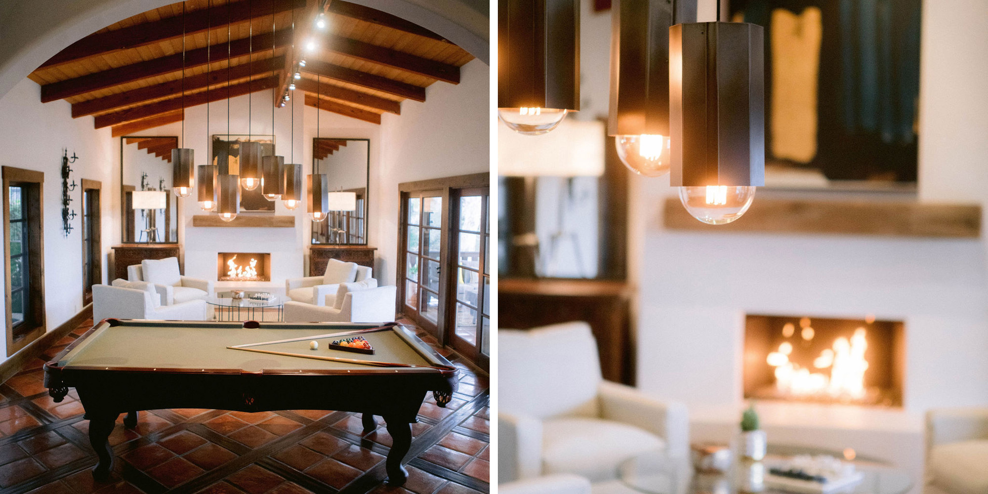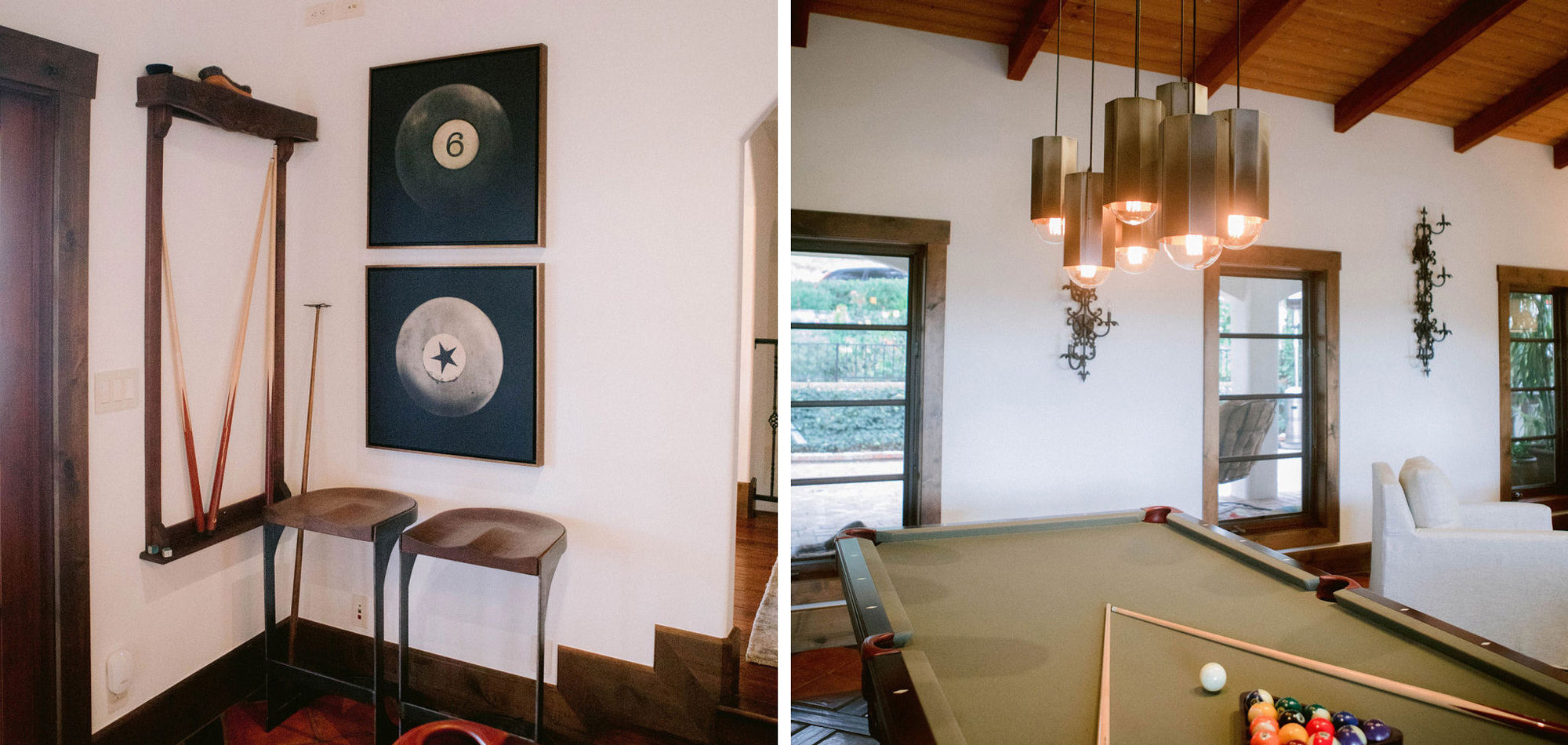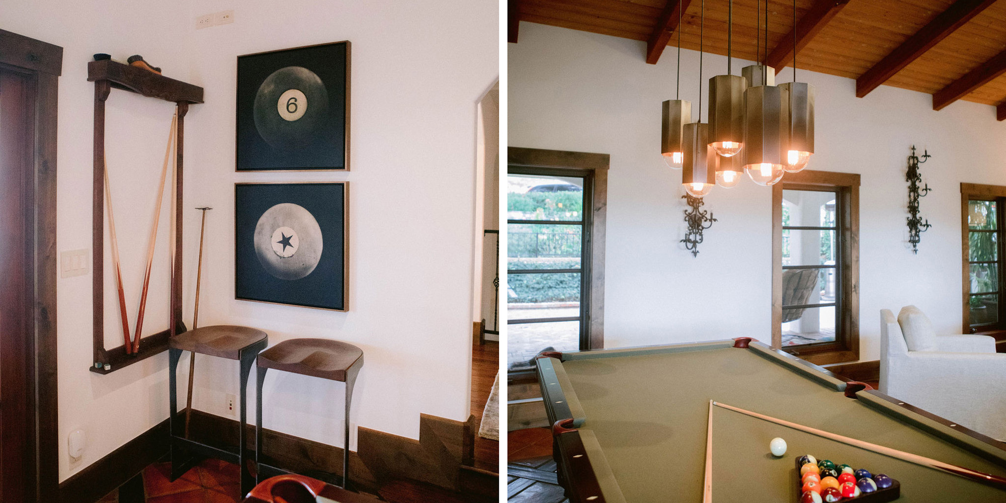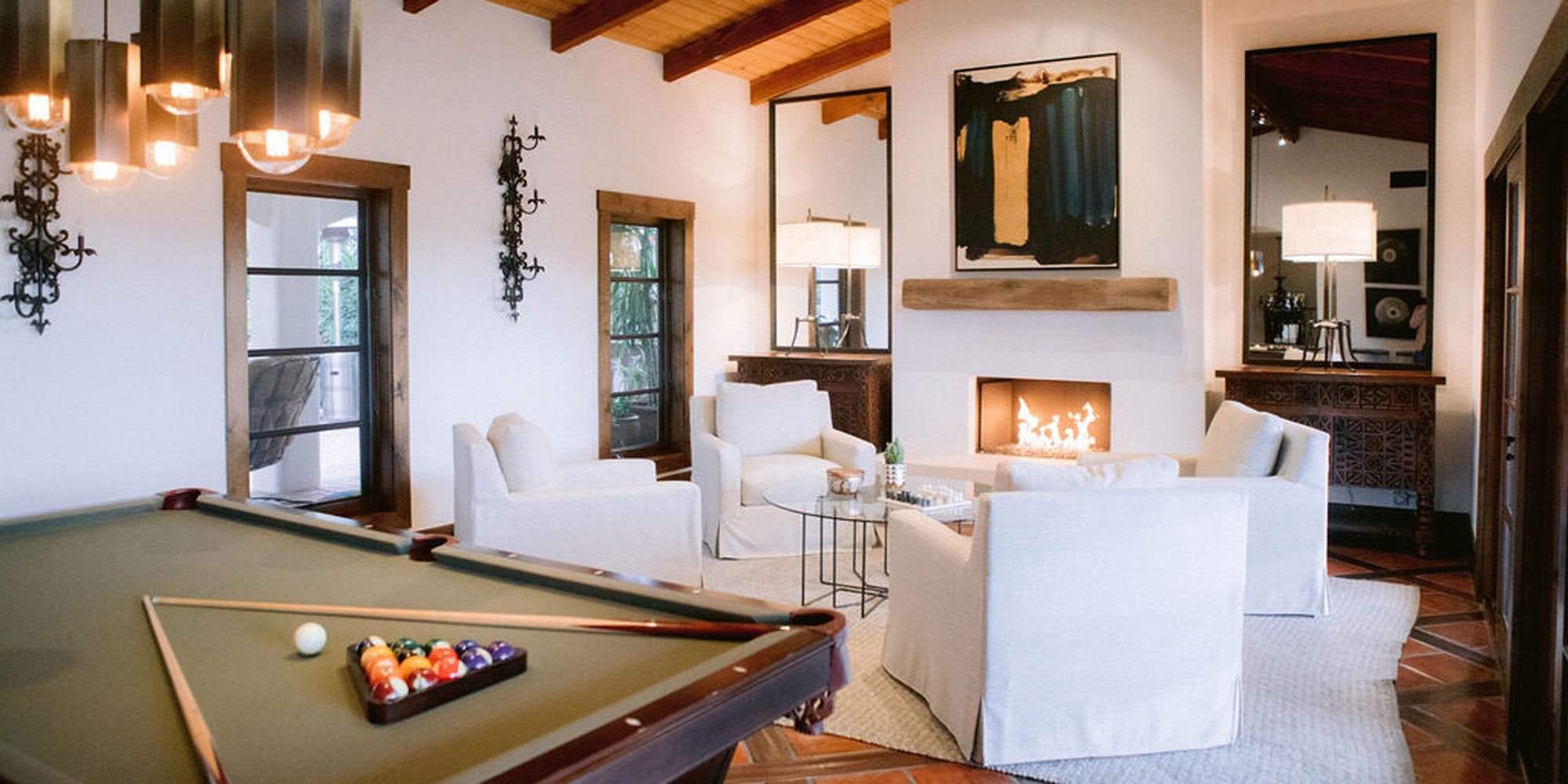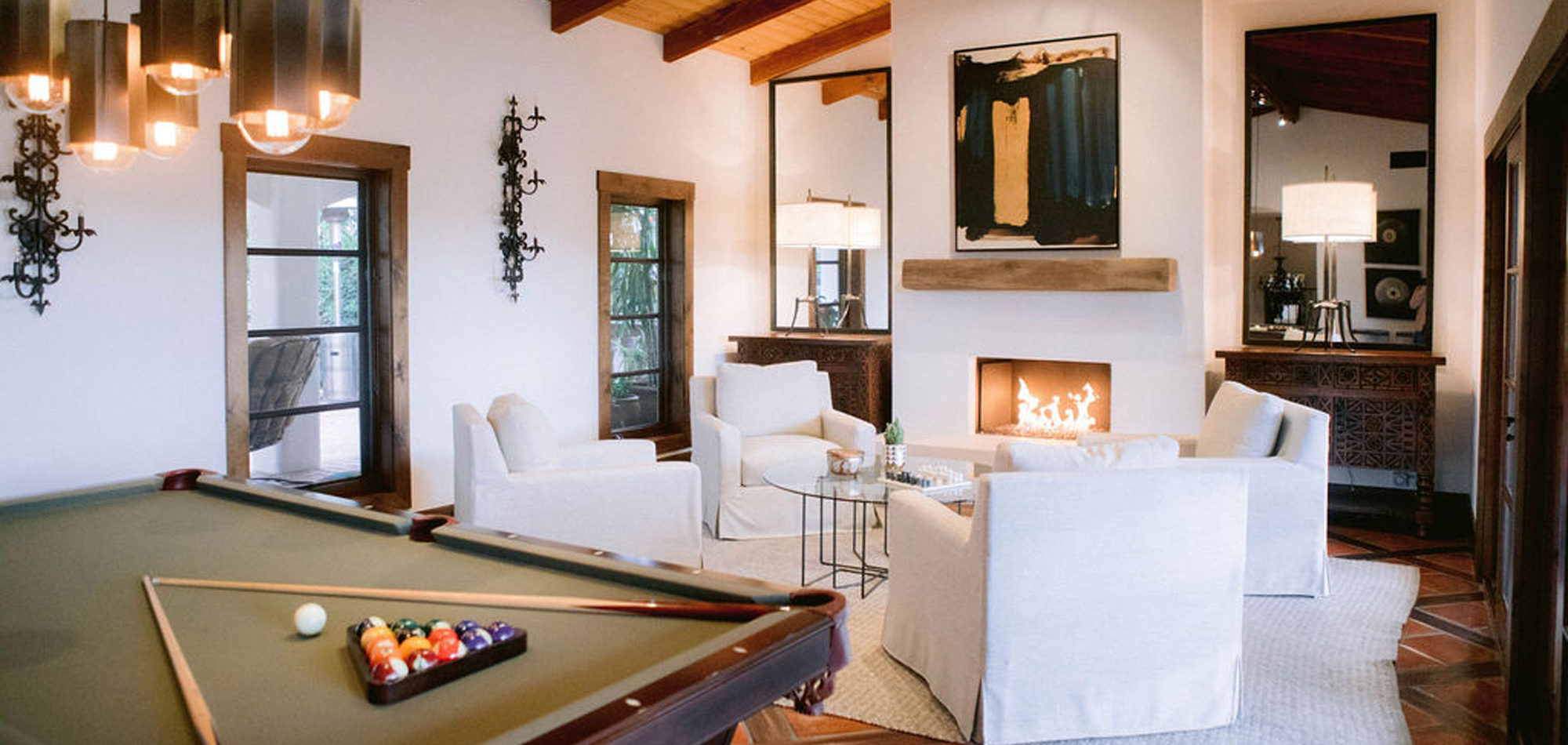 What a joy to work on this home with this fabulous couple and their two dogs. The executive couple who was downsizing wanted to have a new updated look in keeping with the integrity of their Spanish-style home. We wanted to bring in as much charm and interest to the spaces as reflected by its inhabitants. Some of the features, such as the Saltillo tile was to stay. We worked to modernize the home, keeping its best elements while producing a modernized vibe. The first challenge was situating a pool table in what was before the living room and was now the game room. Because this was the first room you see when you enter the home it was imperative to make it look like it was a planned addition. A custom light for over the pool table was designed to create a moody atmosphere. We replaced the brick on the outdated floor-to-ceiling fireplace with a neutral plaster and changed the log insert to glass. Then flanked the fireplace with two custom chests and added four comfortable swivel chairs for a perfect lounging area. The artwork really brought the space together blending sophistication and fun. The result is a warm and welcoming room.