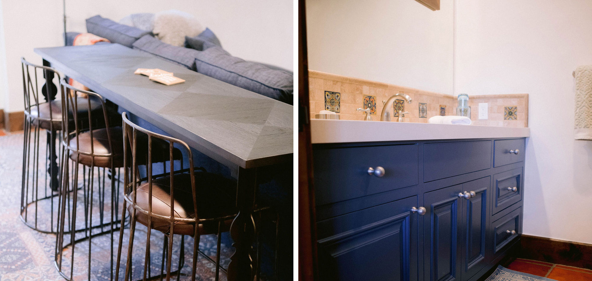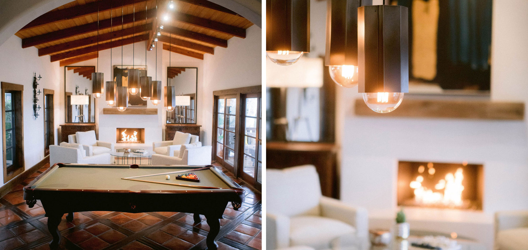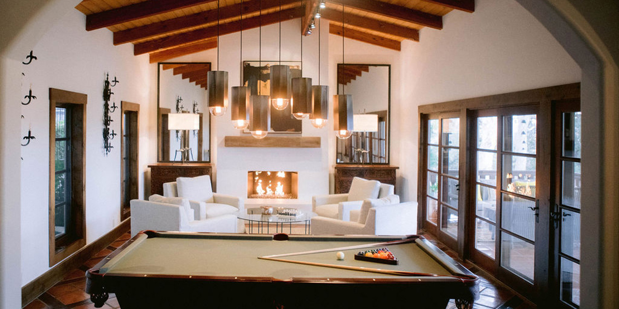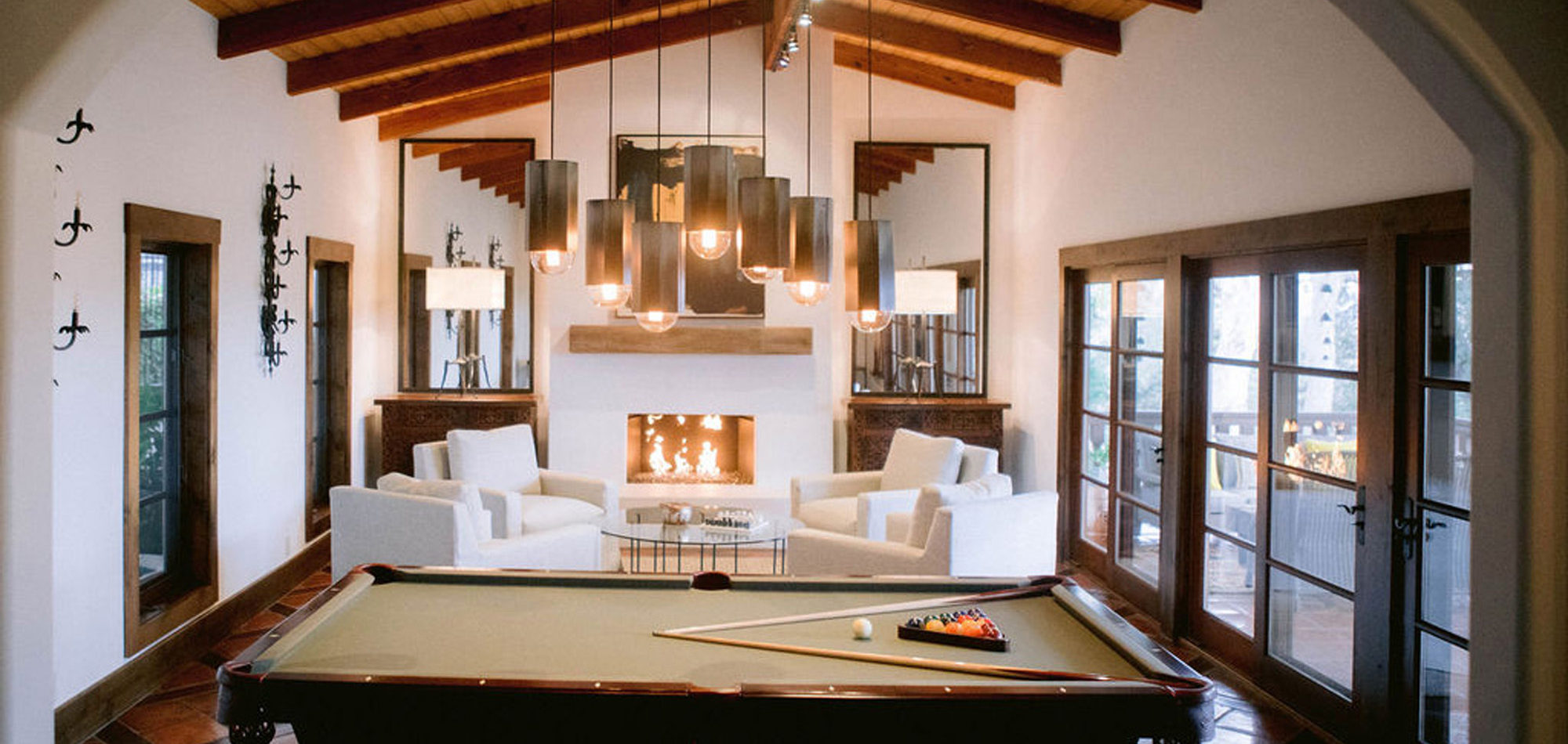 What a joy to work on this home with this fabulous couple and their two dogs. The executive couple who was downsizing wanted to have a new updated look in keeping with the integrity of their Spanish-style home. We wanted to bring in as much charm and interest to the spaces as reflected by its inhabitants. Some of the features, such as the Saltillo tile was to stay. We worked to modernize the home, keeping its best elements while producing a modernized vibe. The first challenge was situating a pool table in what was before the living room and was now the game room. Because this was the first room you see when you enter the home it was imperative to make it look like it was a planned addition. A custom light for over the pool table was designed to create a moody atmosphere. We replaced the brick on the outdated floor-to-ceiling fireplace with a neutral plaster and changed the log insert to glass. Then flanked the fireplace with two custom chests and added four comfortable swivel chairs for a perfect lounging area. The artwork really brought the space together blending sophistication and fun. The result is a warm and welcoming room.