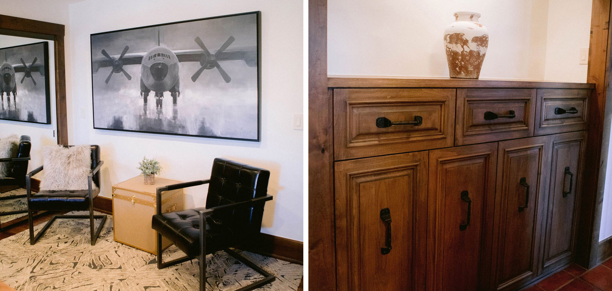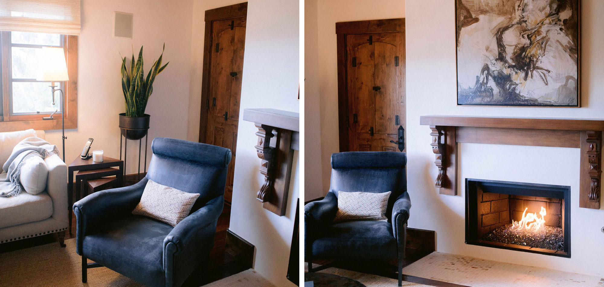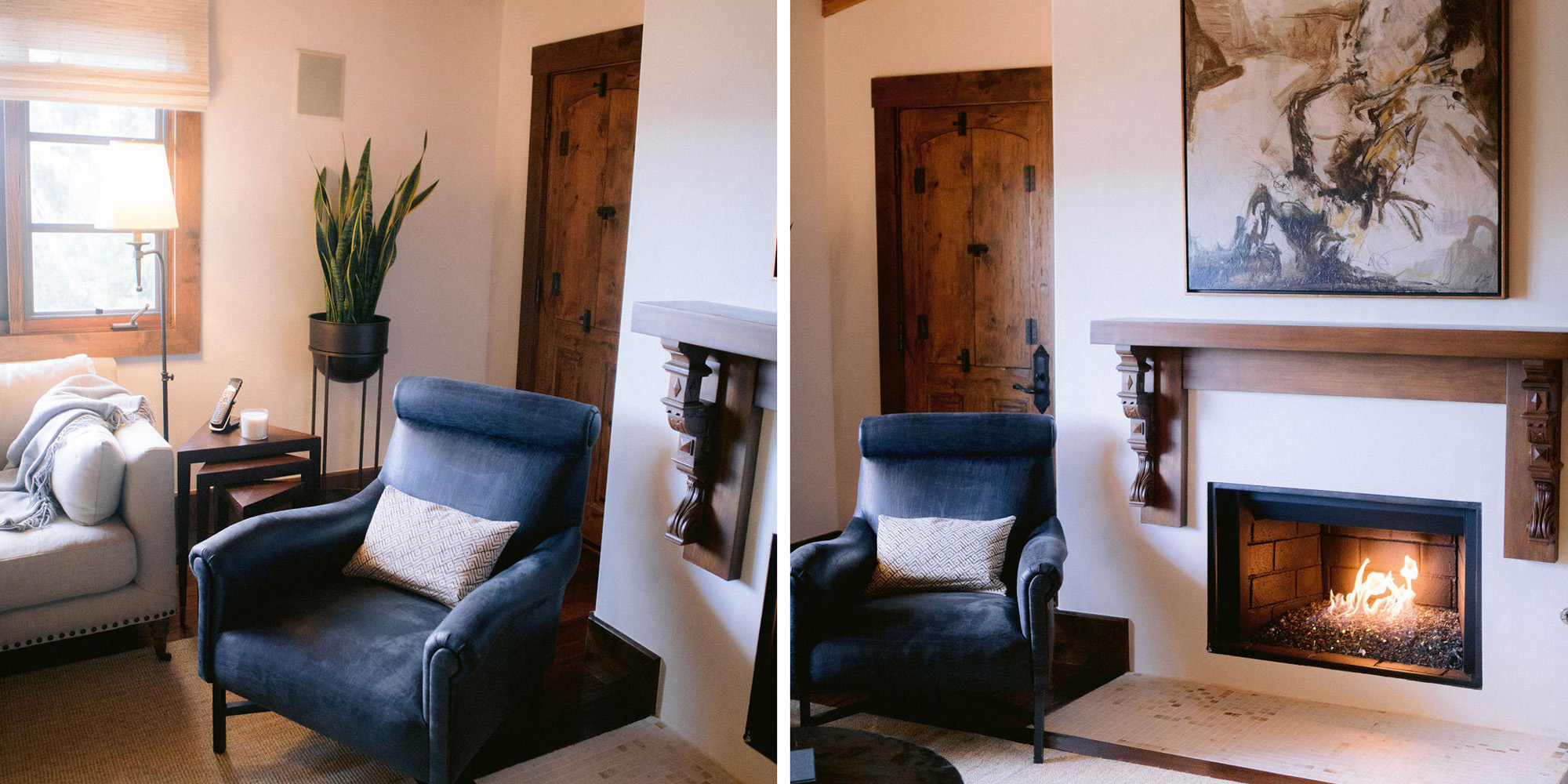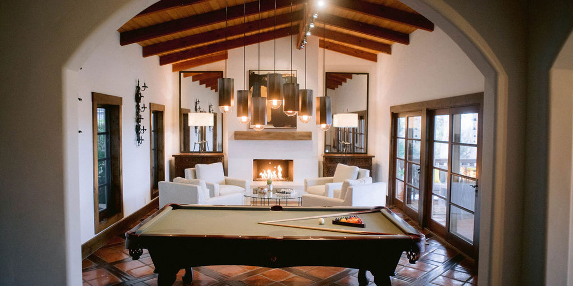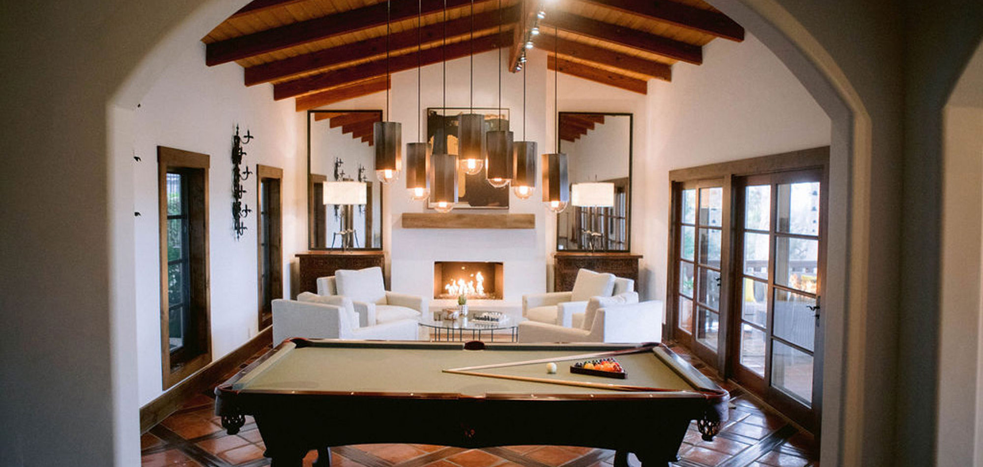 What a joy to work on this home with this fabulous couple and their two dogs. The executive couple who was downsizing wanted to have a new updated look in keeping with the integrity of their Spanish-style home. We wanted to bring in as much charm and interest to the spaces as reflected by its inhabitants. Some of the features, such as the Saltillo tile was to stay. We worked to modernize the home, keeping its best elements while producing a modernized vibe. The first challenge was situating a pool table in what was before the living room and was now the game room. Because this was the first room you see when you enter the home it was imperative to make it look like it was a planned addition. A custom light for over the pool table was designed to create a moody atmosphere. We replaced the brick on the outdated floor-to-ceiling fireplace with a neutral plaster and changed the log insert to glass. Then flanked the fireplace with two custom chests and added four comfortable swivel chairs for a perfect lounging area. The artwork really brought the space together blending sophistication and fun. The result is a warm and welcoming room.