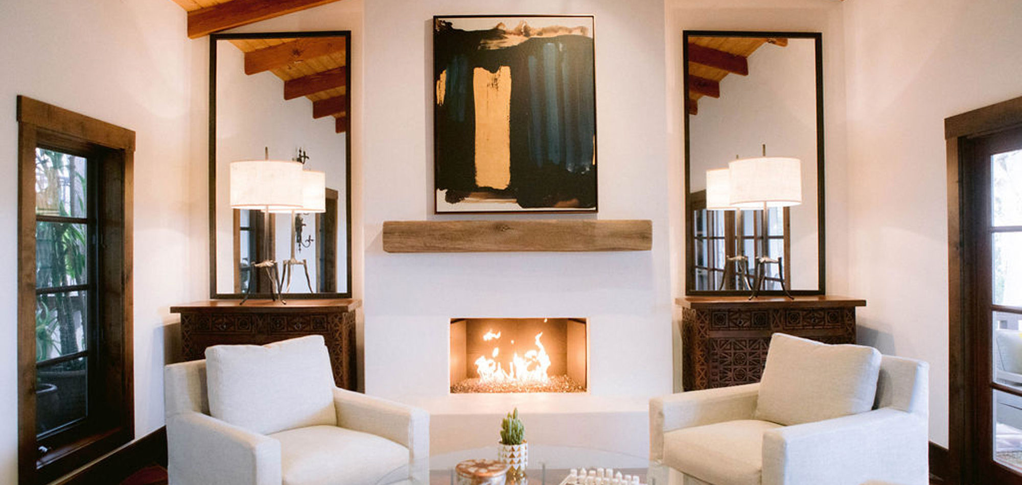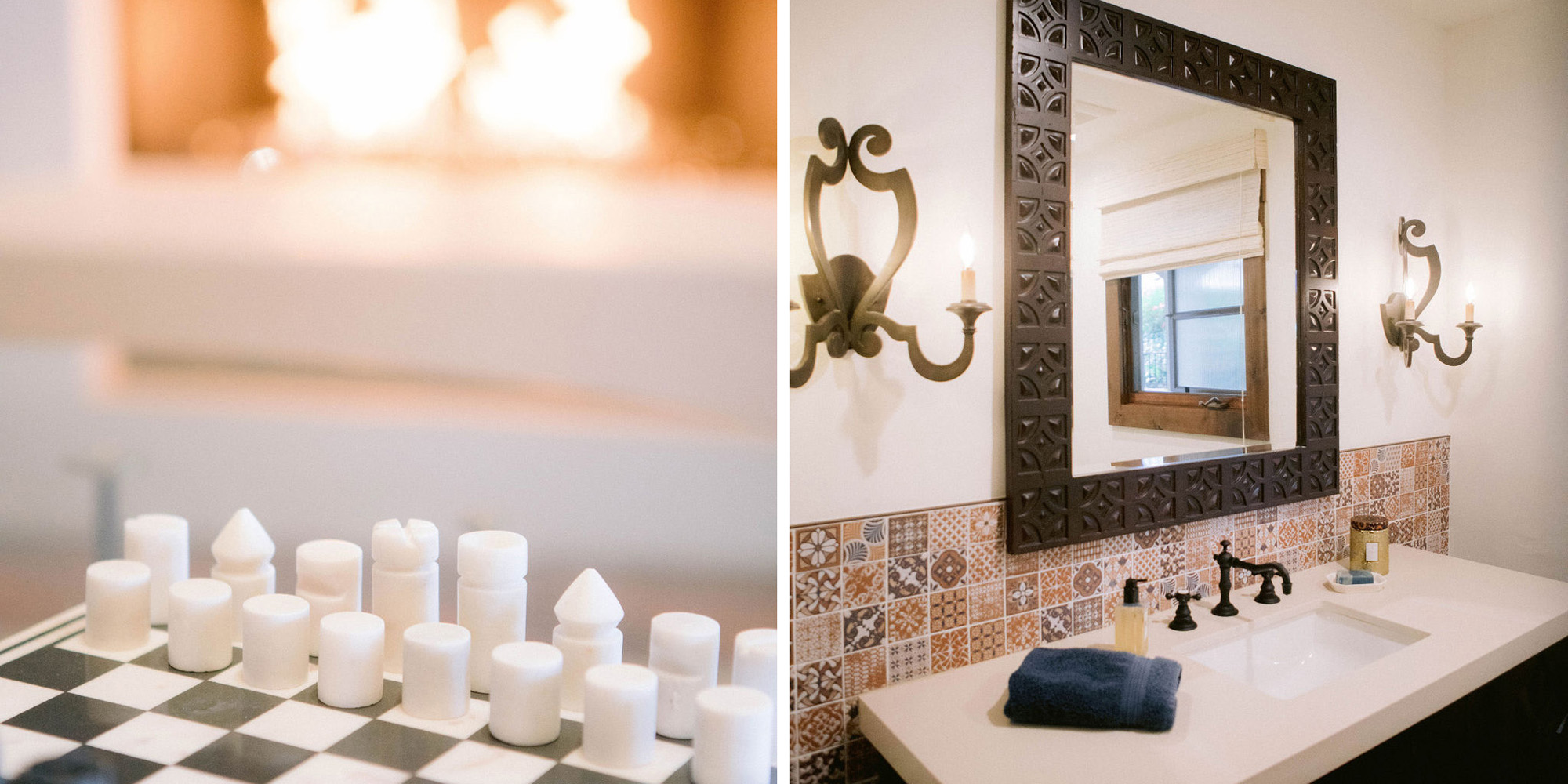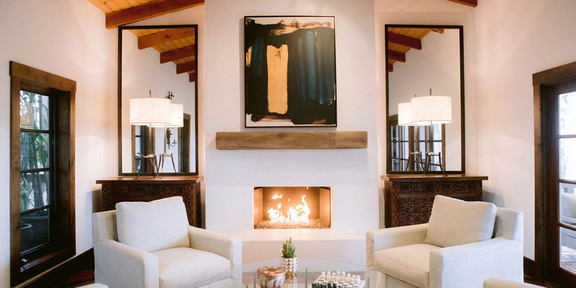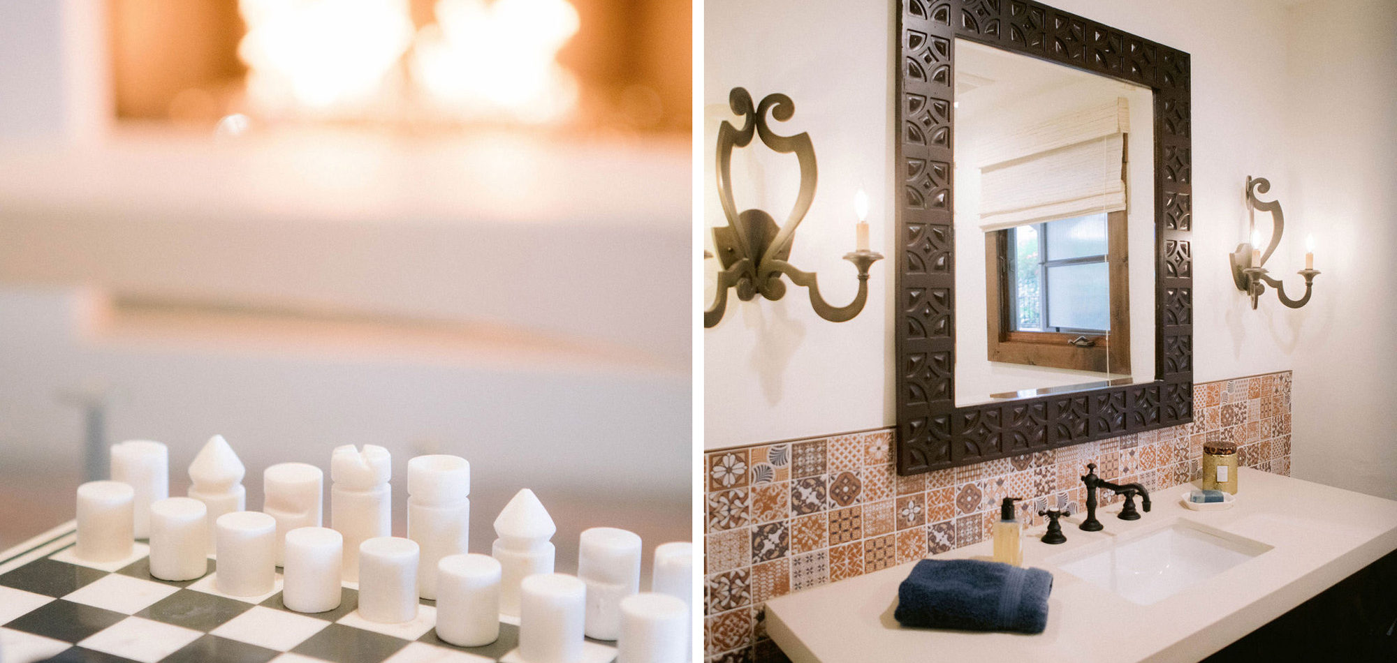 What a joy to work on this home with this fabulous couple and their two dogs. The executive couple who was downsizing wanted to have a new updated look in keeping with the integrity of their Spanish-style home. We wanted to bring in as much charm and interest to the spaces as reflected by its inhabitants. Some of the features, such as the Saltillo tile was to stay. We worked to modernize the home, keeping its best elements while producing a modernized vibe. The first challenge was situating a pool table in what was before the living room and was now the game room. Because this was the first room you see when you enter the home it was imperative to make it look like it was a planned addition. A custom light for over the pool table was designed to create a moody atmosphere. We replaced the brick on the outdated floor-to-ceiling fireplace with a neutral plaster and changed the log insert to glass. Then flanked the fireplace with two custom chests and added four comfortable swivel chairs for a perfect lounging area. The artwork really brought the space together blending sophistication and fun. The result is a warm and welcoming room.