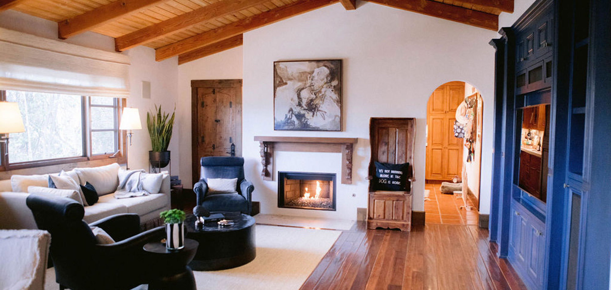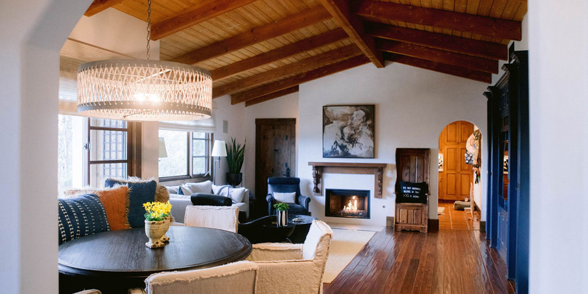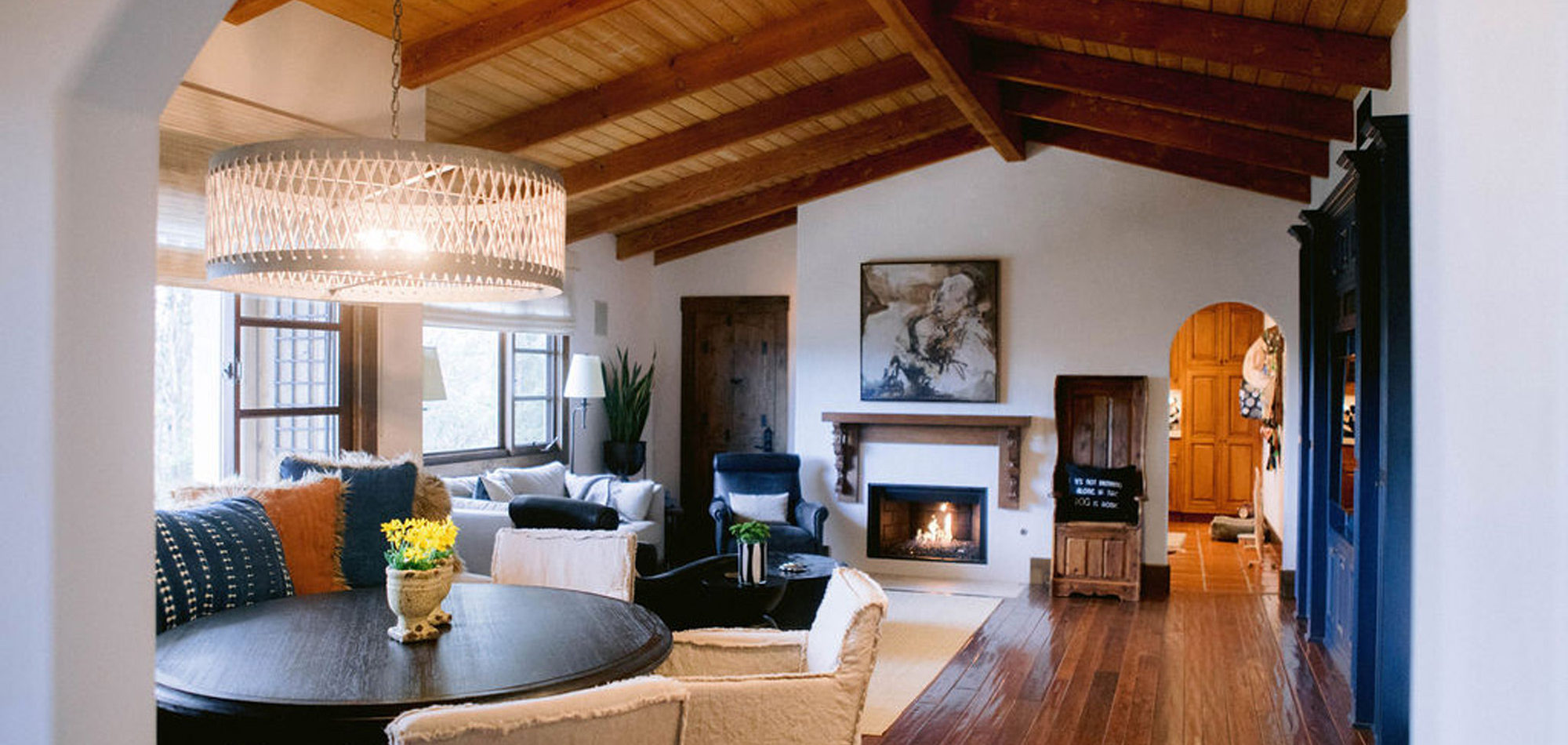 In the kitchen we retrofitted some of the cabinets. Then we painted the upper cabinets and distressed them for a new look and yet they looked like they had always been there. A honed countertop and Walker Zanger backsplash were chosen to add personality to the space. In the adjacent eating area, we removed a half wall to combine the room with the family room. A round table, bench with pillows from Cozy Nomad, and comfortable slipcovered chairs add to the welcoming feel. Another distinctive fireplace overhaul happened in the family room. We found some antique Spanish-inspired corbels and designed a custom mantle, topping it with an interesting piece of contemporary art. The wall unit was painted to update. The comfortable and stylish furniture setting allowed for two focal points and gave an updated modern look to the room.