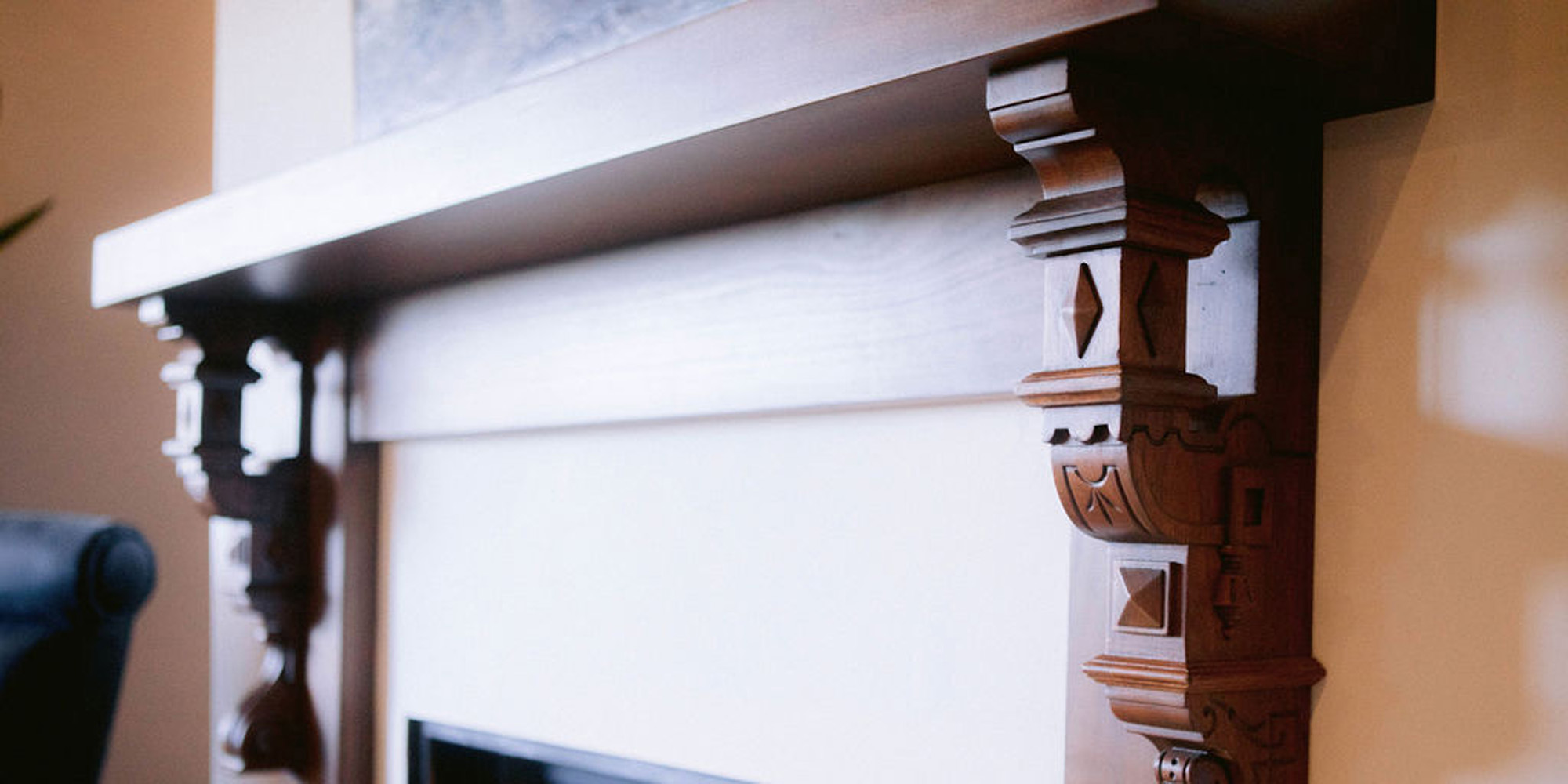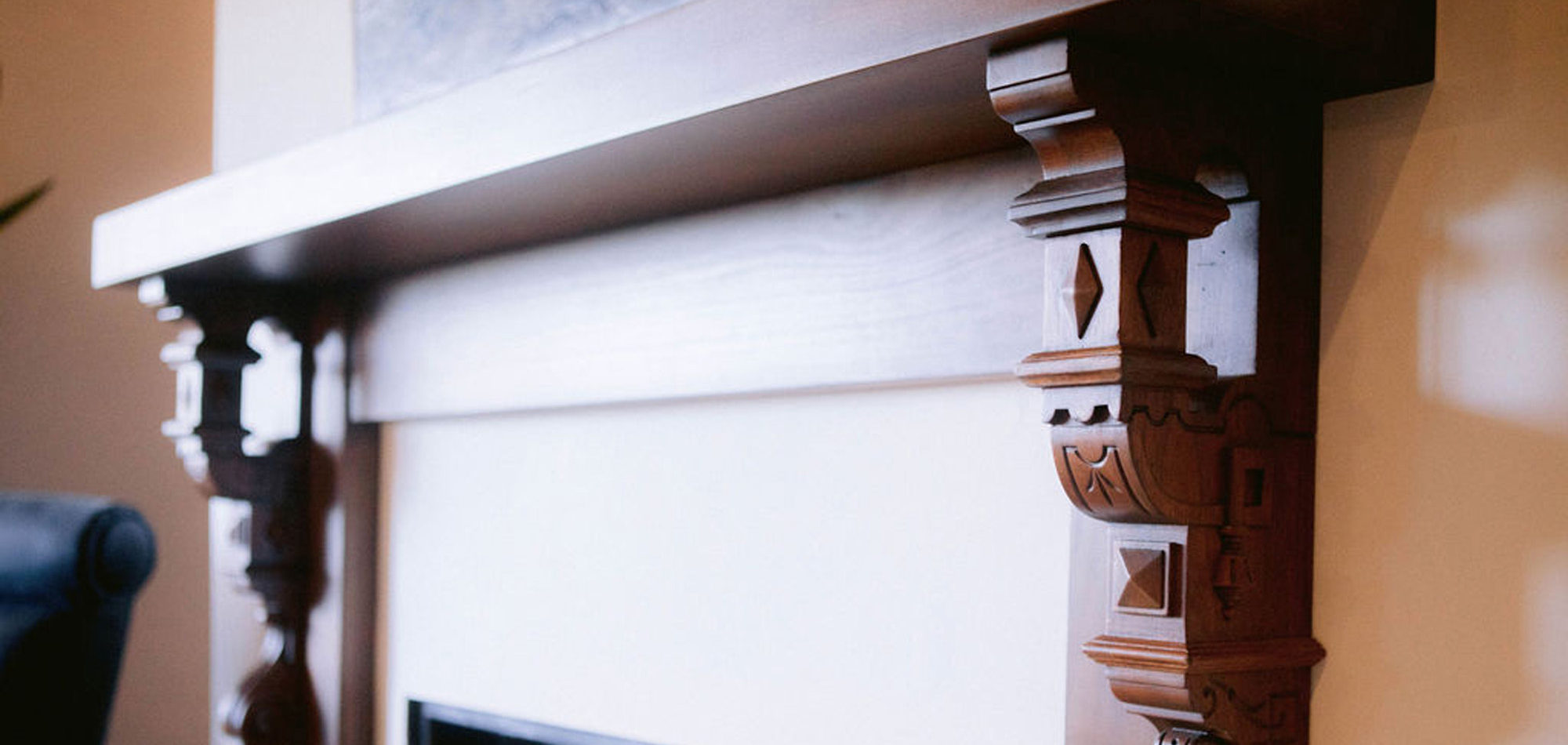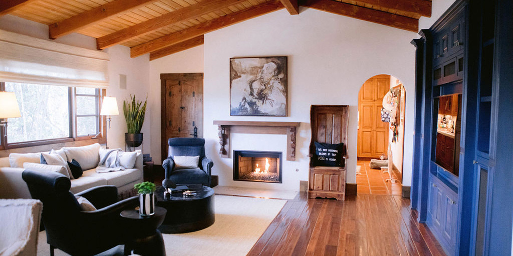 In the kitchen we retrofitted some of the cabinets. Then we painted the upper cabinets and distressed them for a new look and yet they looked like they had always been there. A honed countertop and Walker Zanger backsplash were chosen to add personality to the space. In the adjacent eating area, we removed a half wall to combine the room with the family room. A round table, bench with pillows from Cozy Nomad, and comfortable slipcovered chairs add to the welcoming feel. Another distinctive fireplace overhaul happened in the family room. We found some antique Spanish-inspired corbels and designed a custom mantle, topping it with an interesting piece of contemporary art. The wall unit was painted to update. The comfortable and stylish furniture setting allowed for two focal points and gave an updated modern look to the room.