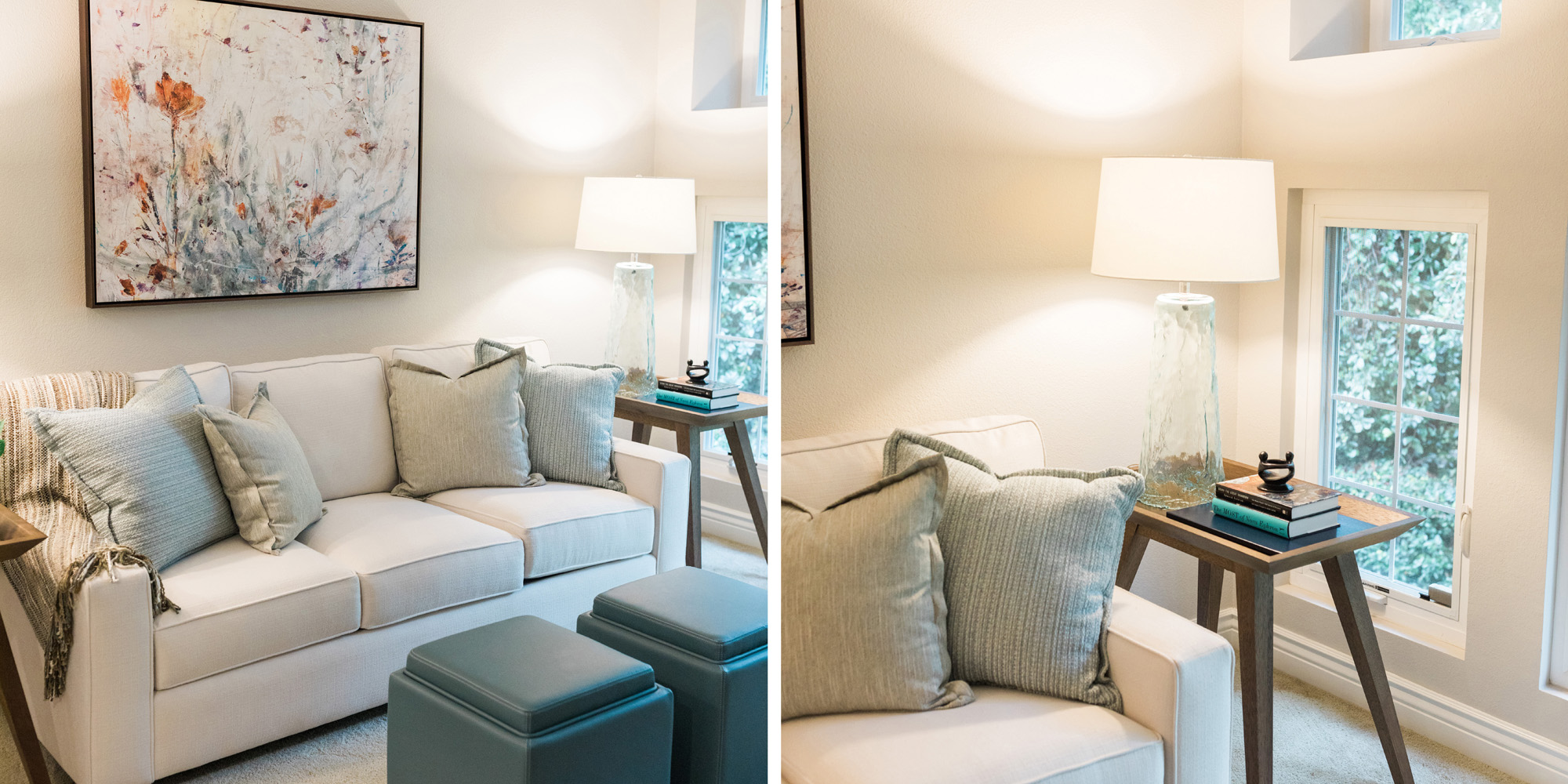 Our clients were a referral who wanted to give their homes an updated look. They asked us to be mindful of cost and requested we keep the existing kitchen cabinets and stone flooring where laid. We selected a new carpet, paint throughout, a new countertop, and cabinet hardware. As with all our clients, we listened carefully to how they like to use the rooms. We worked to understand their design preferences while guiding them to choose the best pieces suited to their tastes and budget. New furniture was required and a do away with pieces from early in their marriage. They wanted a grown-up feel that was still family-friendly. The couple, with two small children, entertain other young families so it was important that the selected pieces be both durable and comfortable.