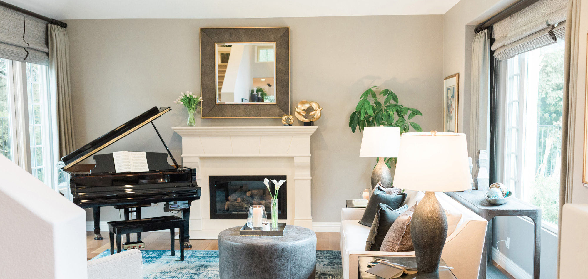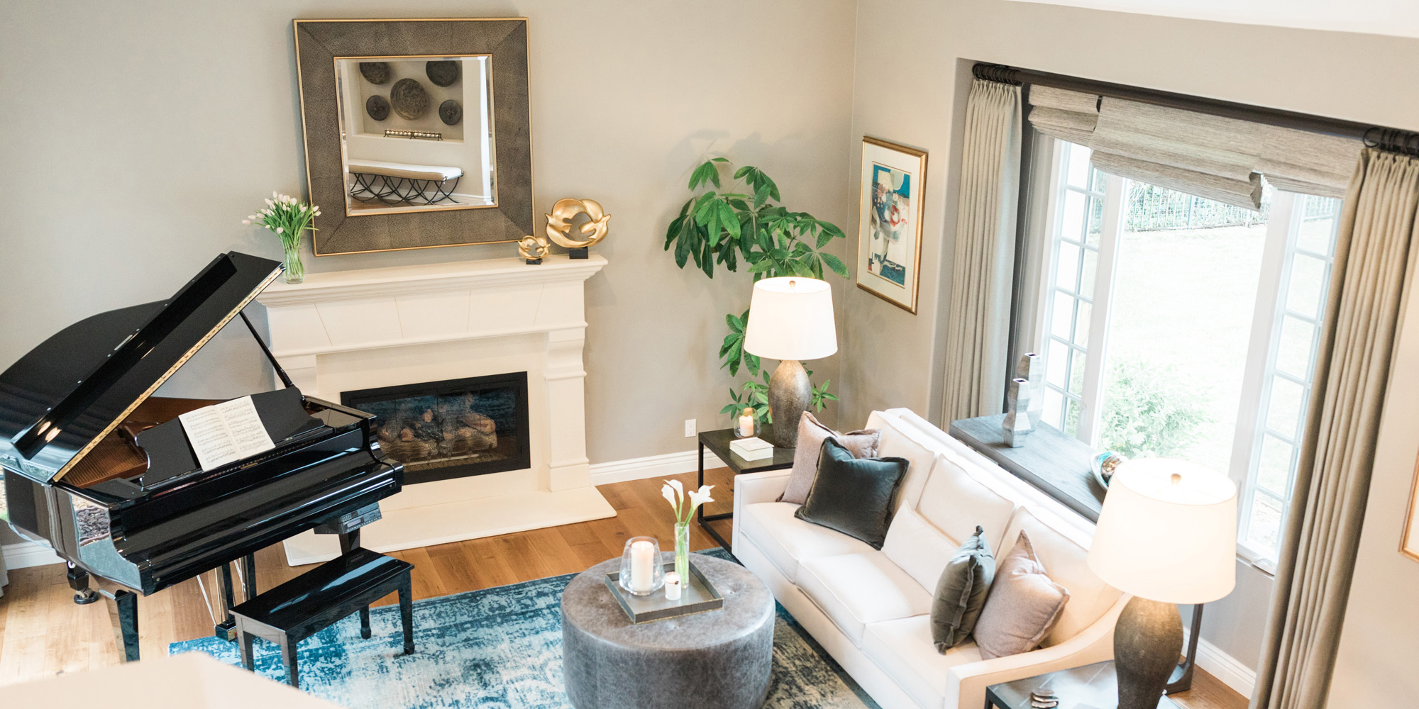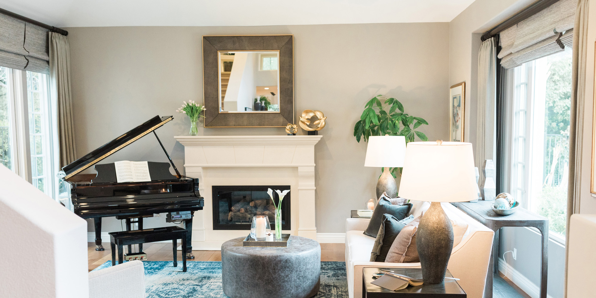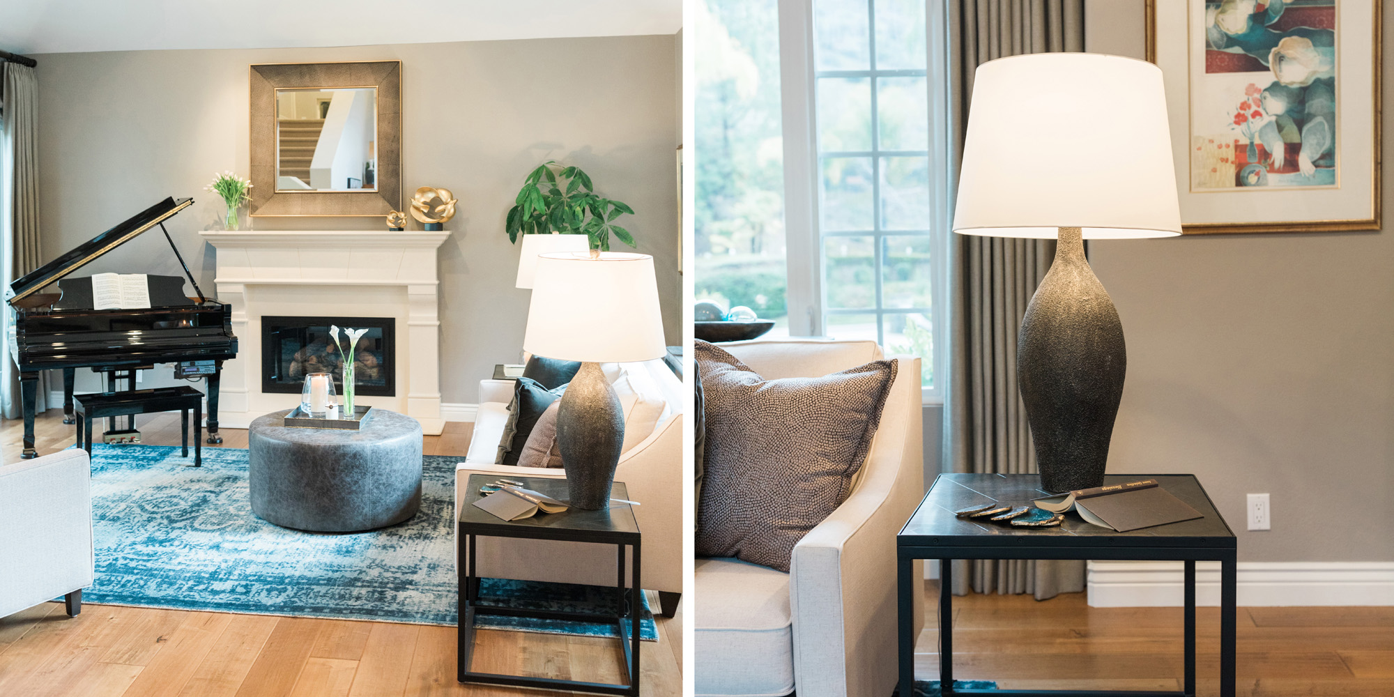 There was a large niche in the foyer that required a point of interest. A piece of art seemed too predictable, so we recommended a collection of handmade bowls. The couple agreed it felt like treasured pieces from their travels. The living room housed a baby grand piano, and it was important to consider the location to protect it from light and a furniture arrangement to compliment and provide ample seating. The room is now elegant yet welcoming.