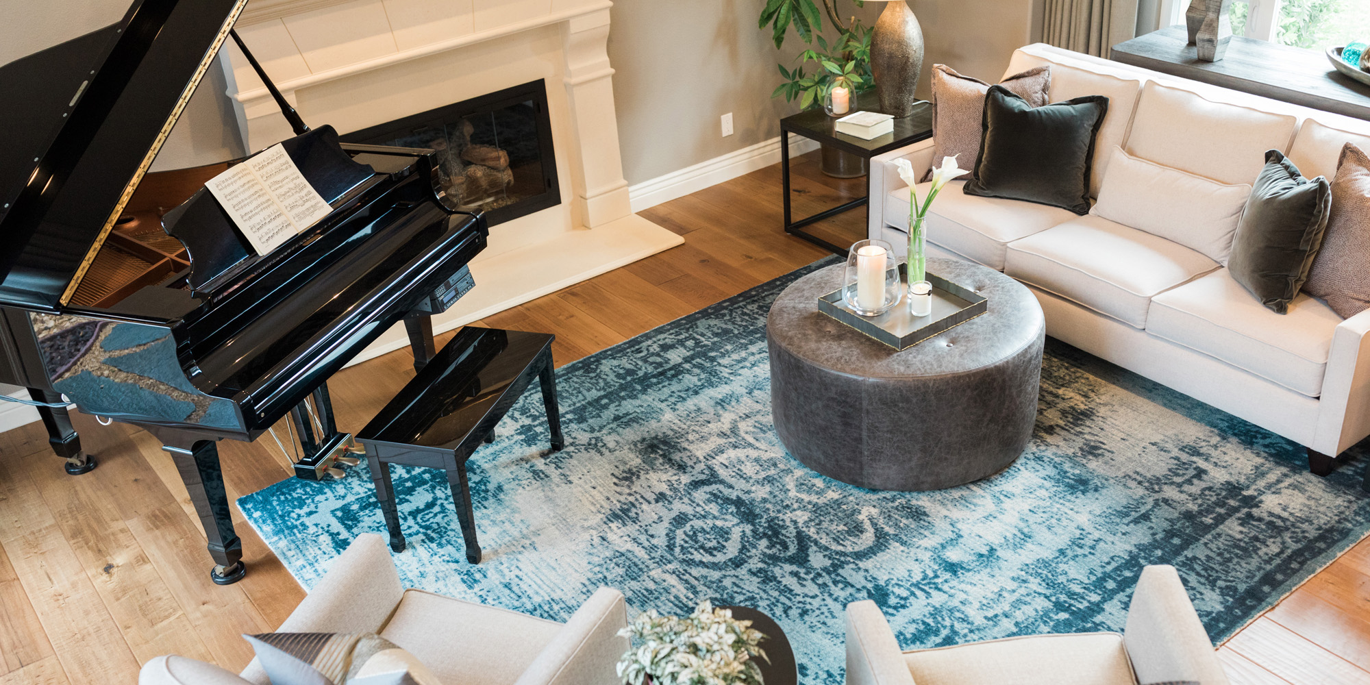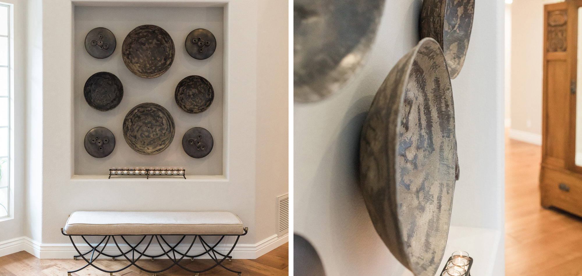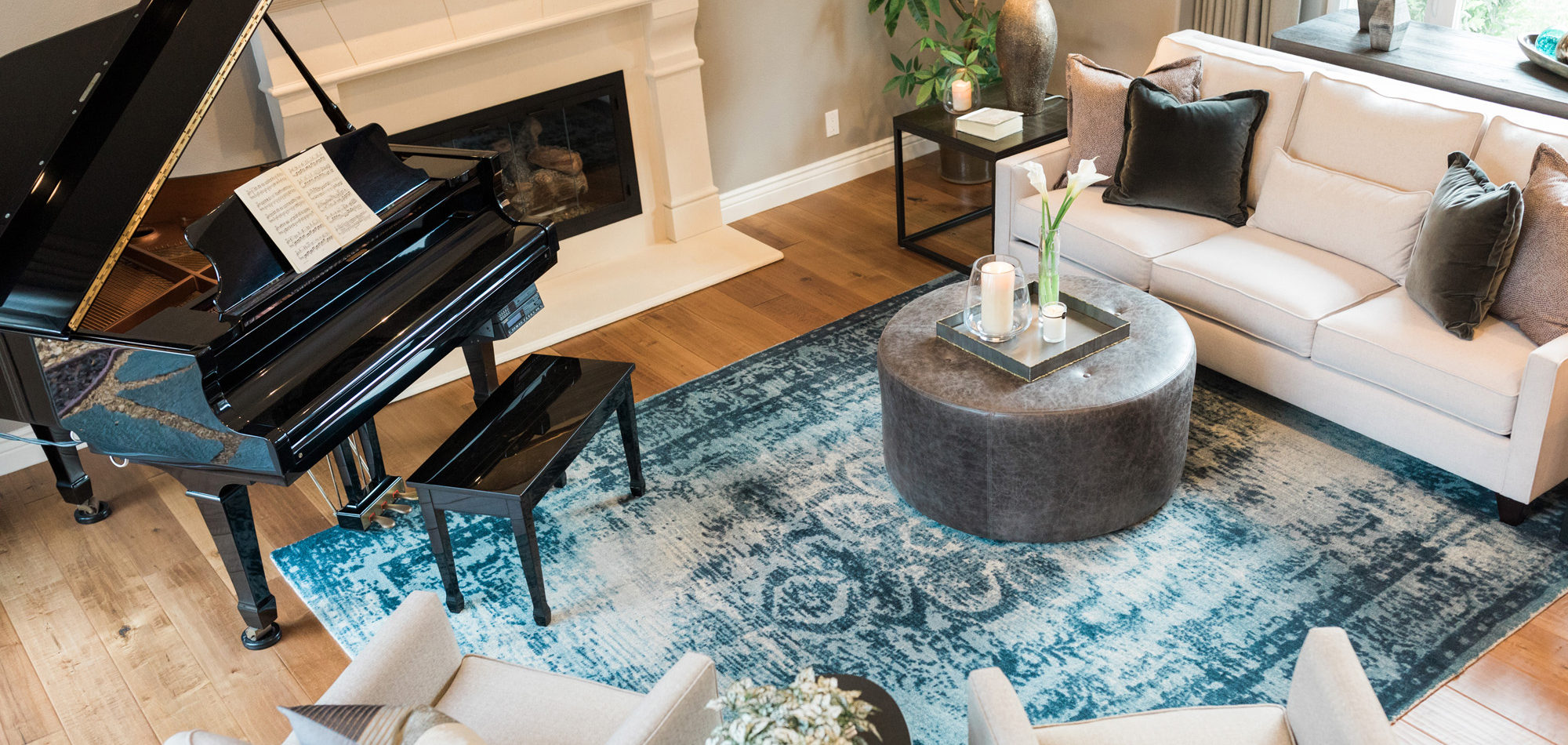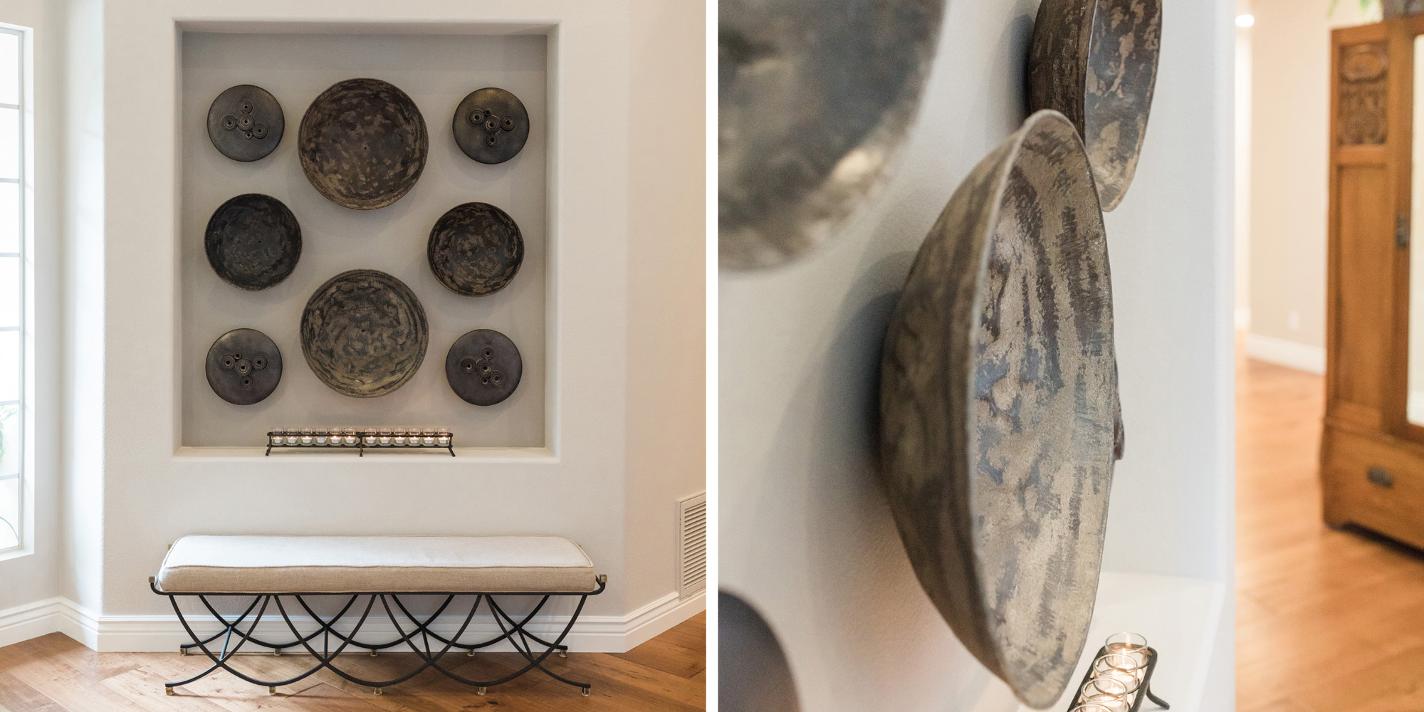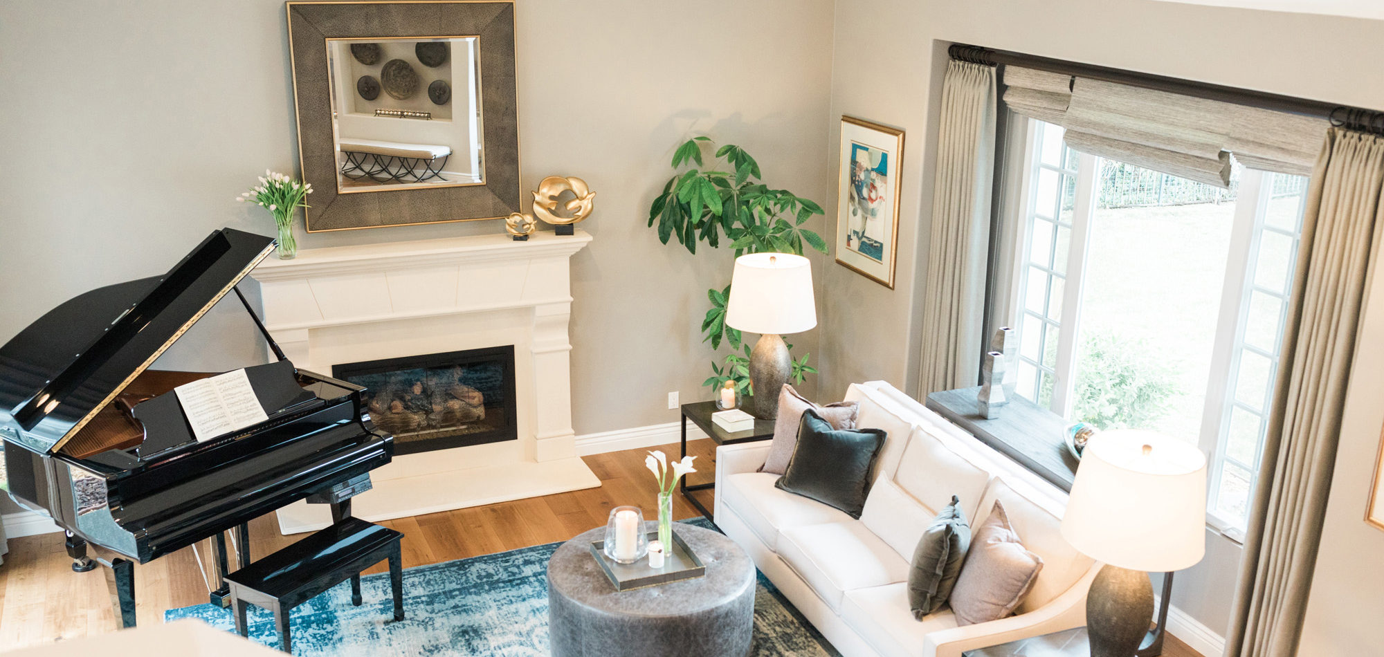 There was a large niche in the foyer that required a point of interest. A piece of art seemed too predictable, so we recommended a collection of handmade bowls. The couple agreed it felt like treasured pieces from their travels. The living room housed a baby grand piano, and it was important to consider the location to protect it from light and a furniture arrangement to compliment and provide ample seating. The room is now elegant yet welcoming.